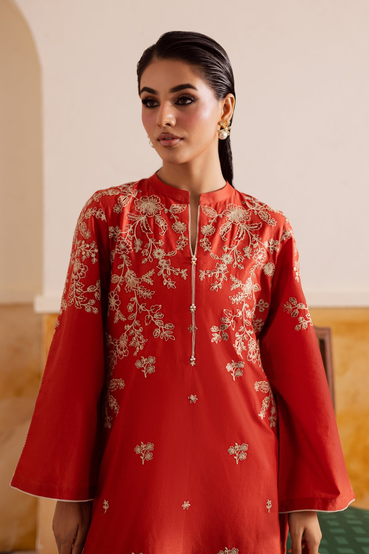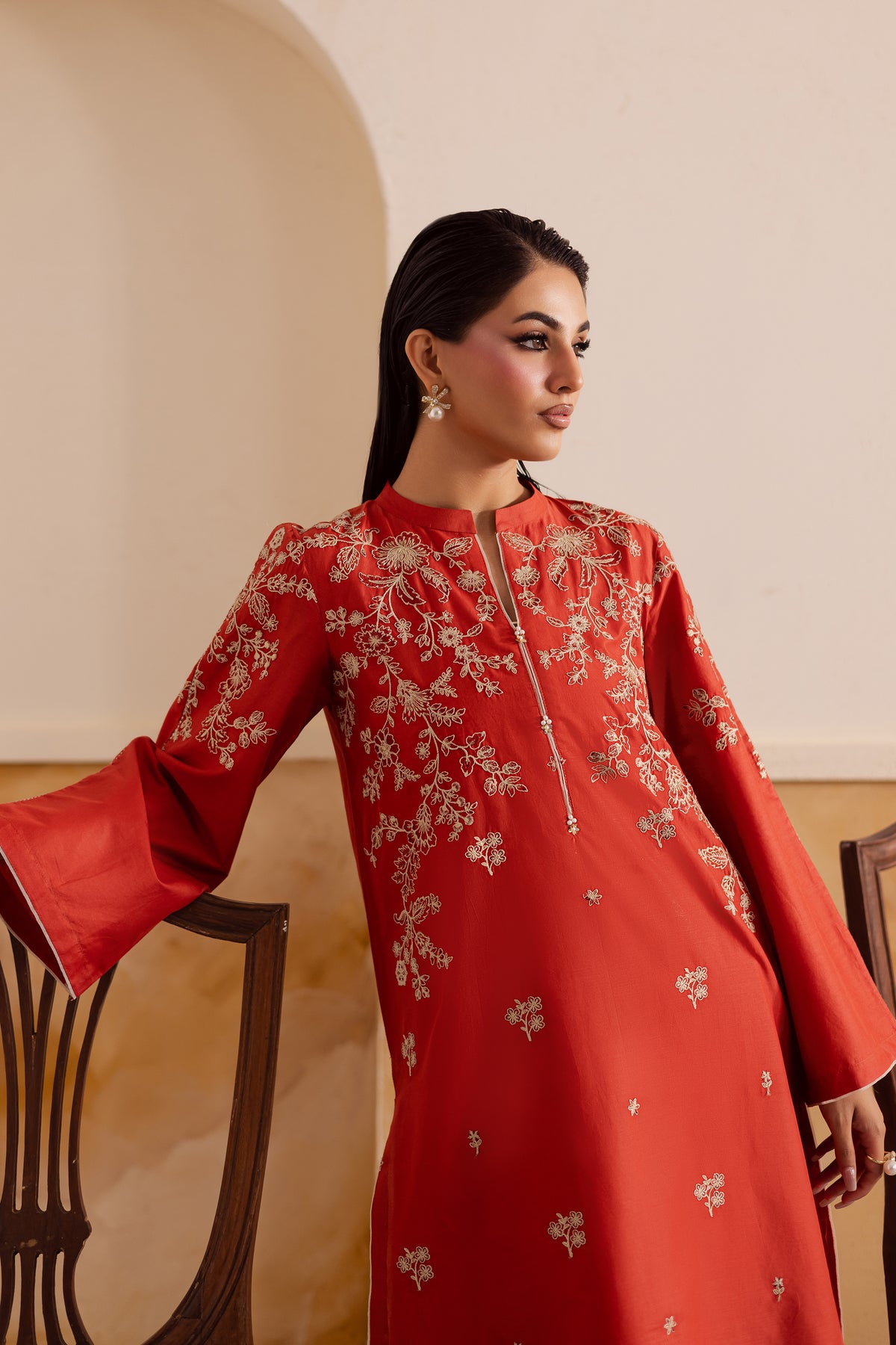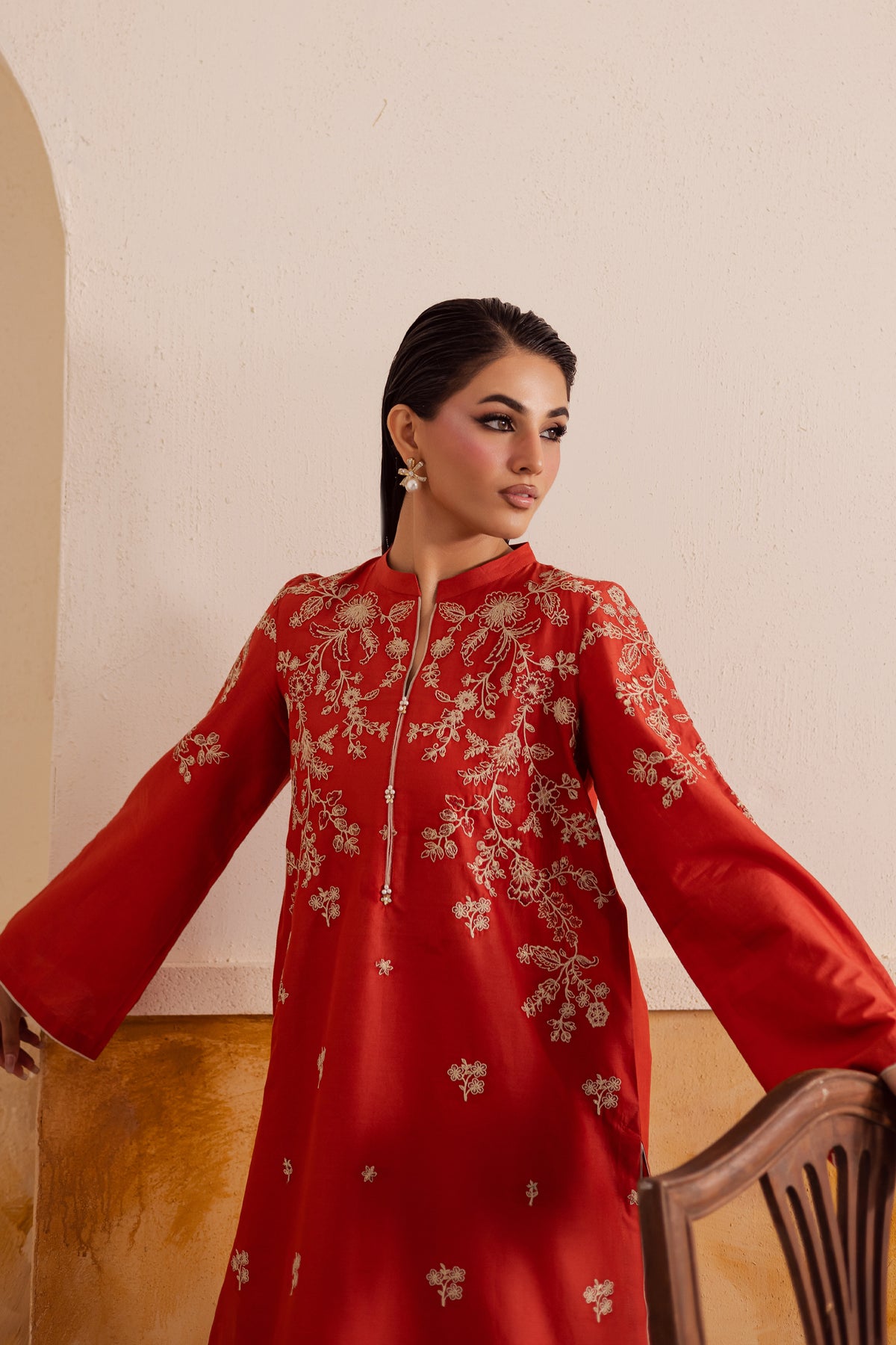 A short deep rust pima lawn shirt featuring composed front embroidery and a sleek band collar neckline accented with subtle piping echoing the sophisticated style seen in contemporary ban-collar designs. The flared sleeves are decorated with matching composed embroidery, giving the silhouette a graceful, feminine finish.