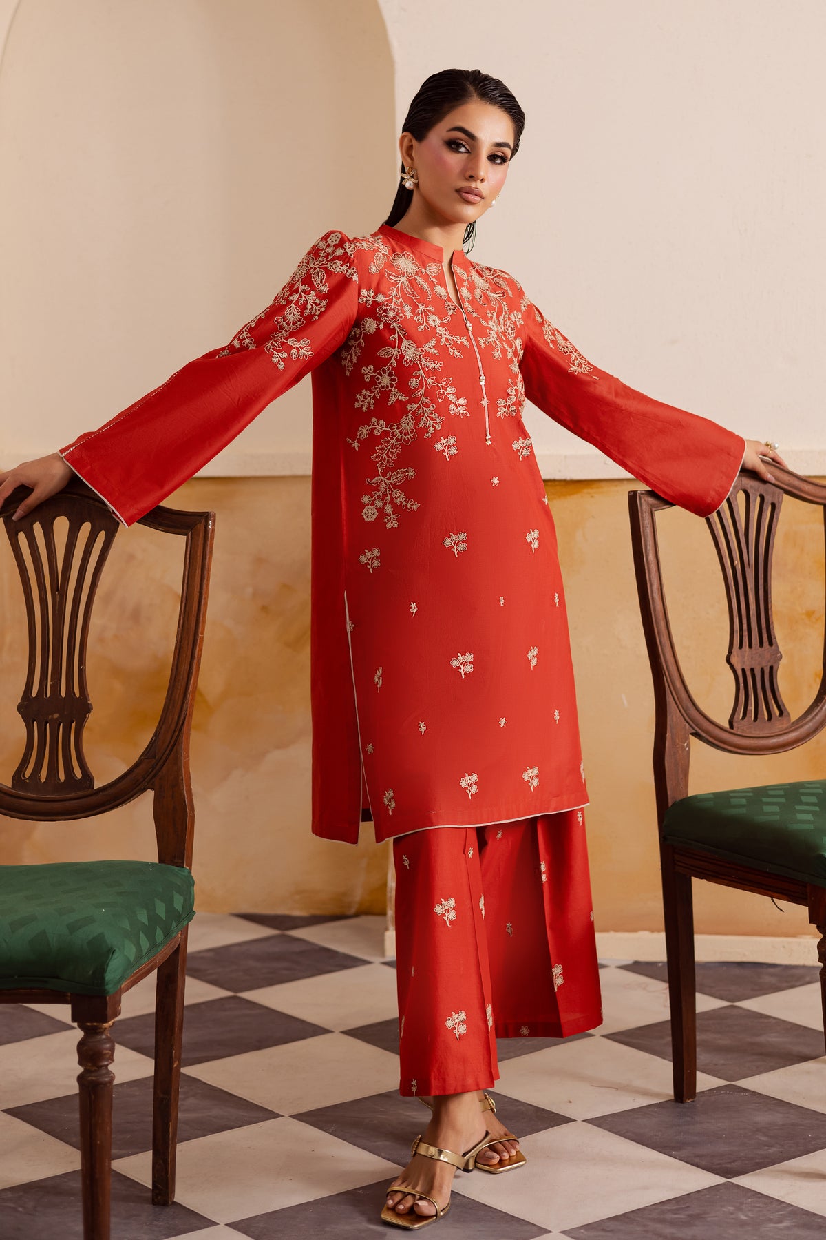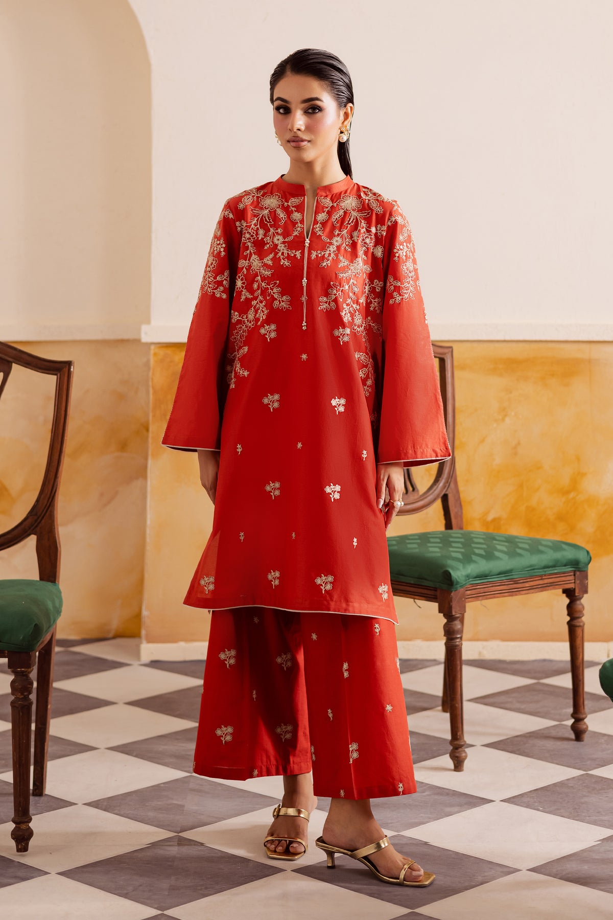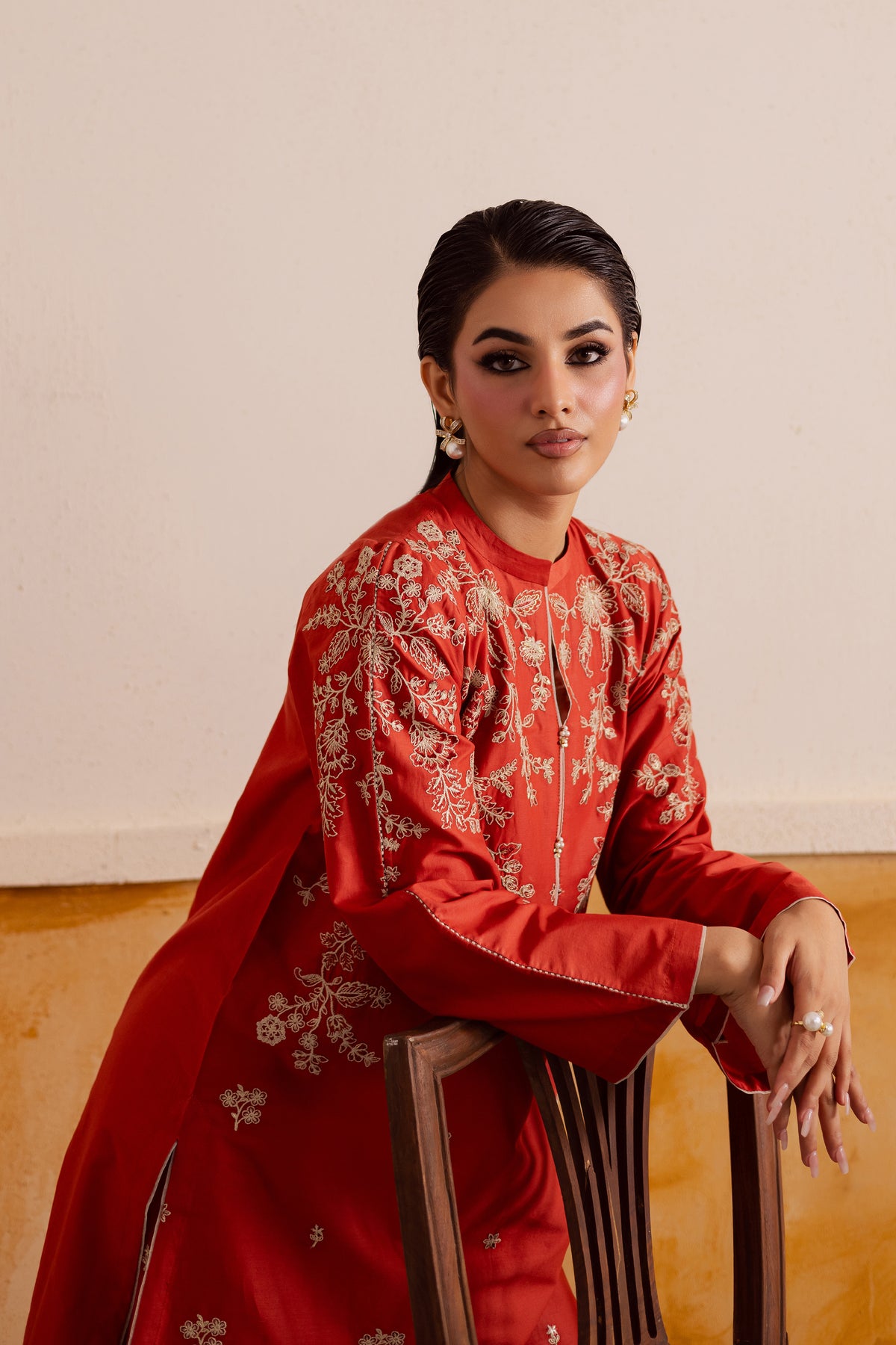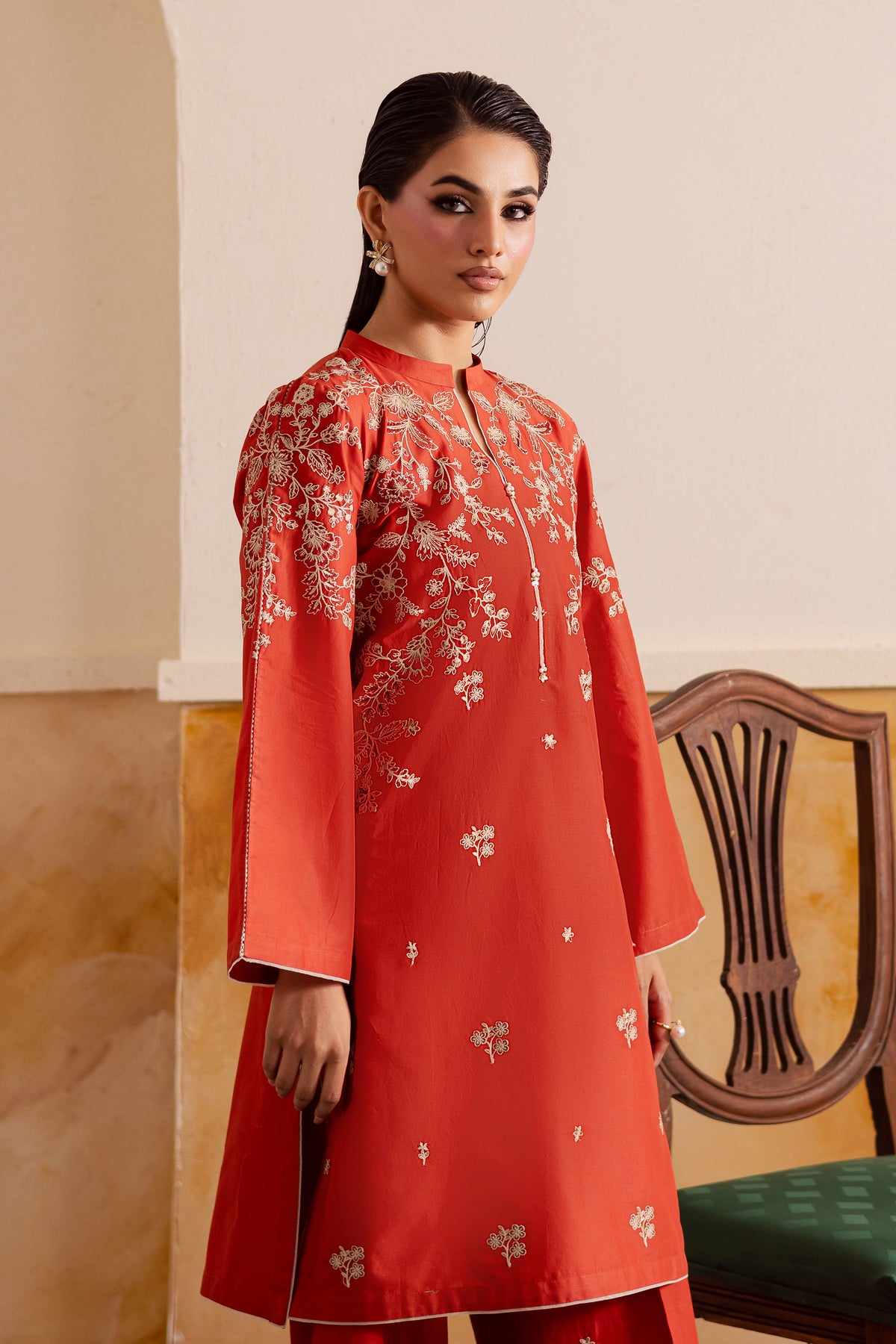 A short deep rust pima lawn shirt featuring composed front embroidery and a sleek band collar neckline accented with subtle piping echoing the sophisticated style seen in contemporary ban-collar designs. The flared sleeves are decorated with matching composed embroidery, giving the silhouette a graceful, feminine finish.