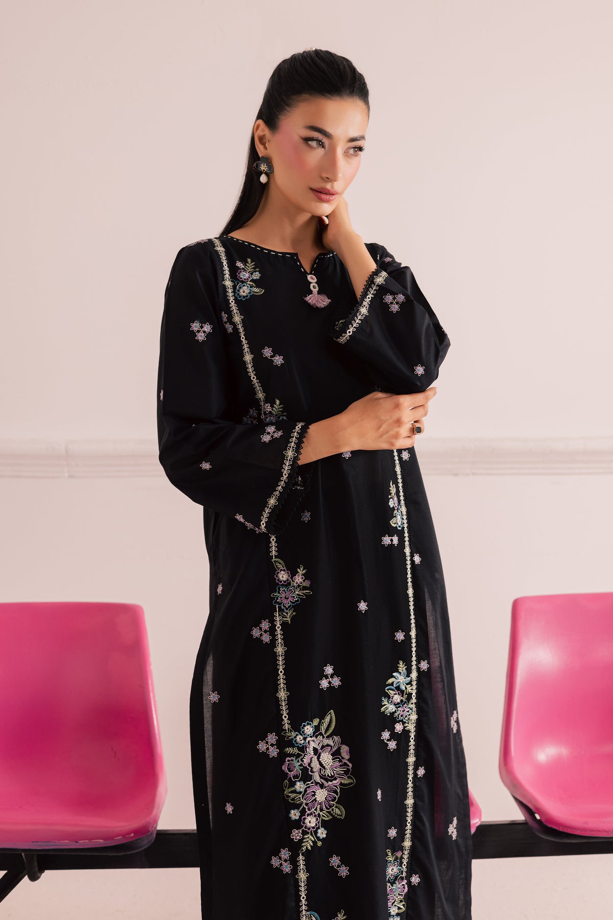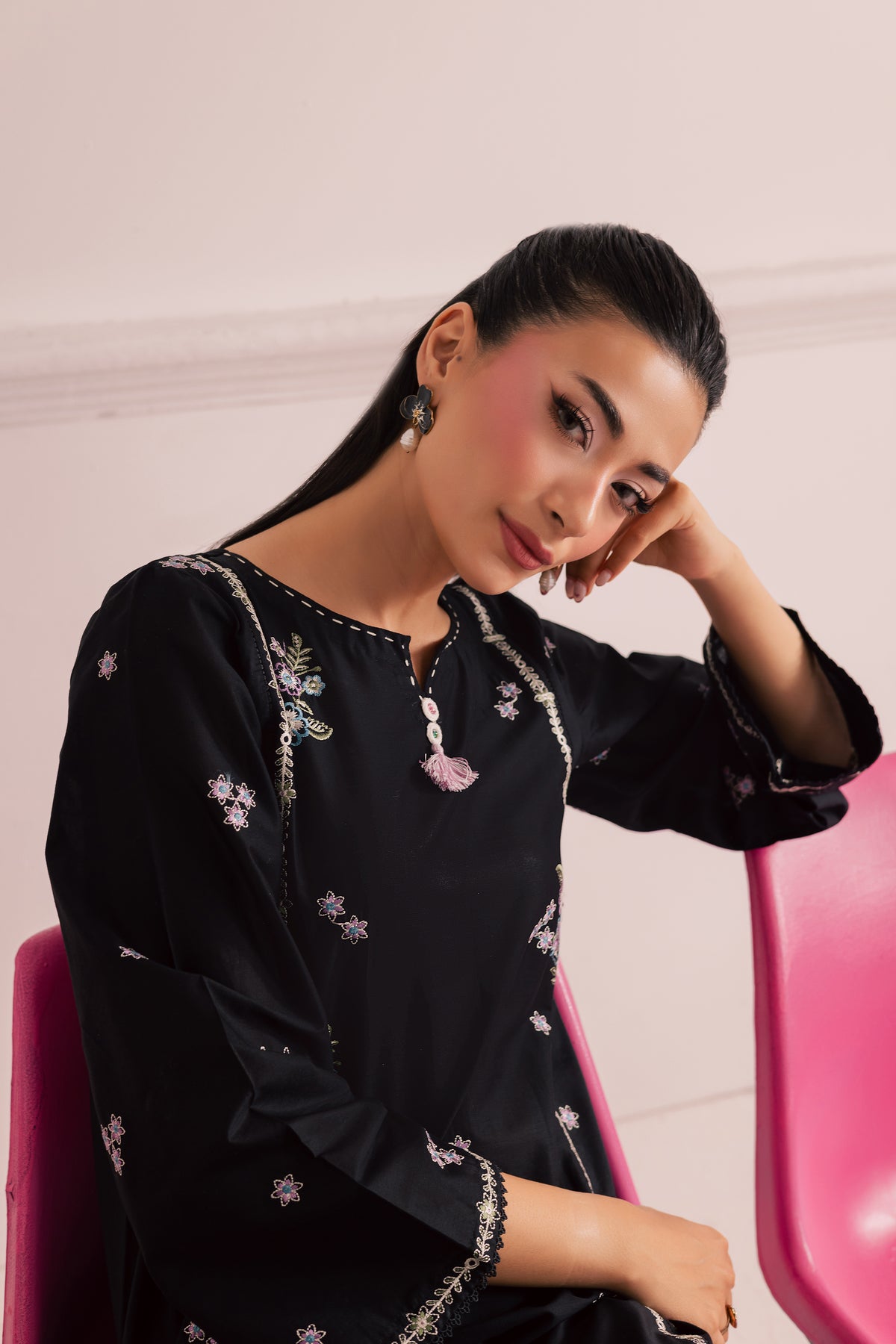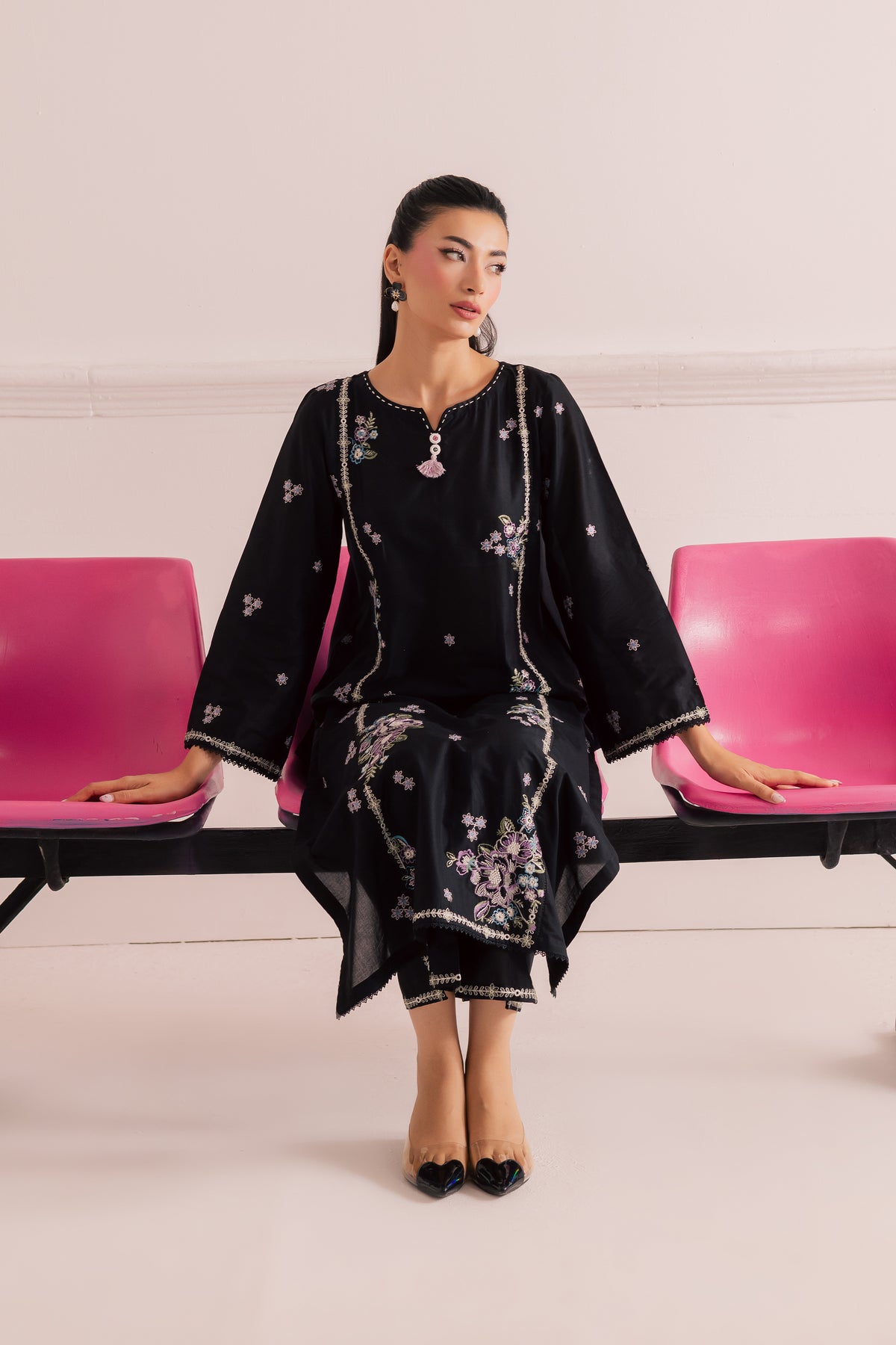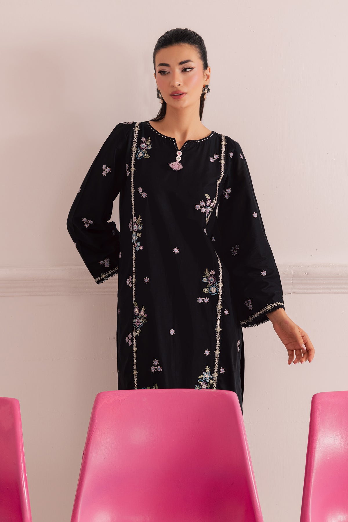 Elevate your everyday style with this panelled long black pima lawn shirt, featuring intricate embroidery and a tassel-finished neckline that adds a hint of playful elegance. The graceful silhouette flows effortlessly, combining structure with delicate detailing.