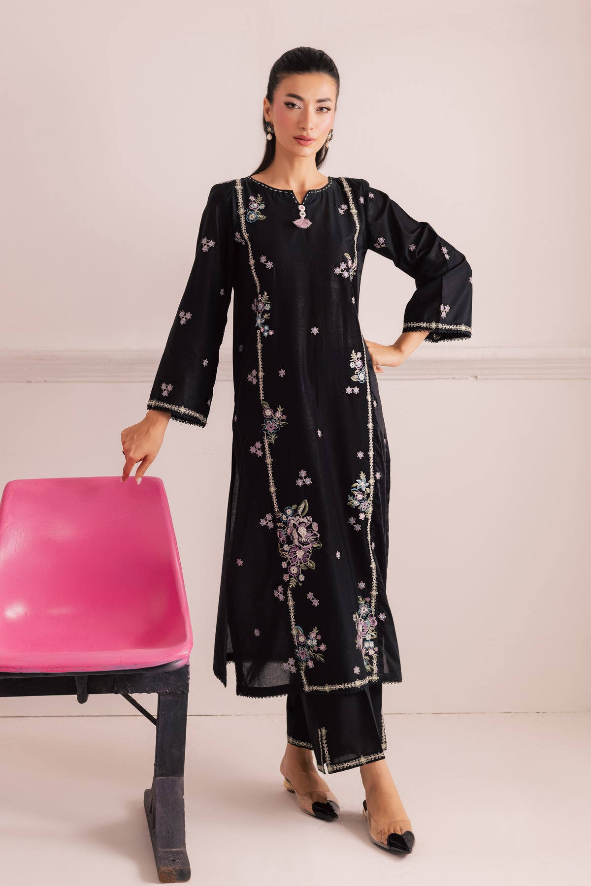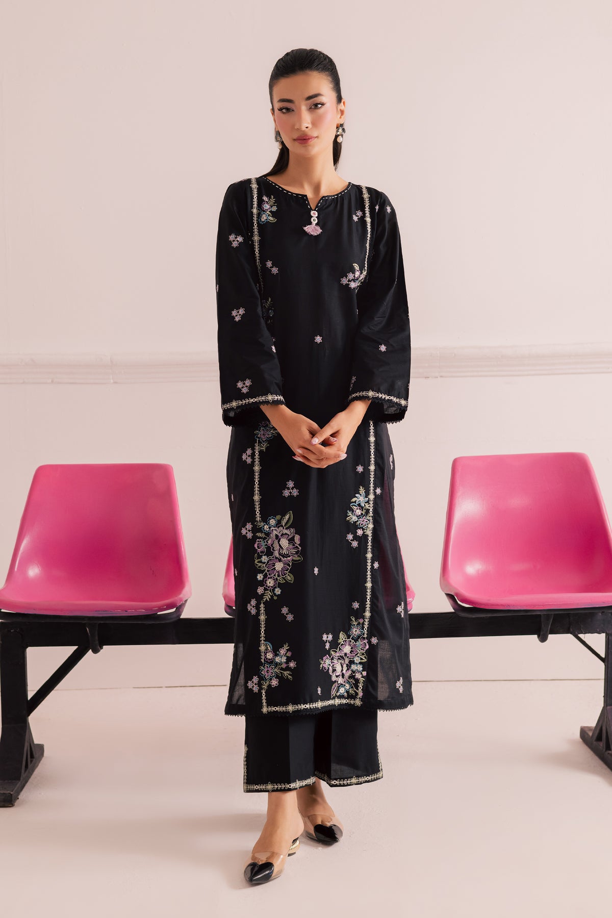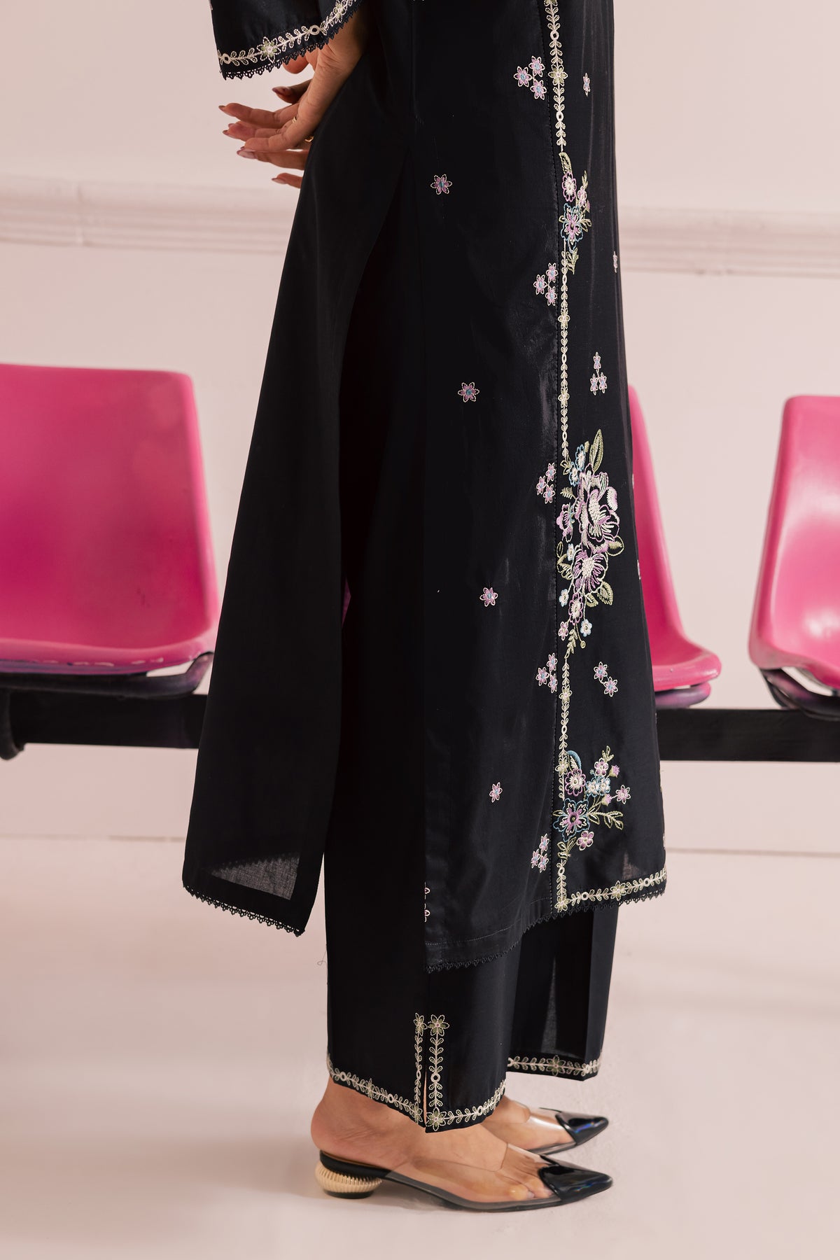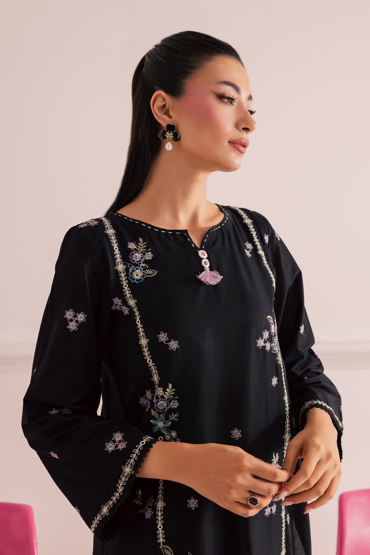 Elevate your everyday style with this panelled long black pima lawn shirt, featuring intricate embroidery and a tassel-finished neckline that adds a hint of playful elegance. The graceful silhouette flows effortlessly, combining structure with delicate detailing.