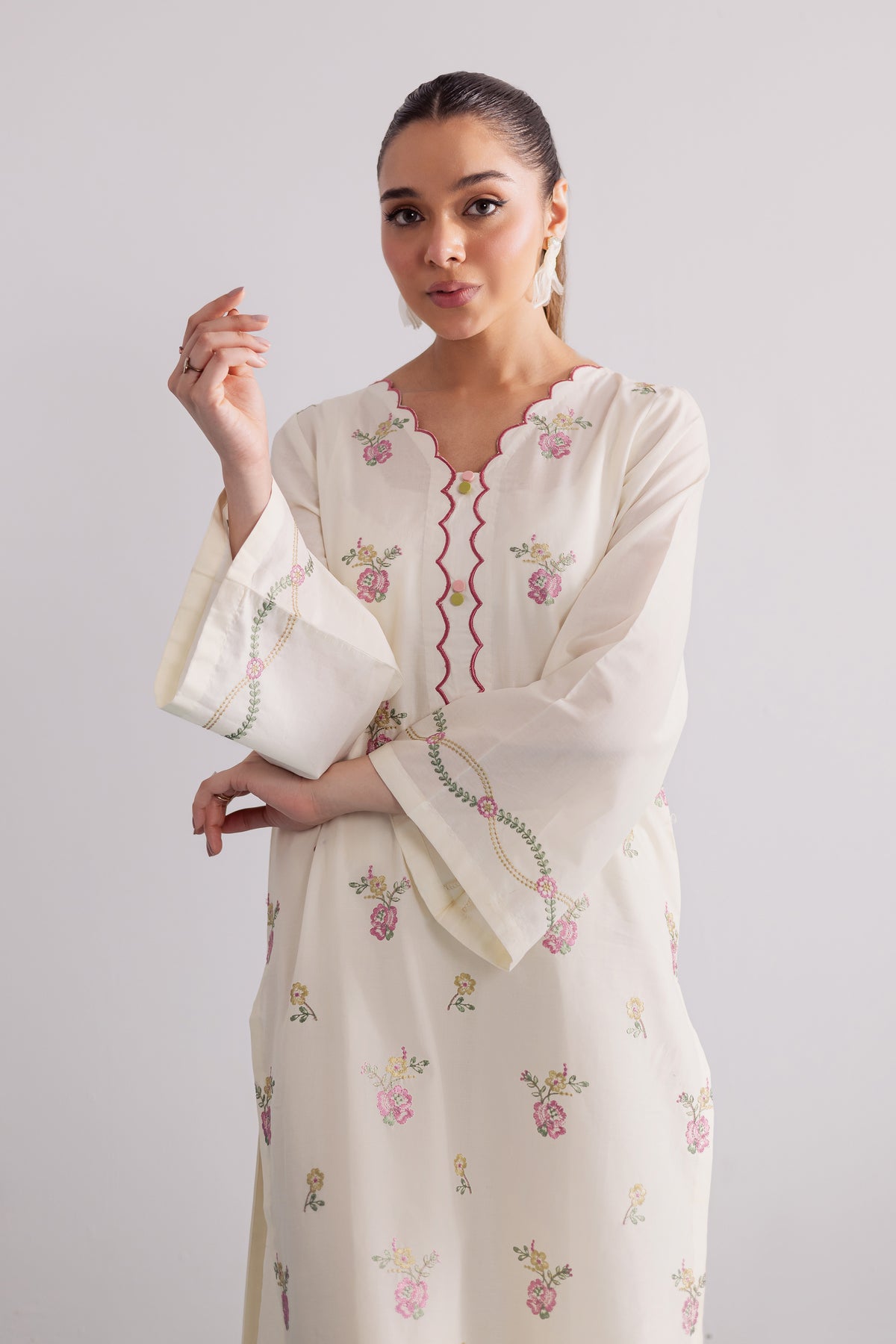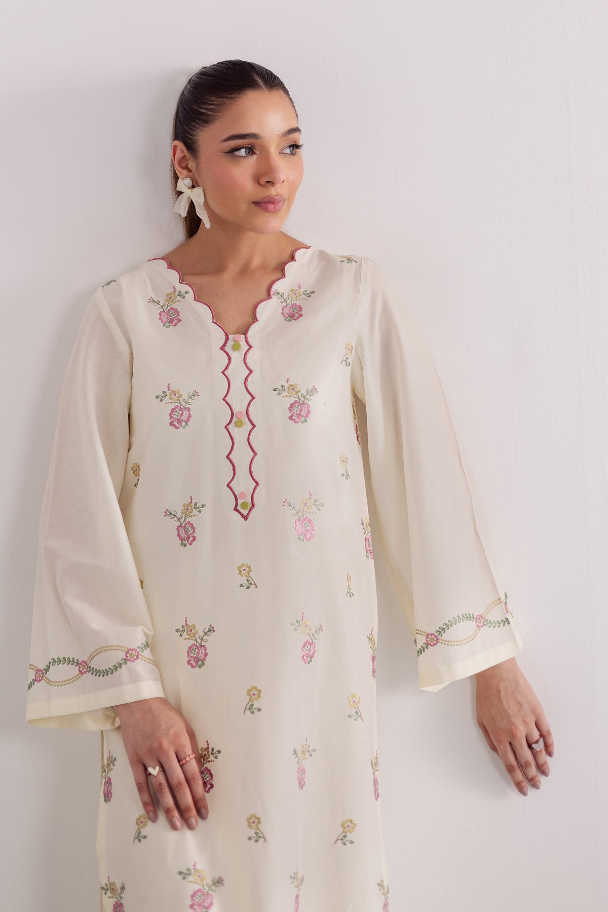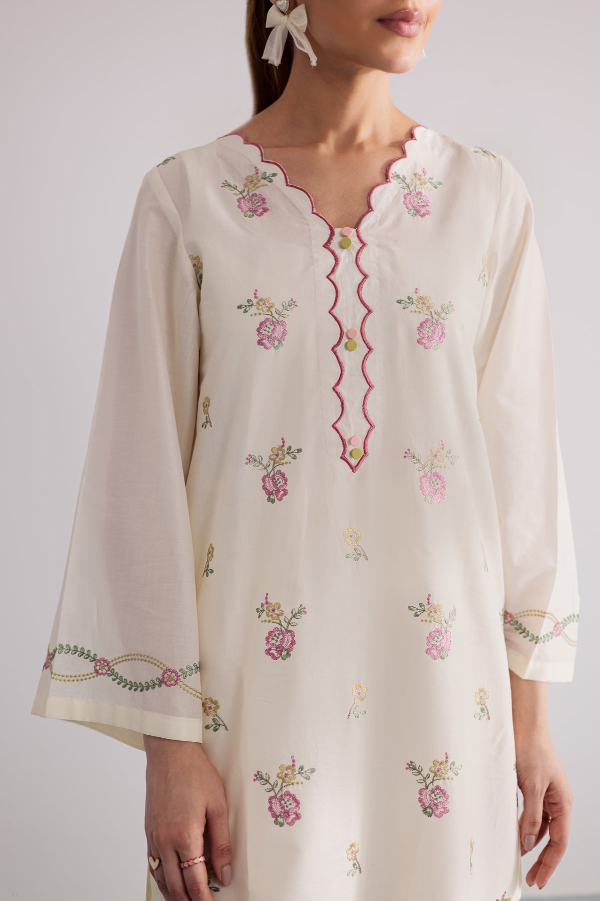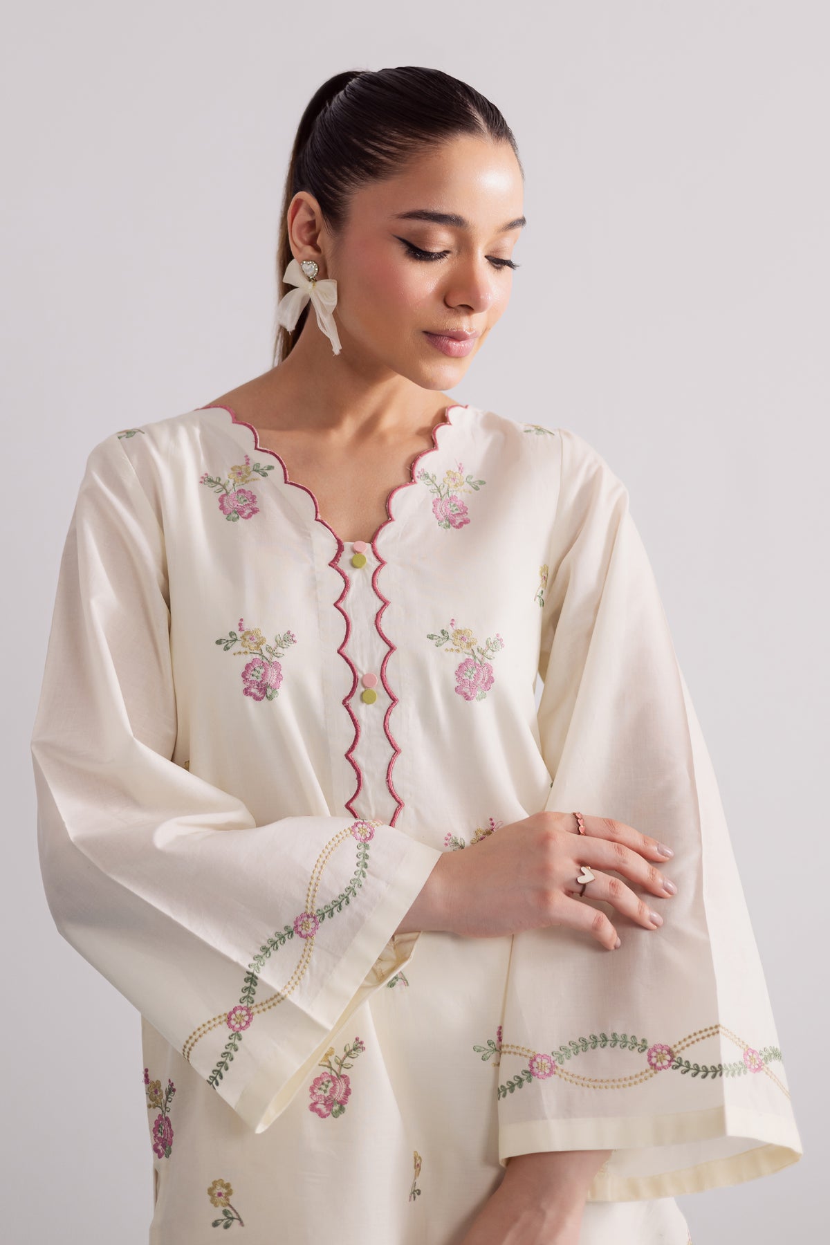 This crisp off-white pima lawn co-ord set is thoughtfully designed for effortless style and everyday elegance. The shirt showcases delicate pink floral embroidery across the sleeve hems, adding a soft, feminine charm to the minimal silhouette. Cut in a relaxed fit, it blends comfort with understated grace, perfect for casual sophistication.