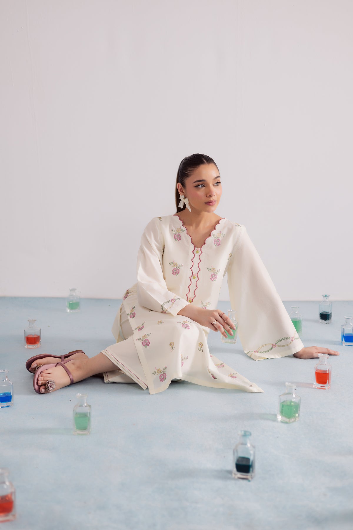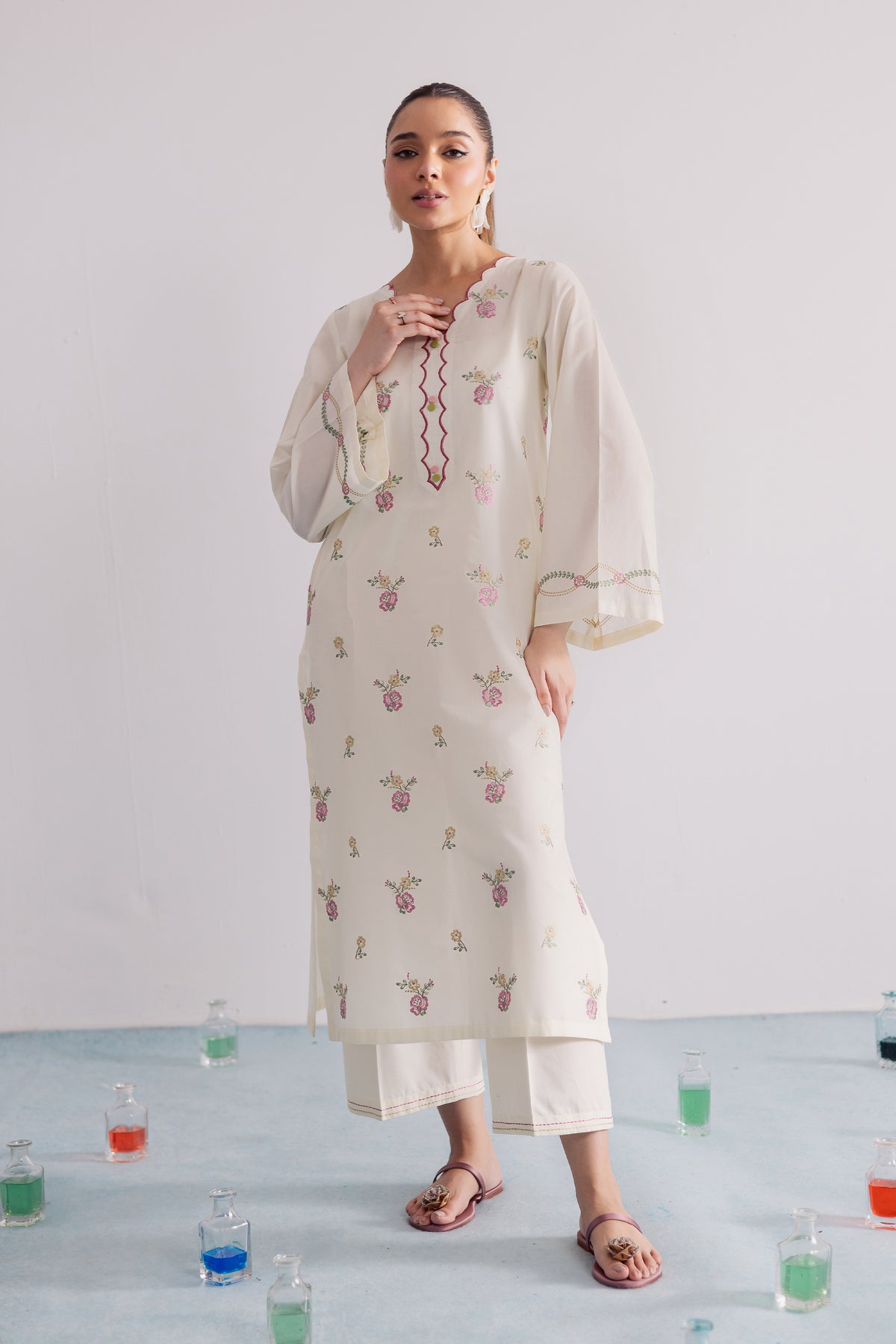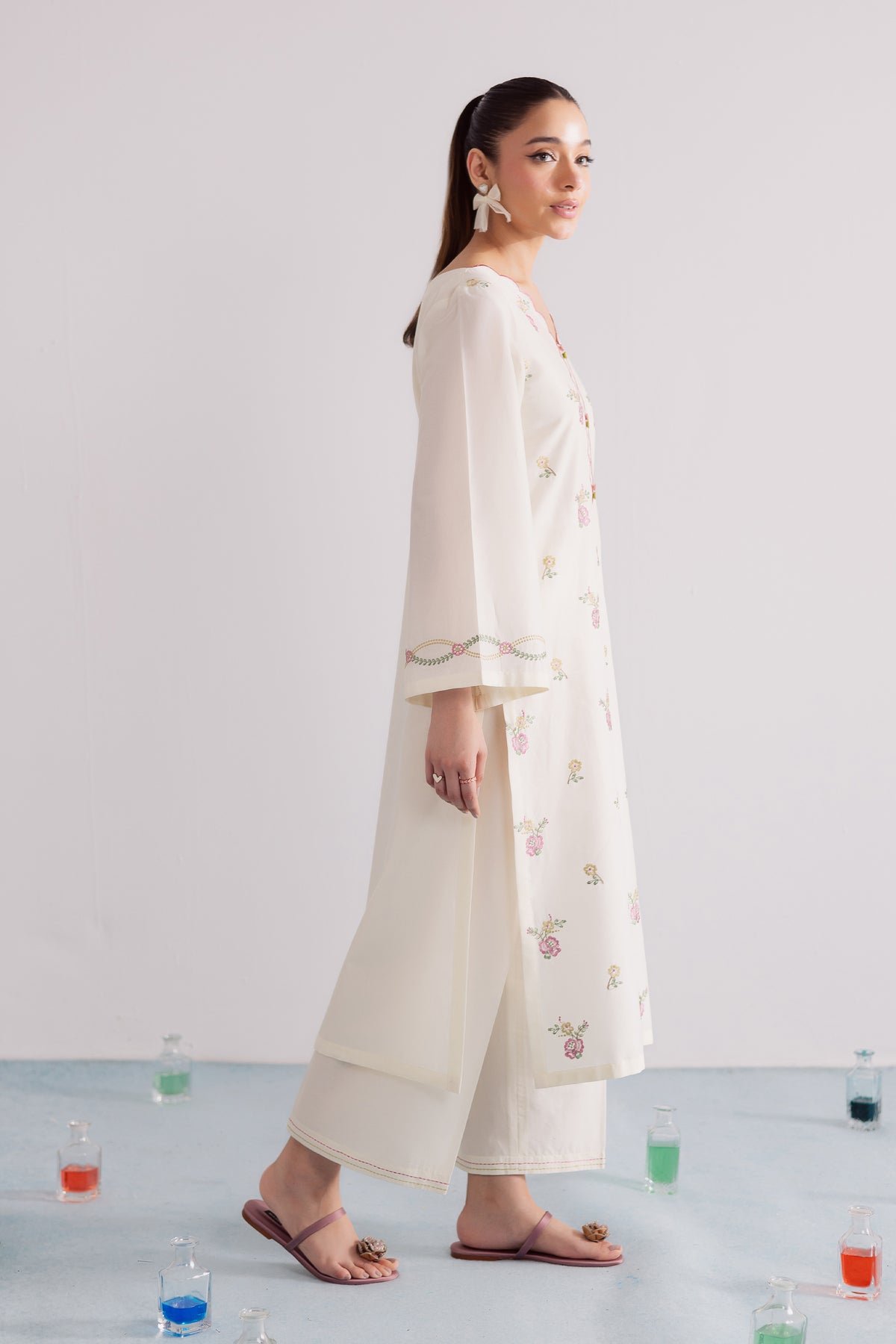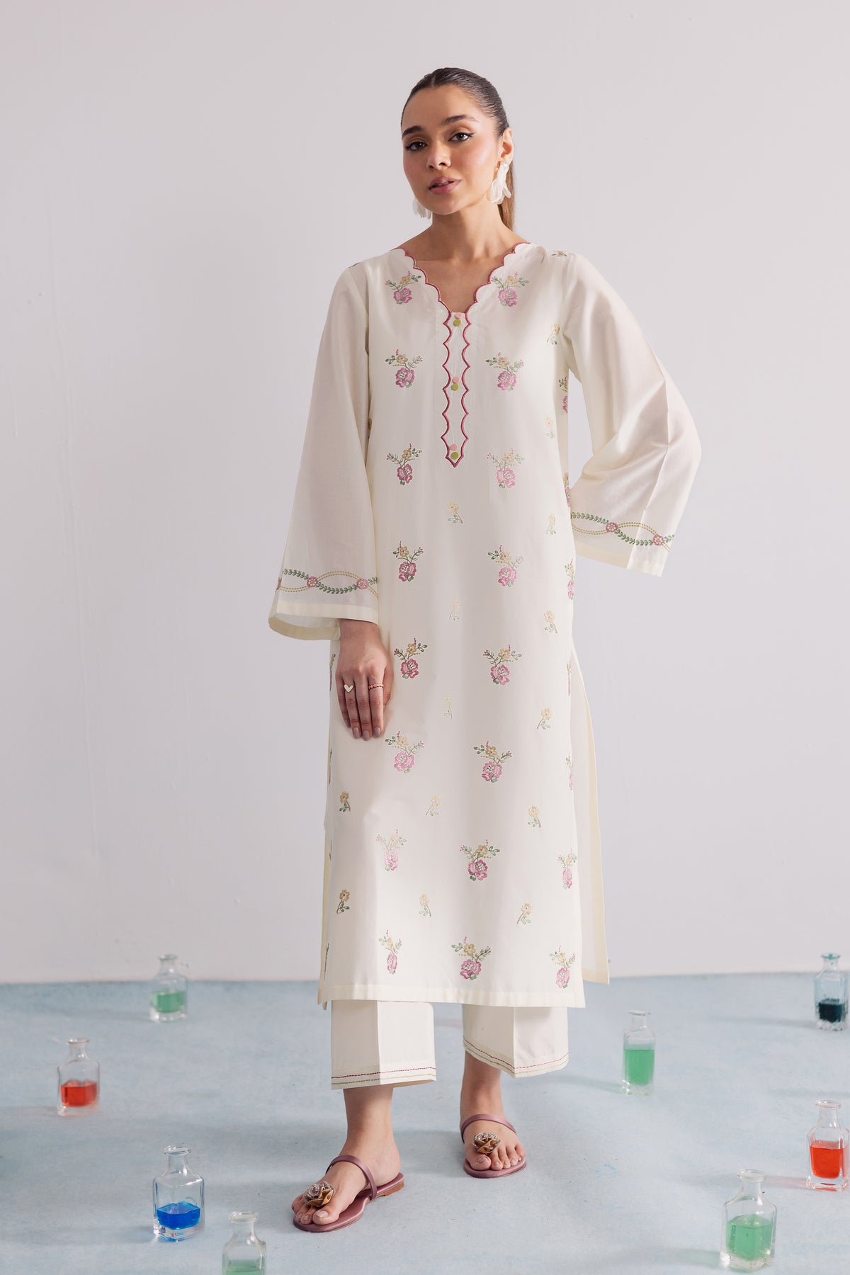This crisp off-white pima lawn co-ord set is thoughtfully designed for effortless style and everyday elegance. The shirt showcases delicate pink floral embroidery across the sleeve hems, adding a soft, feminine charm to the minimal silhouette. Cut in a relaxed fit, it blends comfort with understated grace, perfect for casual sophistication.