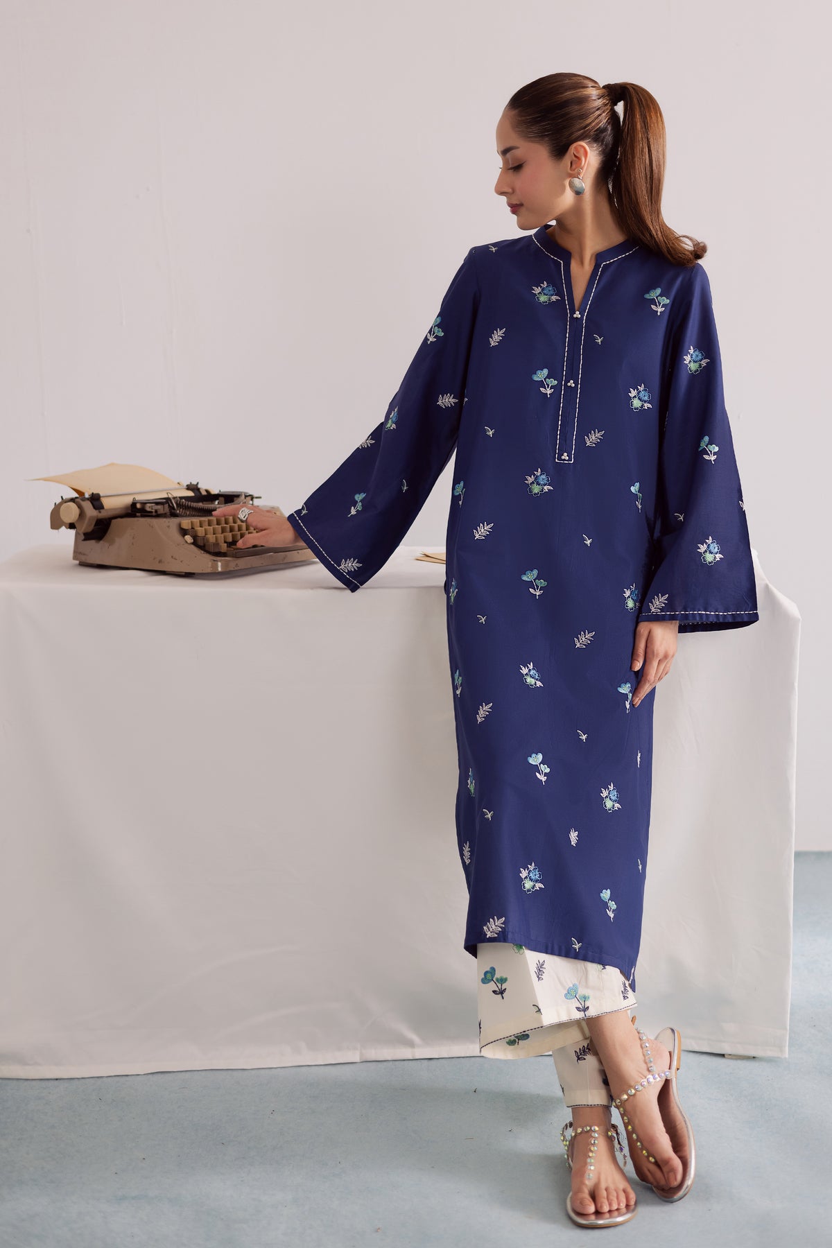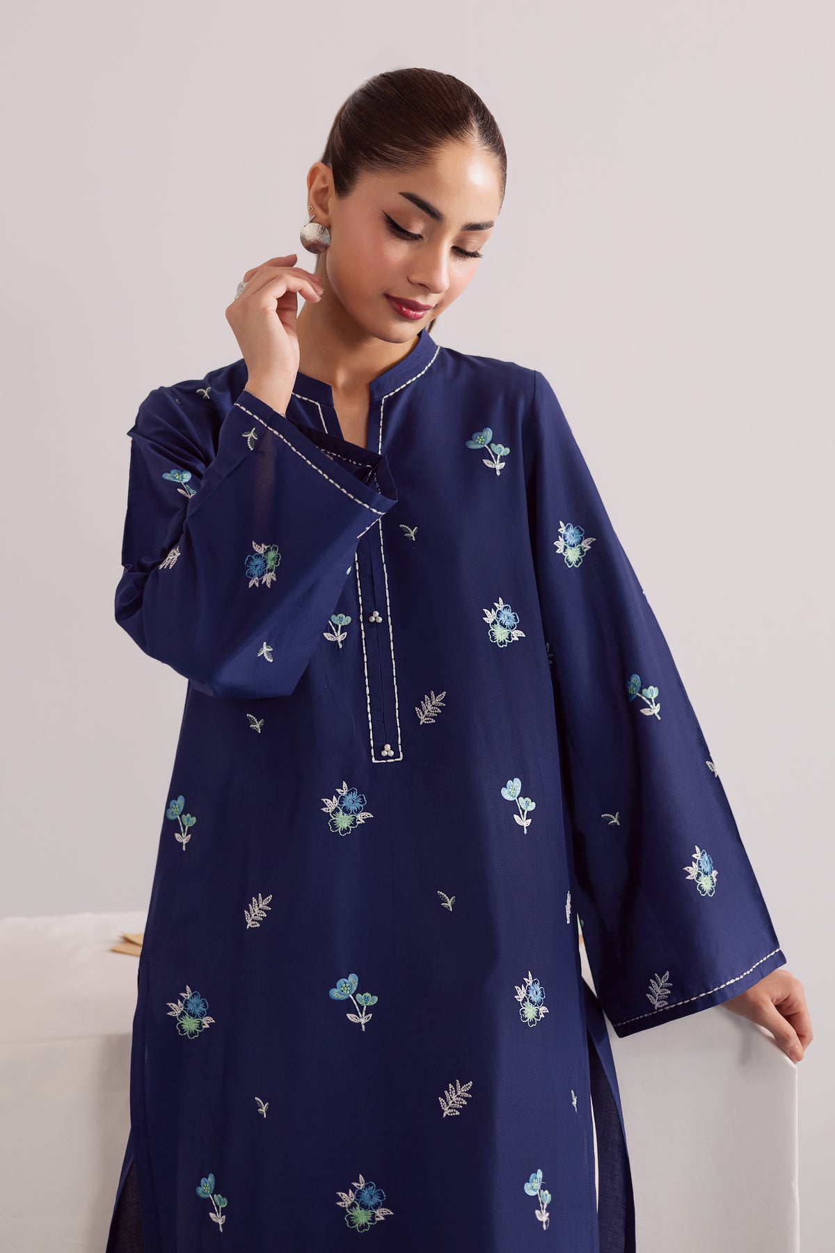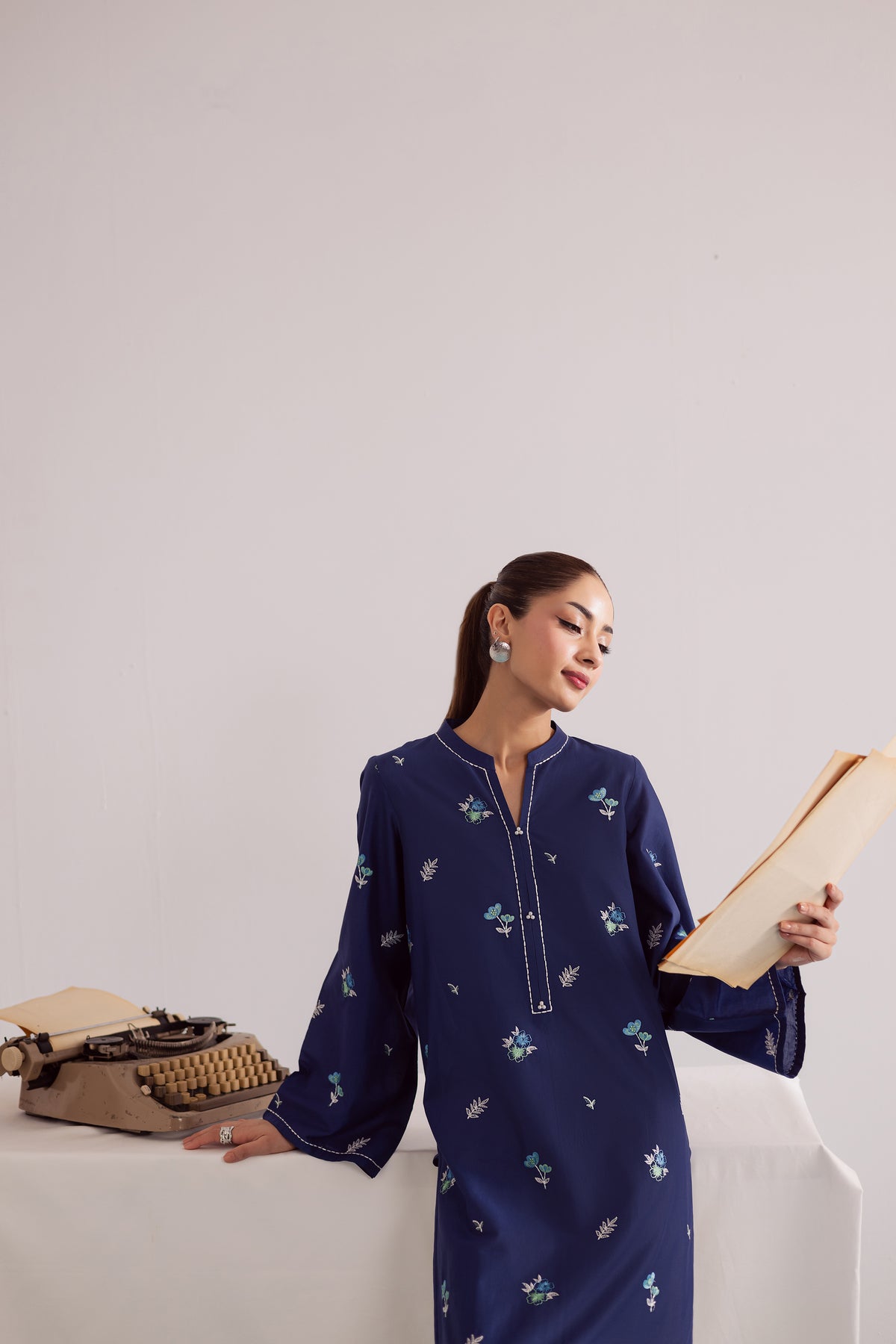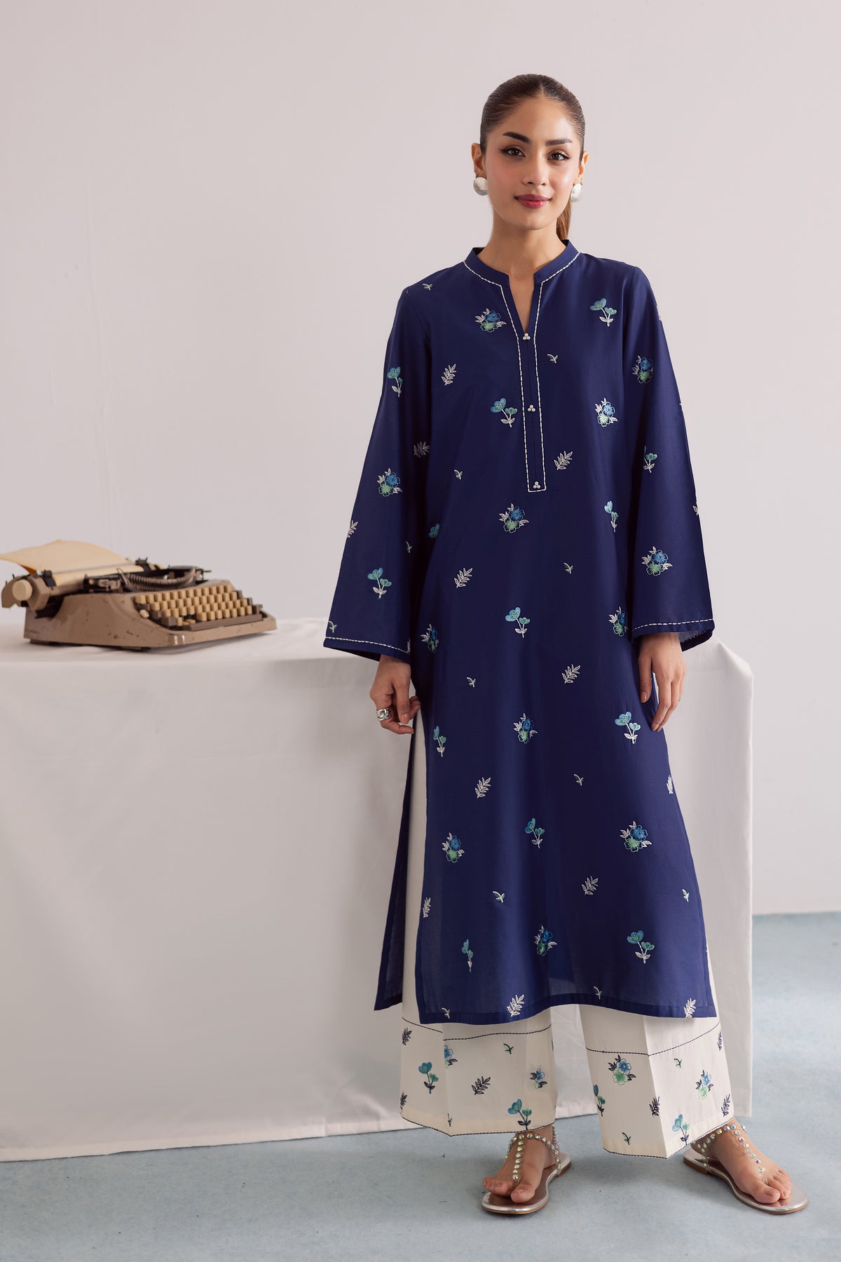 This midnight blue pima lawn set brings a refined take on everyday dressing. The long shirt features a clean, straight silhouette with minimal embroidery delicately spread across the fabric, creating an understated yet elegant charm. The neckline is elevated with subtle topstitch detailing and a refined collage of pearls, adding a graceful, feminine touch.