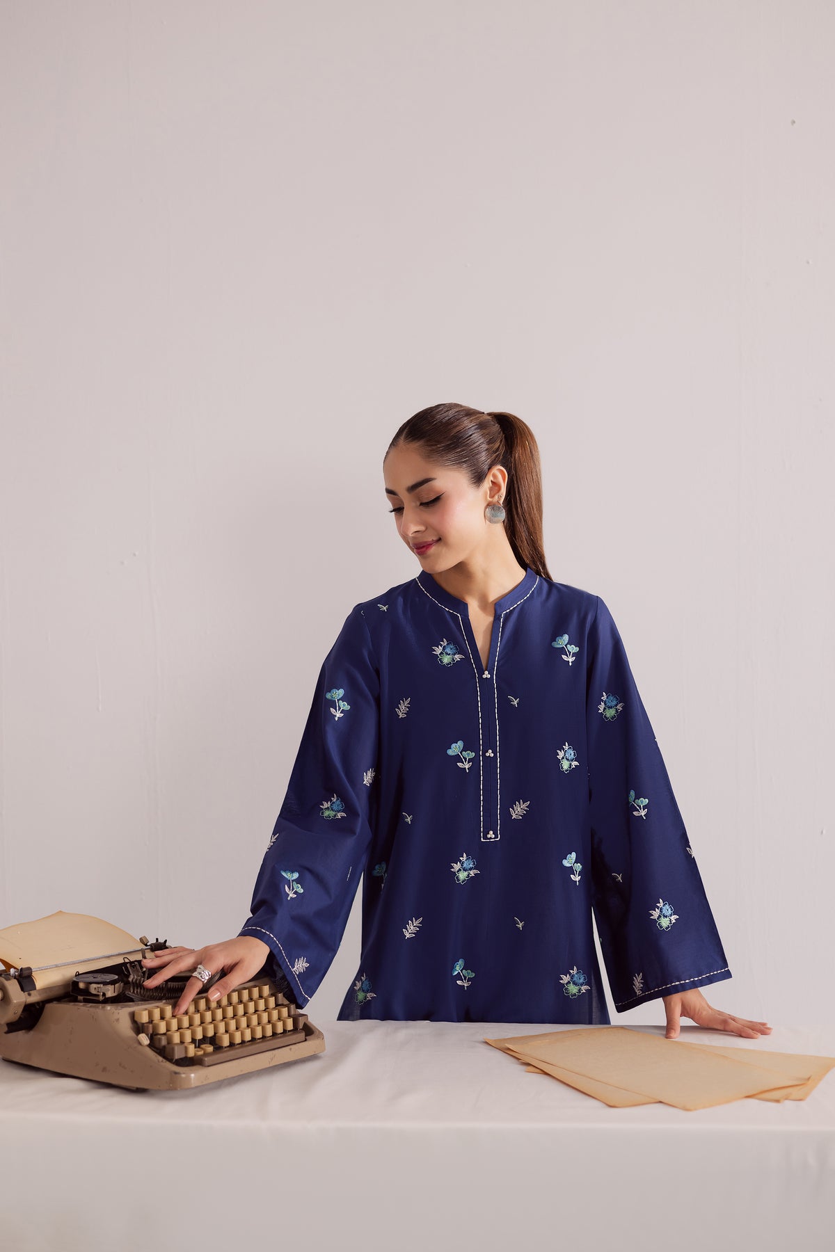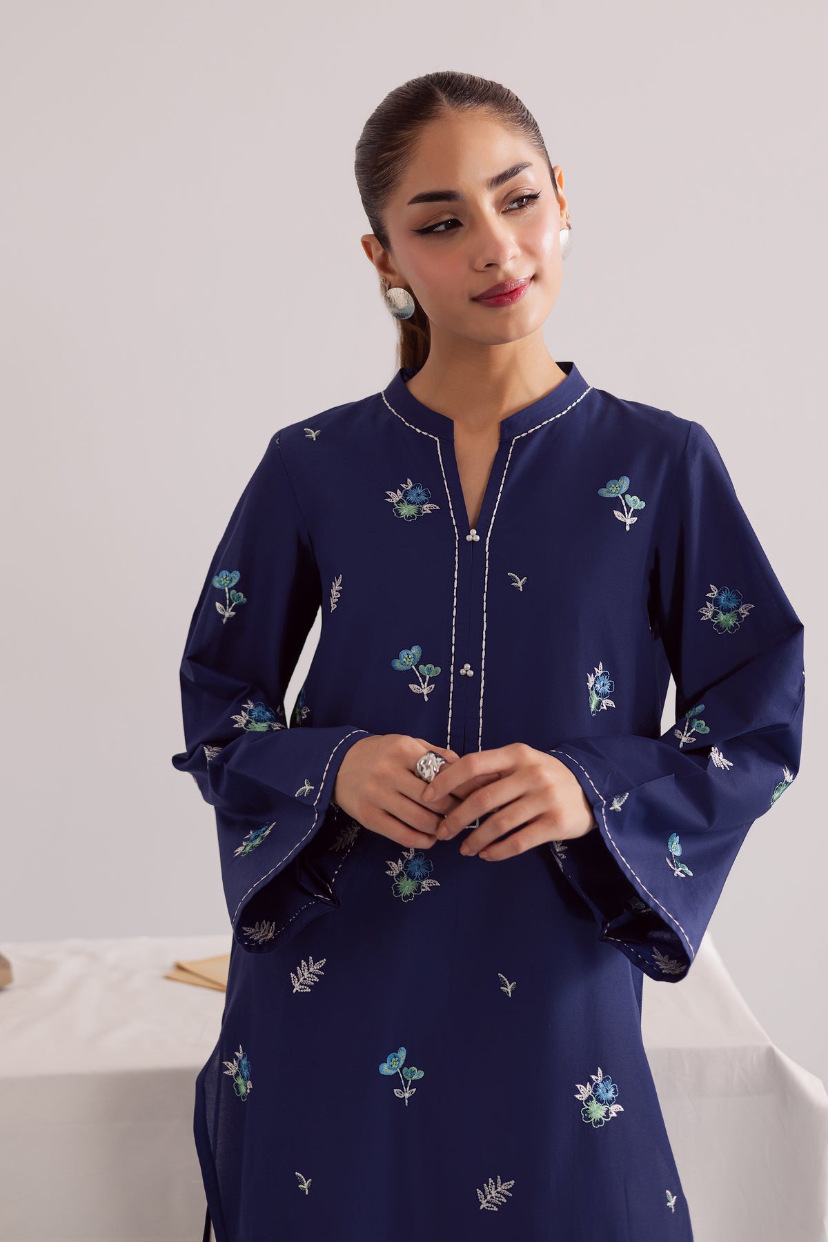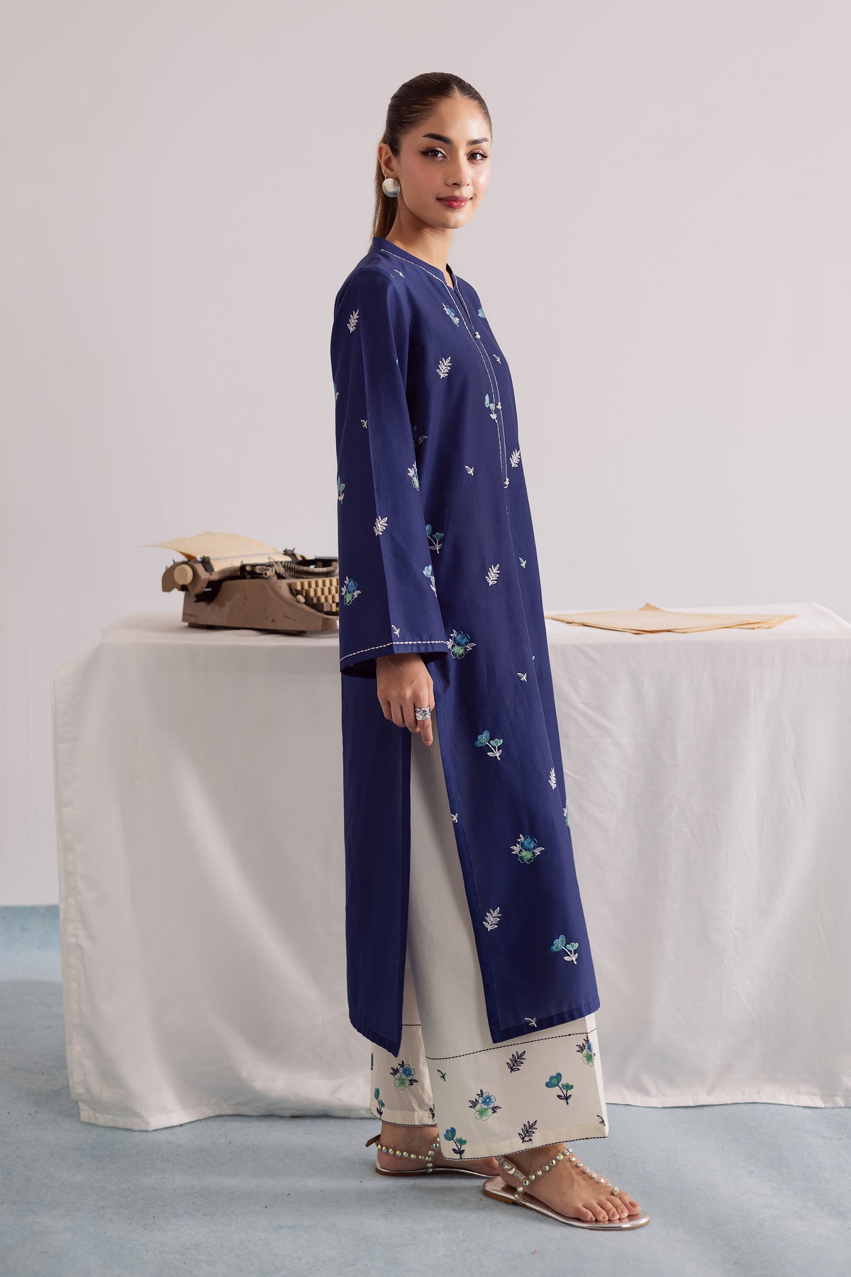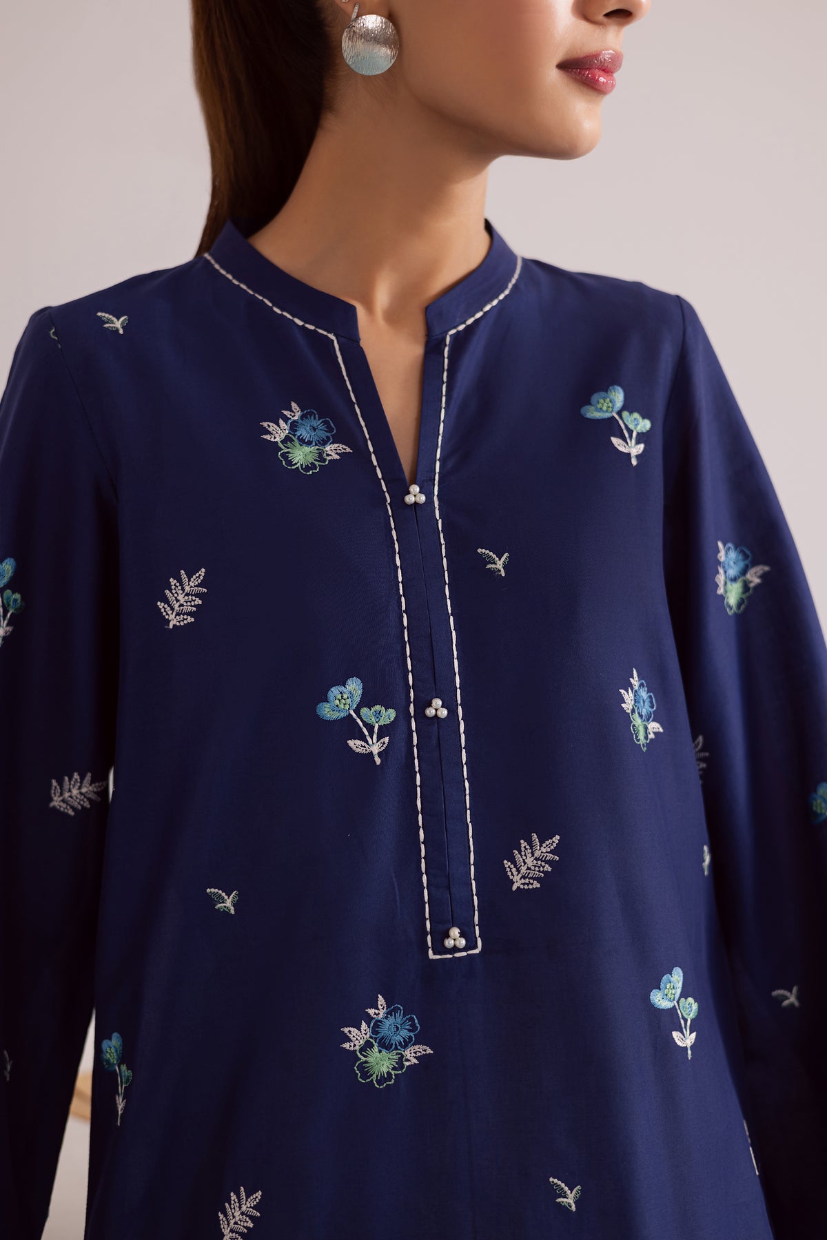 This midnight blue pima lawn set brings a refined take on everyday dressing. The long shirt features a clean, straight silhouette with minimal embroidery delicately spread across the fabric, creating an understated yet elegant charm. The neckline is elevated with subtle topstitch detailing and a refined collage of pearls, adding a graceful, feminine touch.