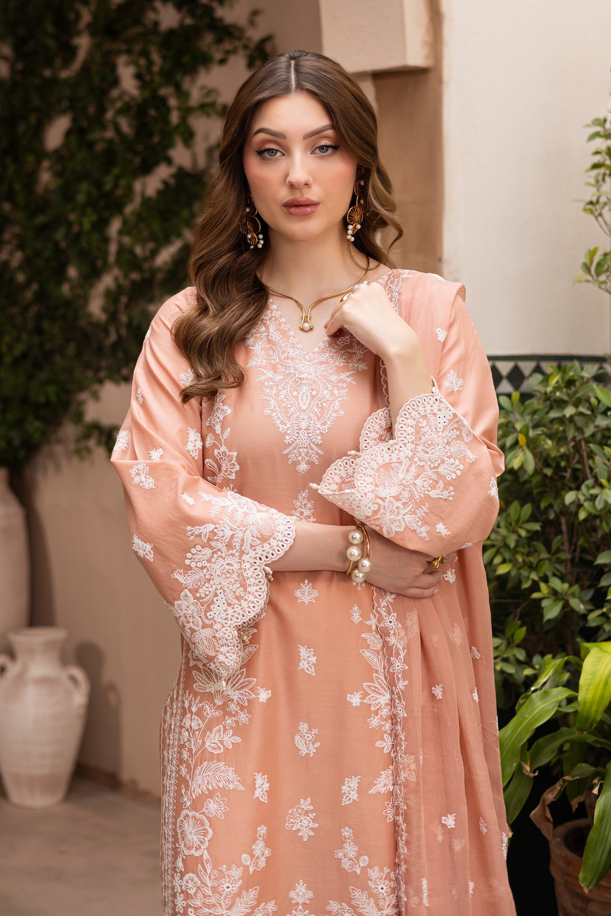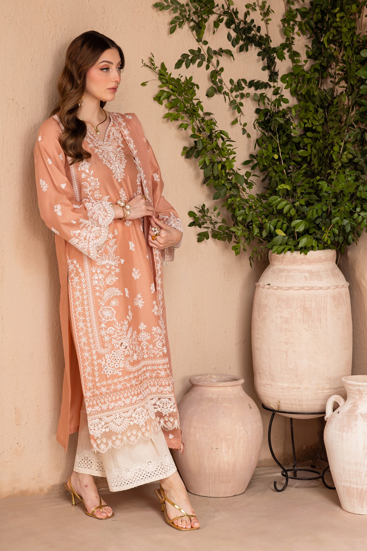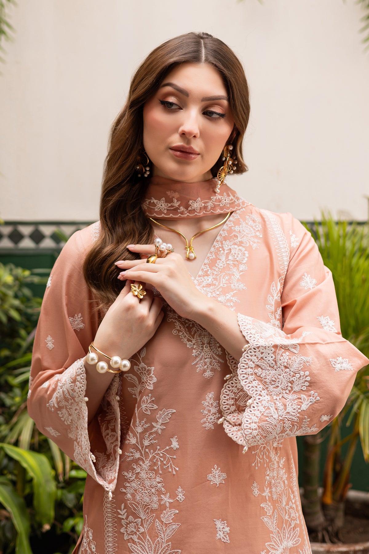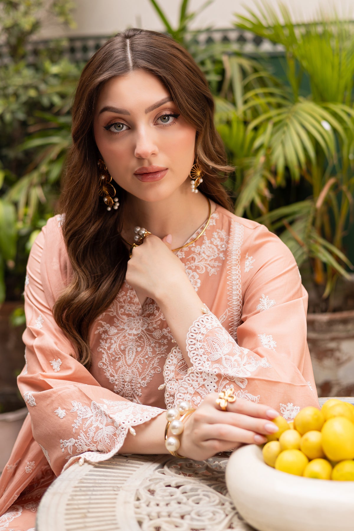 Step into timeless elegance with this embroidered pima lawn peach long shirt, beautifully designed with a heavily embroidered hem featuring an organza border and scalloped edges, delicately embellished with pearls for a touch of grace. The neckline is adorned with subtle embroidery, adding refinement to the overall look. Flared embroidered sleeves with pearl hangings complete the shirt, bringing soft movement and charm.