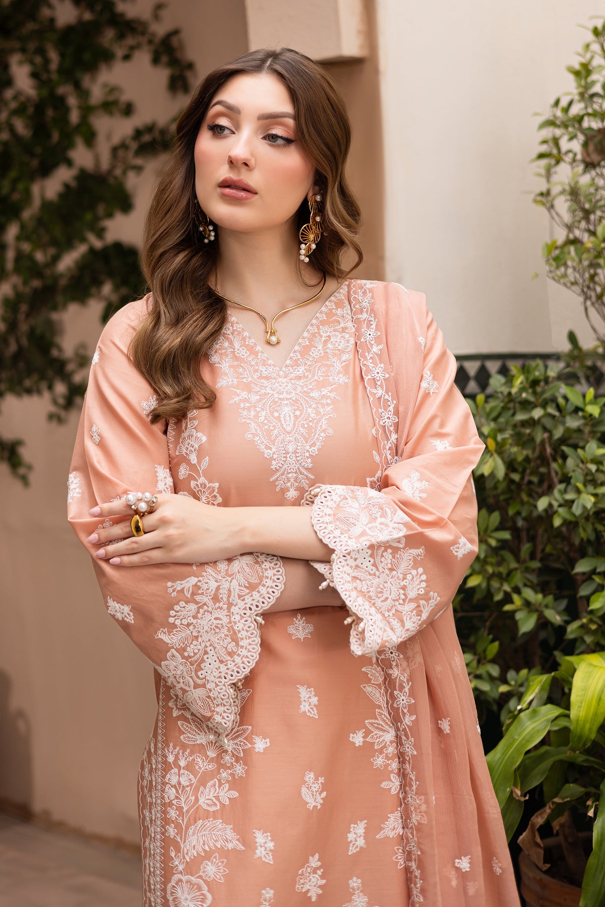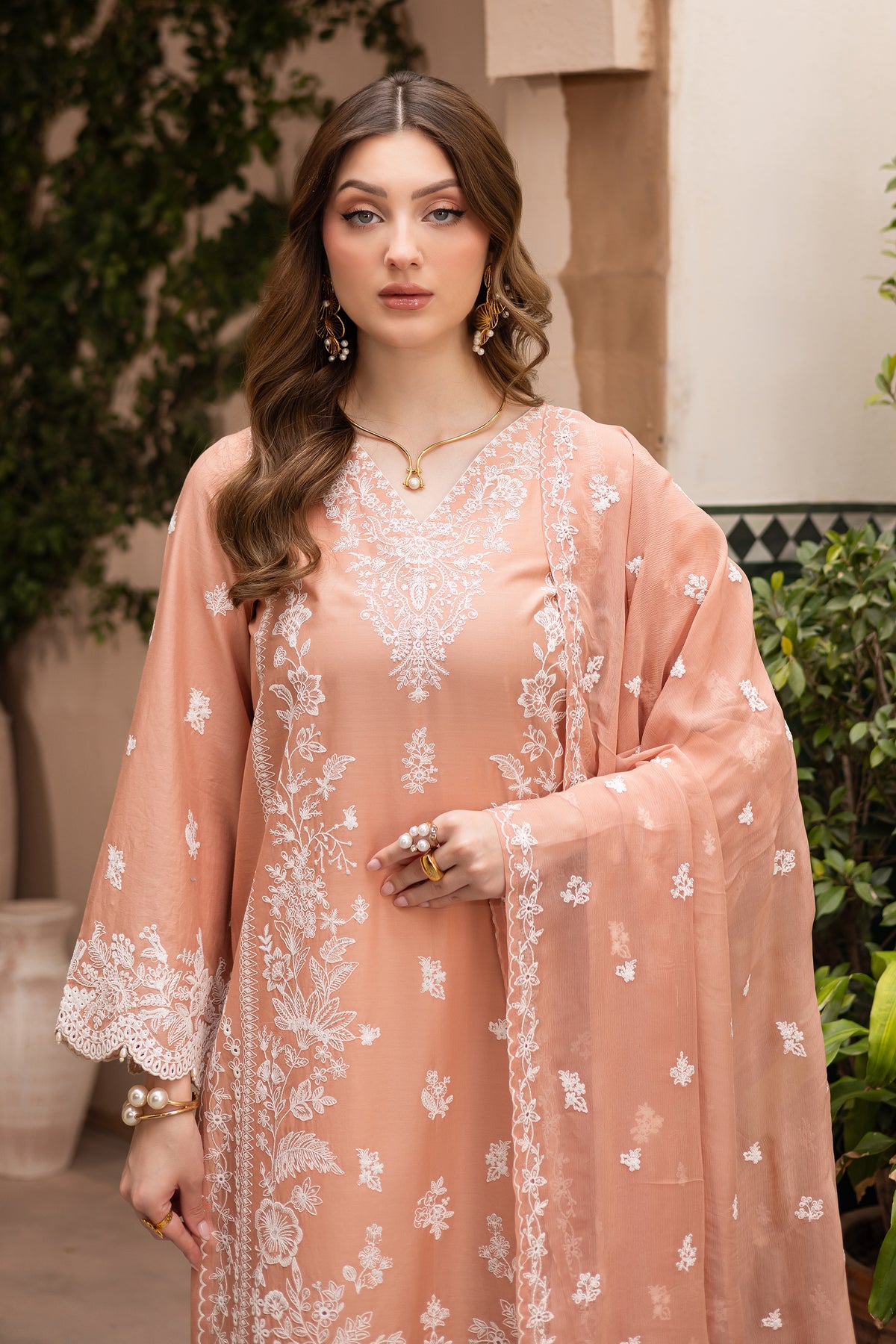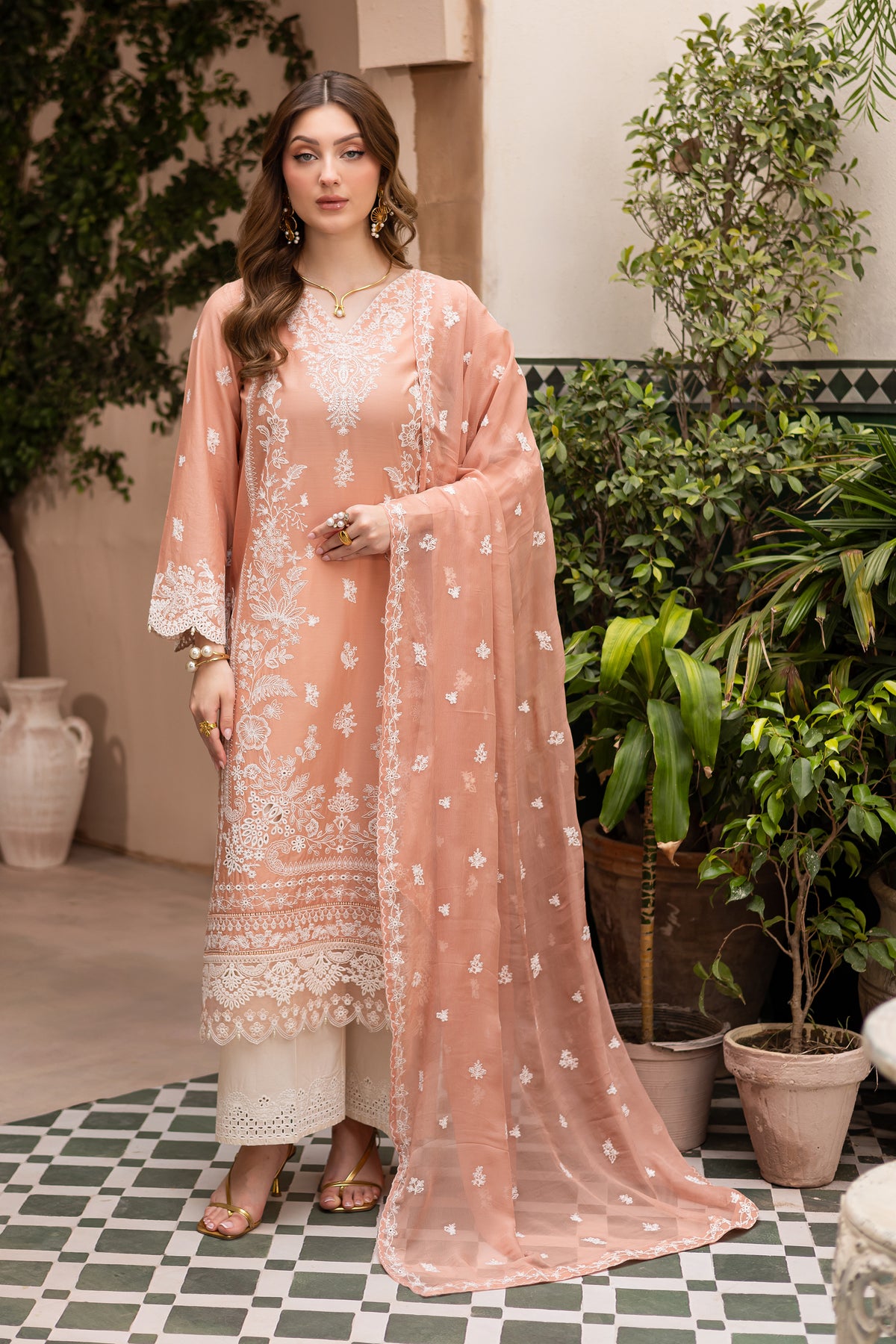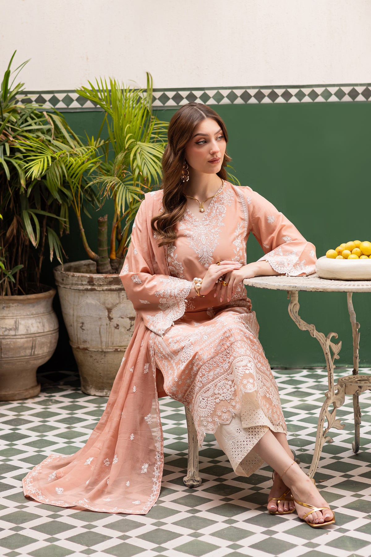 Step into timeless elegance with this embroidered pima lawn peach long shirt, beautifully designed with a heavily embroidered hem featuring an organza border and scalloped edges, delicately embellished with pearls for a touch of grace. The neckline is adorned with subtle embroidery, adding refinement to the overall look. Flared embroidered sleeves with pearl hangings complete the shirt, bringing soft movement and charm.