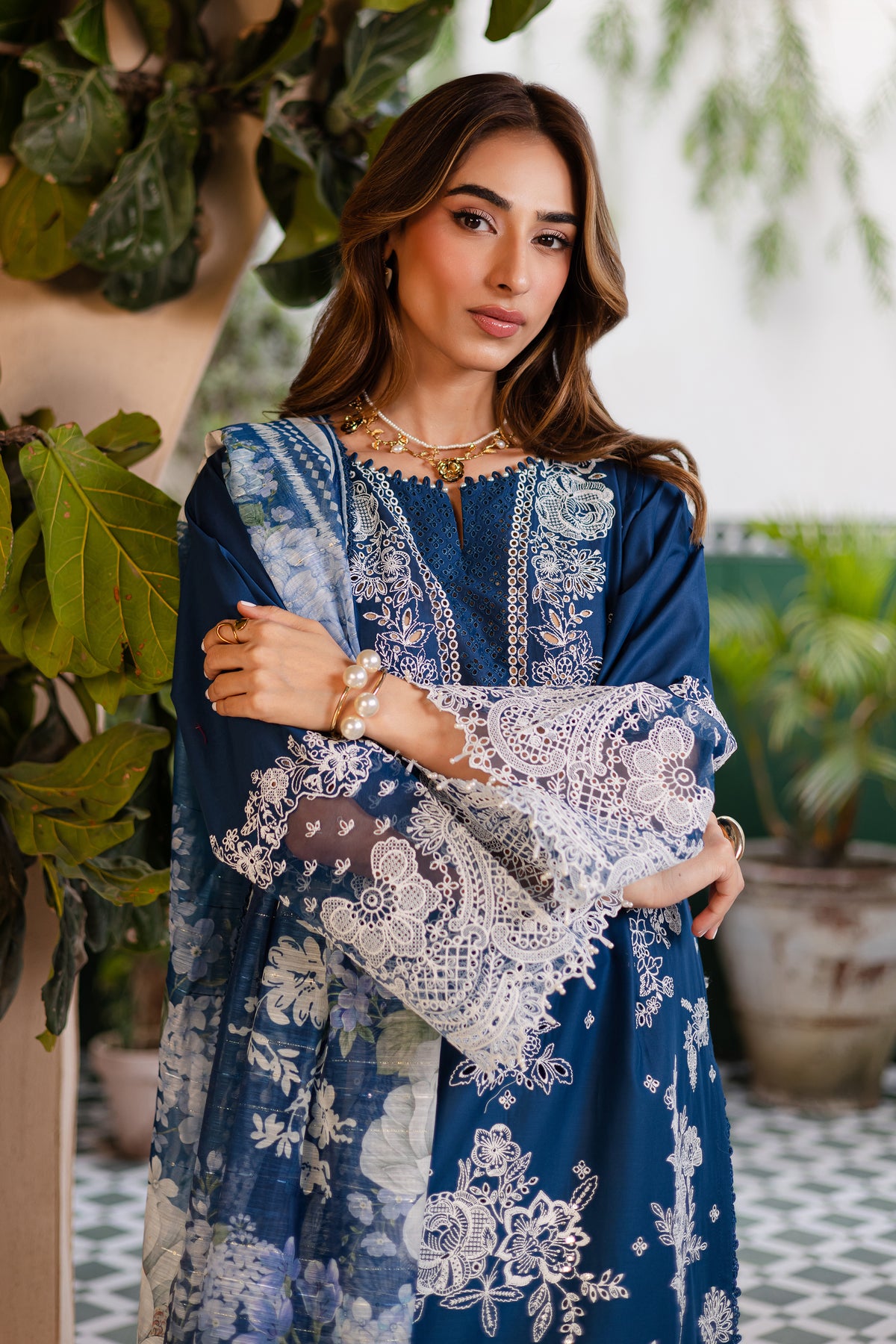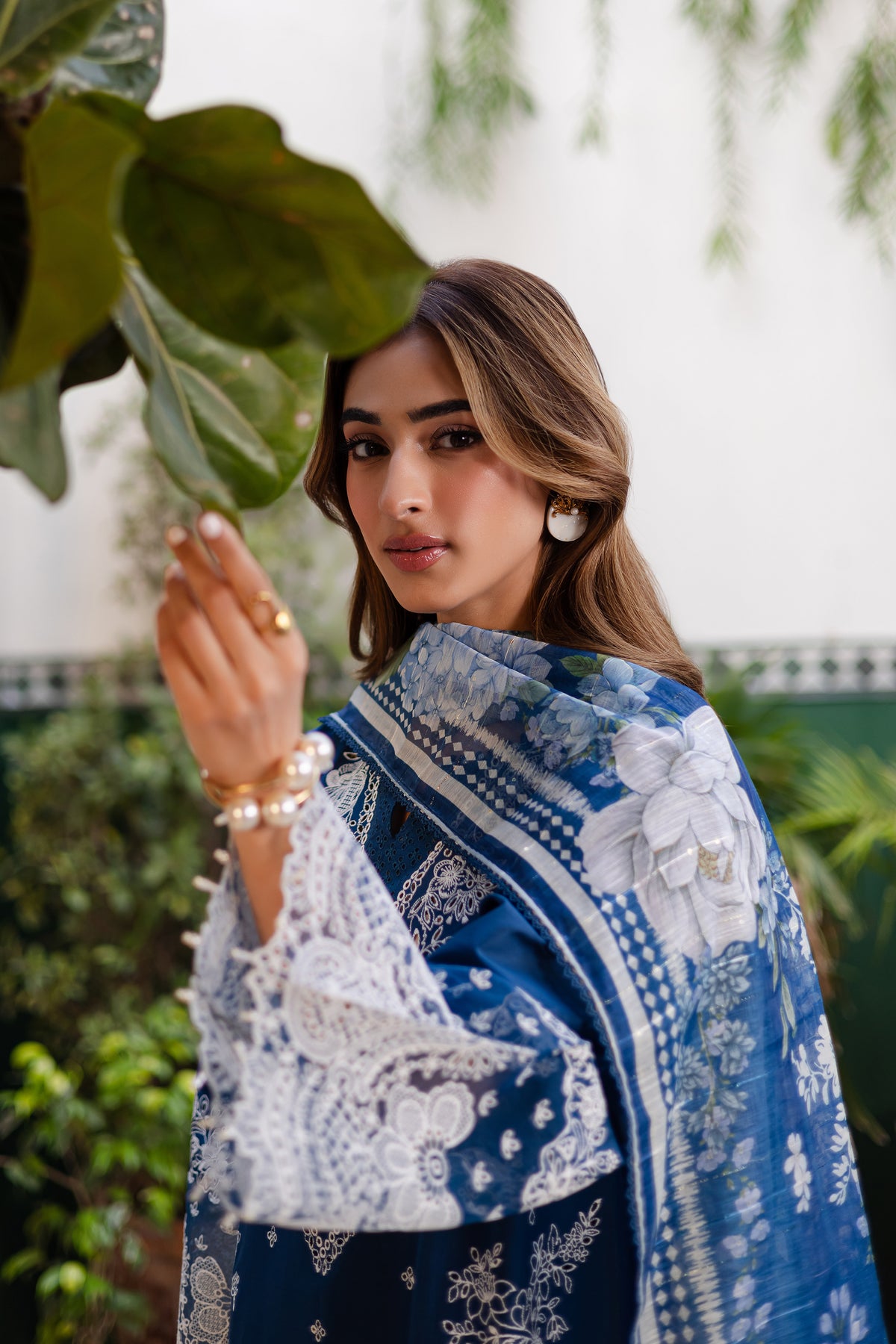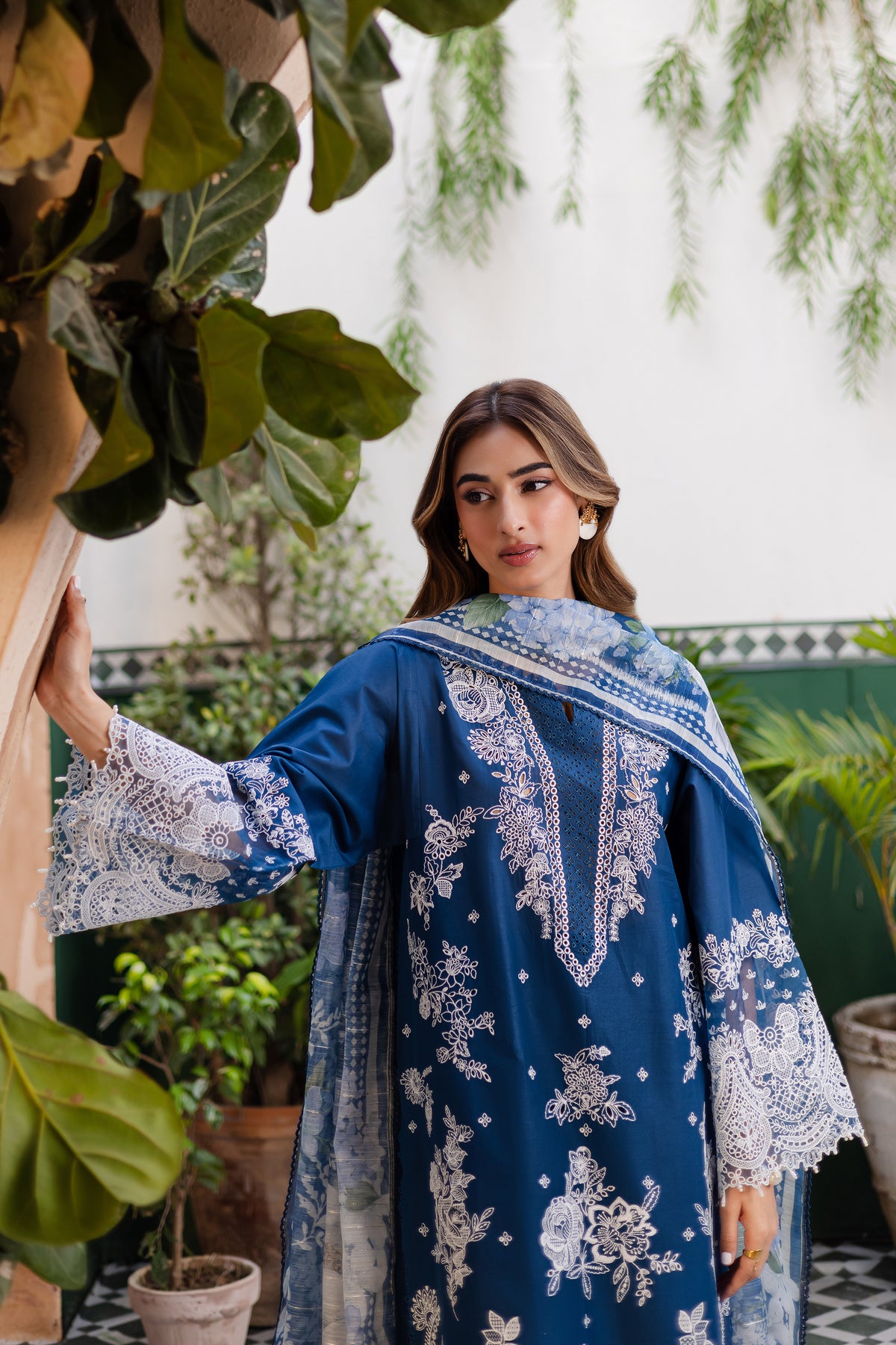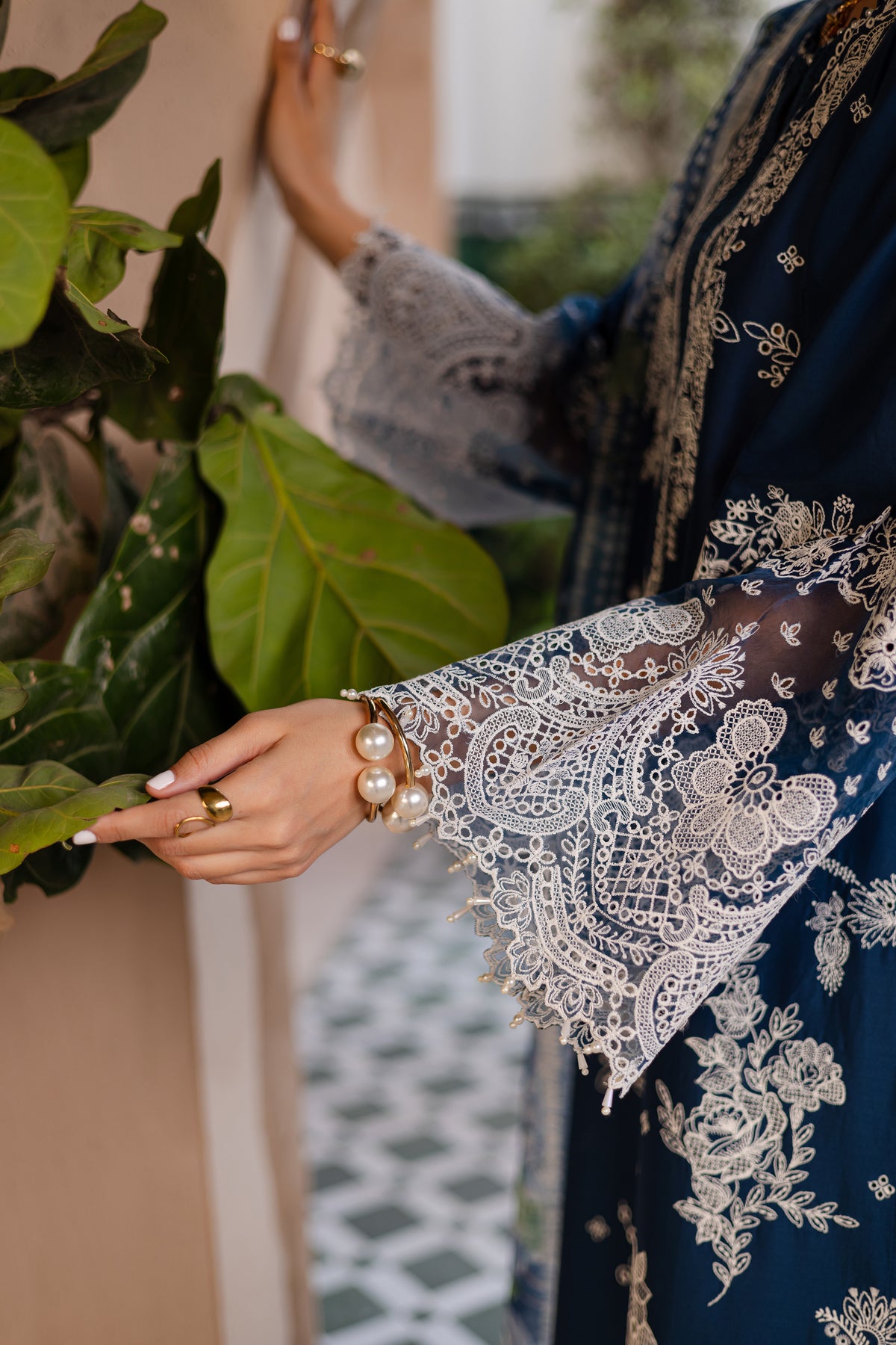 Make a statement with this fully composed embroidered pima lawn blue opal shirt, enriched with embroidered organza borders and a scalloped hemline. The hem is finished with delicate bead hangings that lend a touch of movement and elegance. The fully composed sleeves mirror the detail of the shirt, adorned with embroidered organza borders and finished with graceful pearl hangings for a refined, feminine touch.