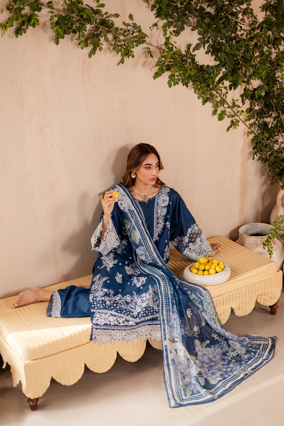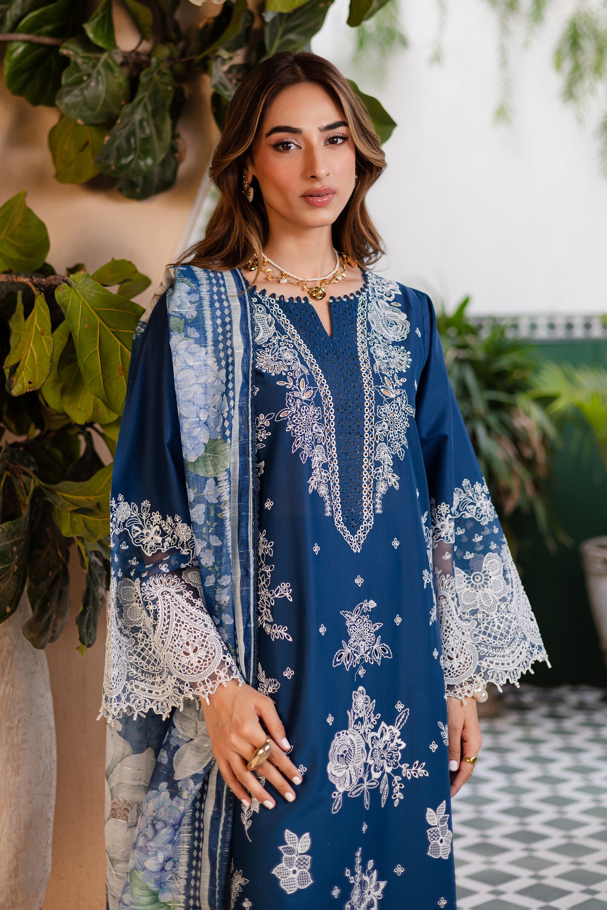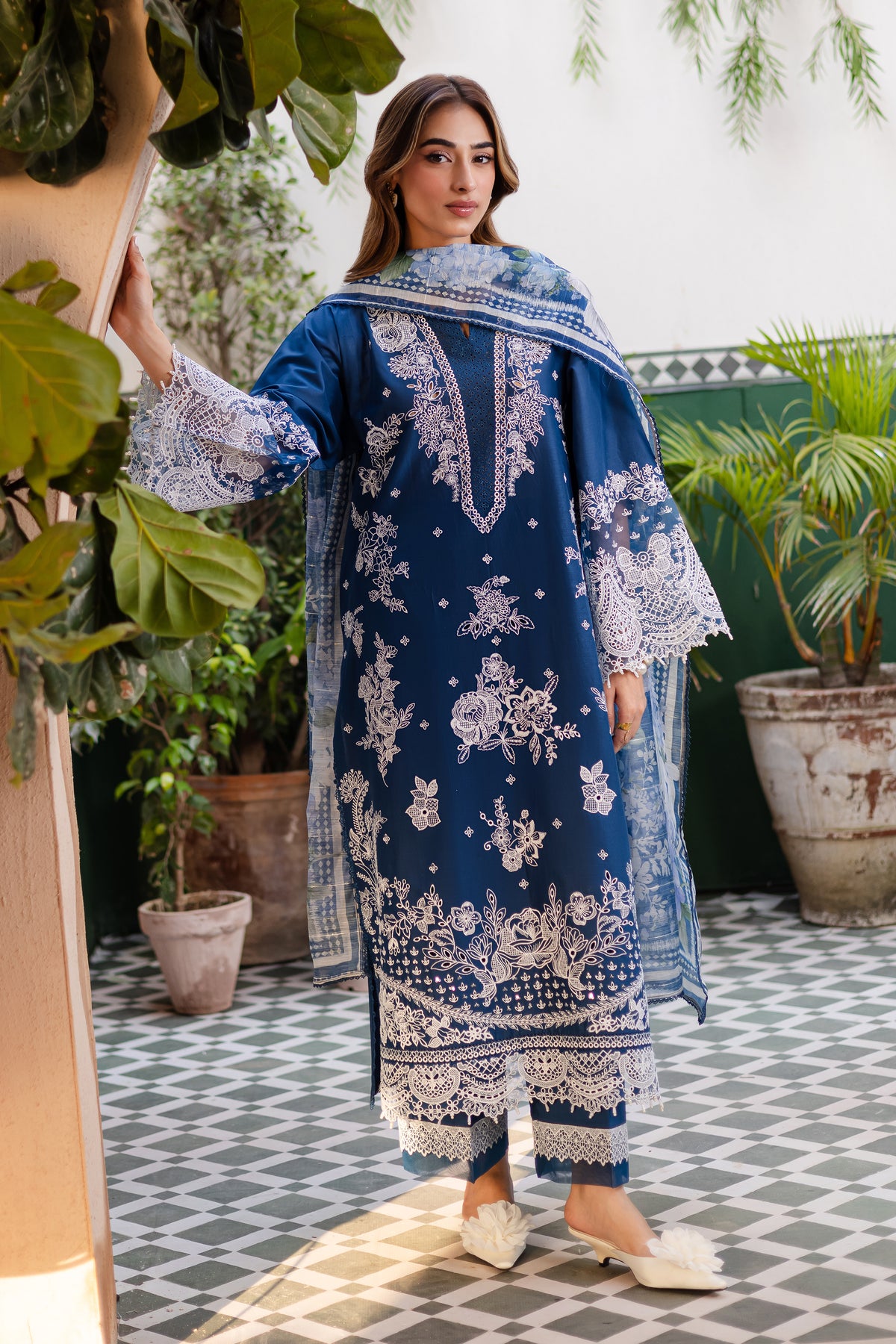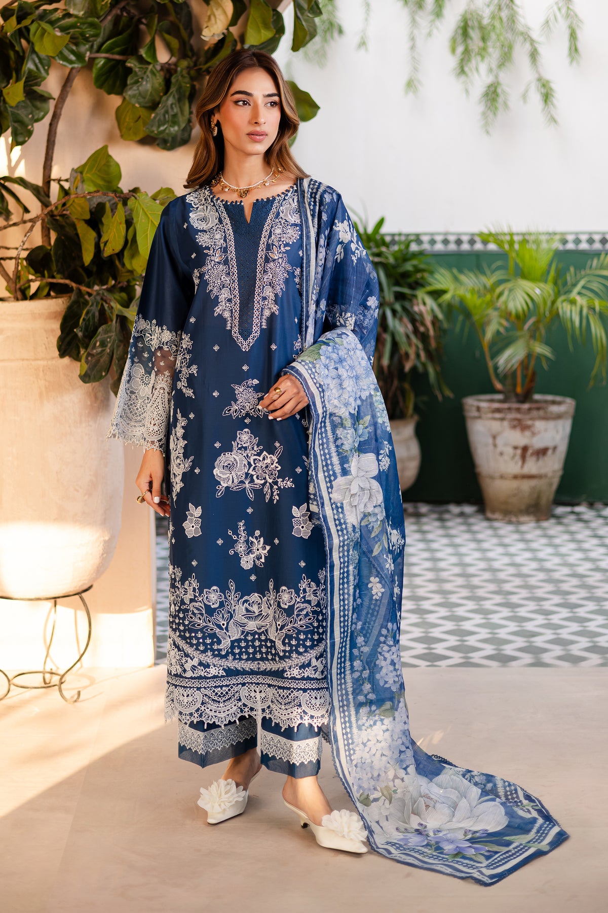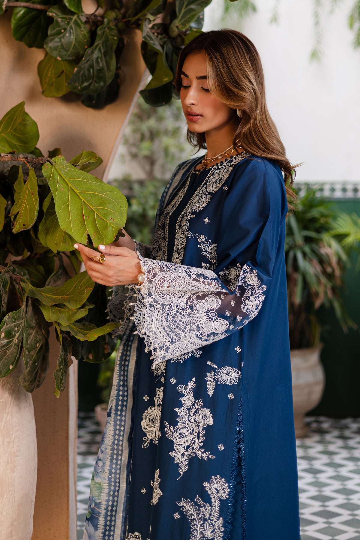 Make a statement with this fully composed embroidered pima lawn blue opal shirt, enriched with embroidered organza borders and a scalloped hemline. The hem is finished with delicate bead hangings that lend a touch of movement and elegance. The fully composed sleeves mirror the detail of the shirt, adorned with embroidered organza borders and finished with graceful pearl hangings for a refined, feminine touch.