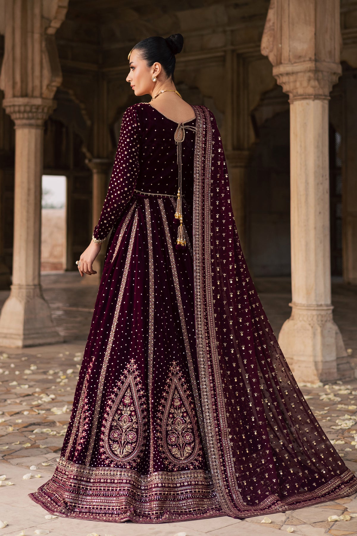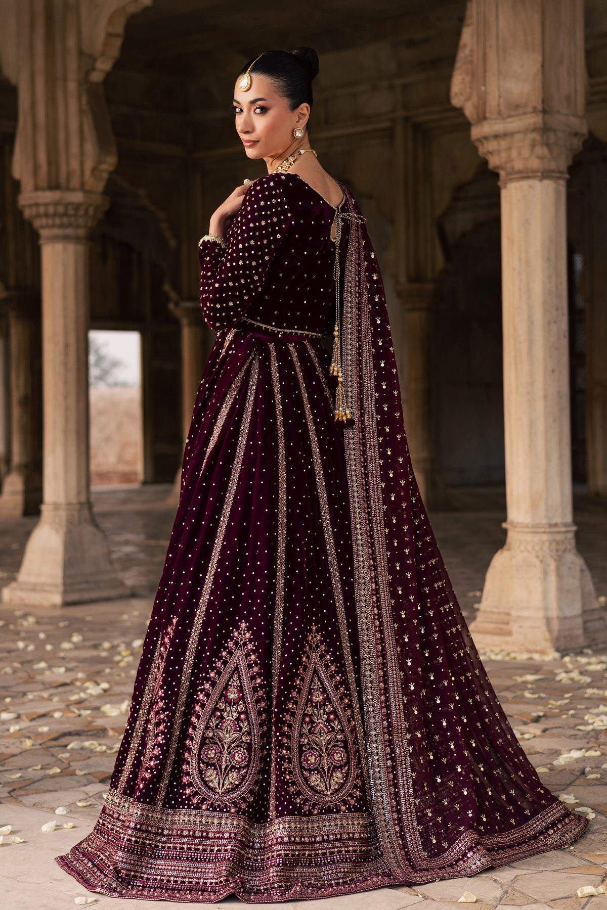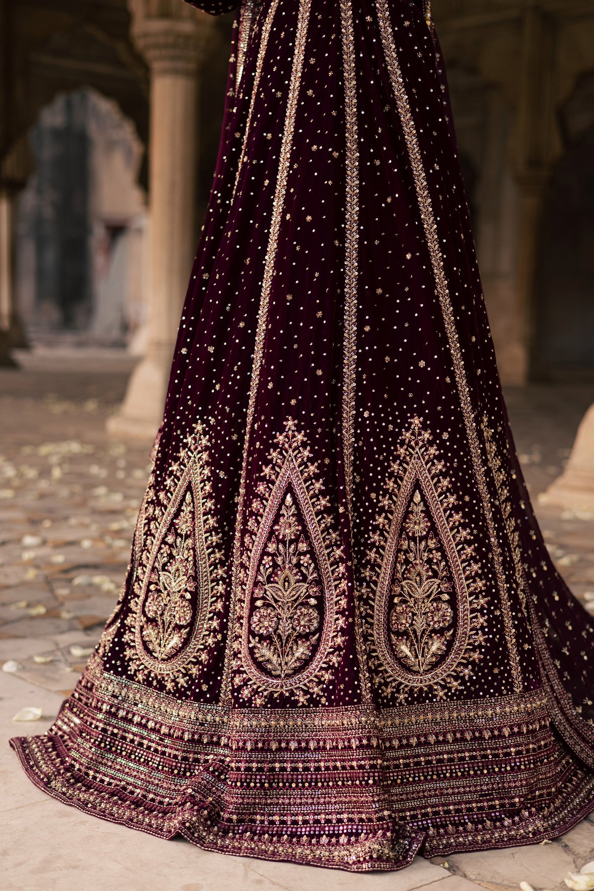 A tribute to heritage grandeur, this maroon bridal ensemble is crafted with devotion to traditional artistry. Rich velvet, intricate handwork, and deeply layered embellishments come together to create a look that feels majestic, timeless, and unmistakably bridal.