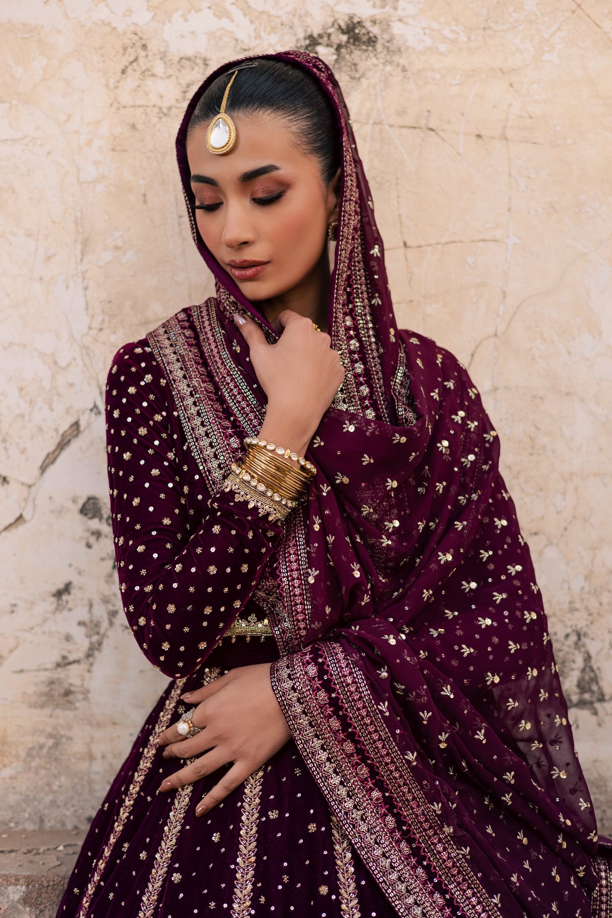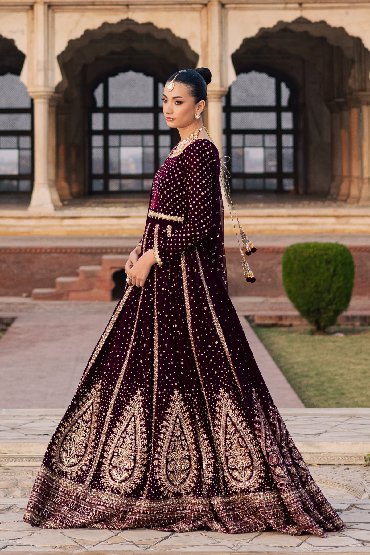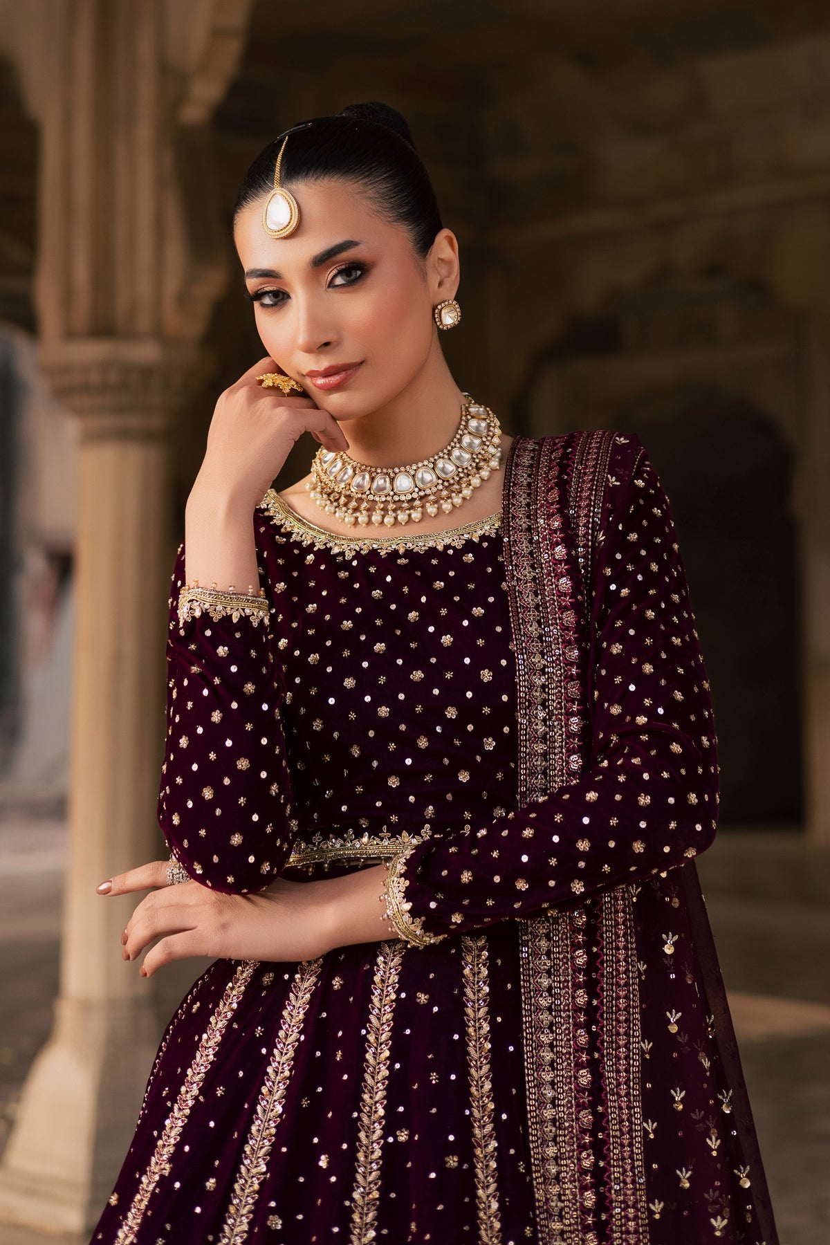 A tribute to heritage grandeur, this maroon bridal ensemble is crafted with devotion to traditional artistry. Rich velvet, intricate handwork, and deeply layered embellishments come together to create a look that feels majestic, timeless, and unmistakably bridal.