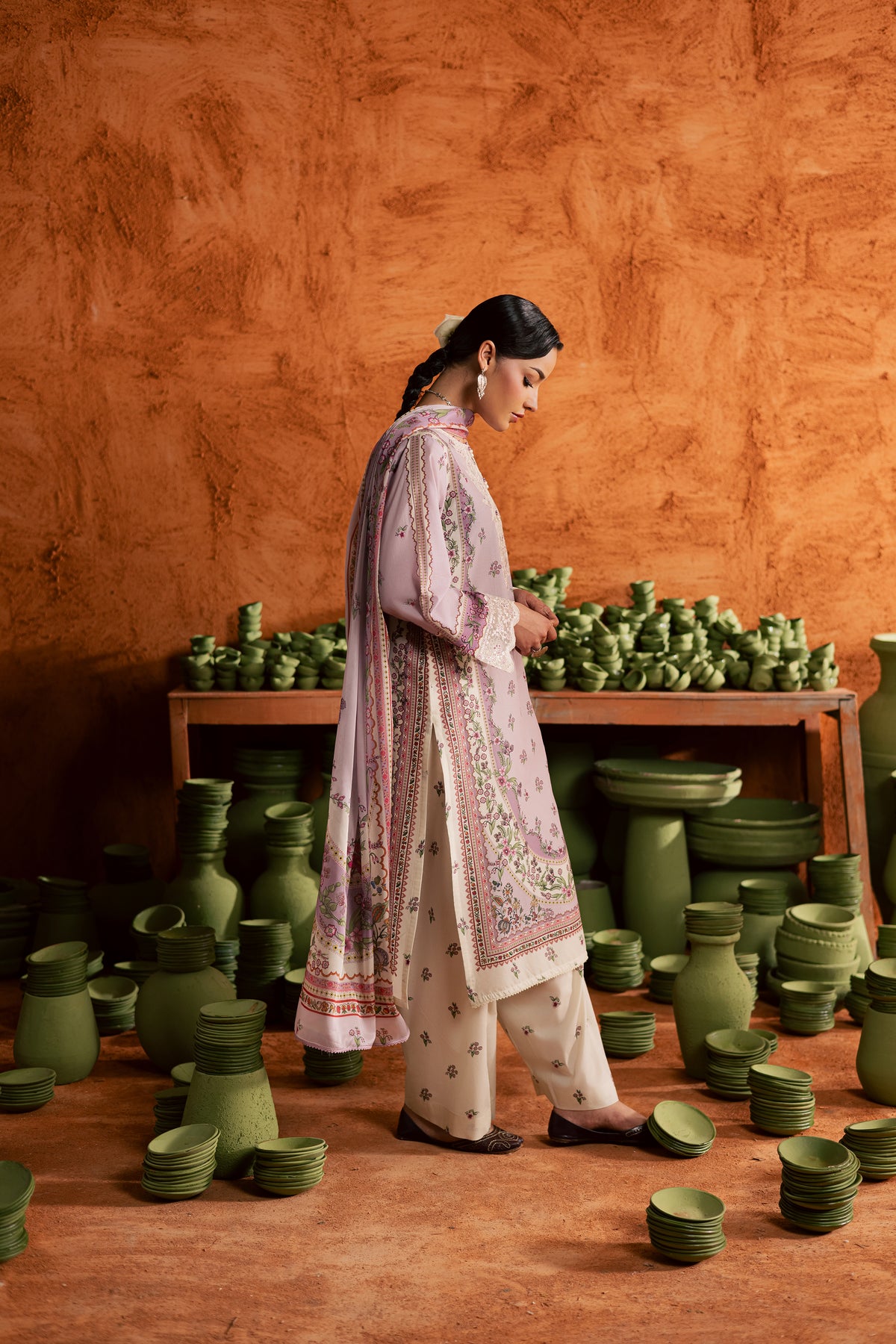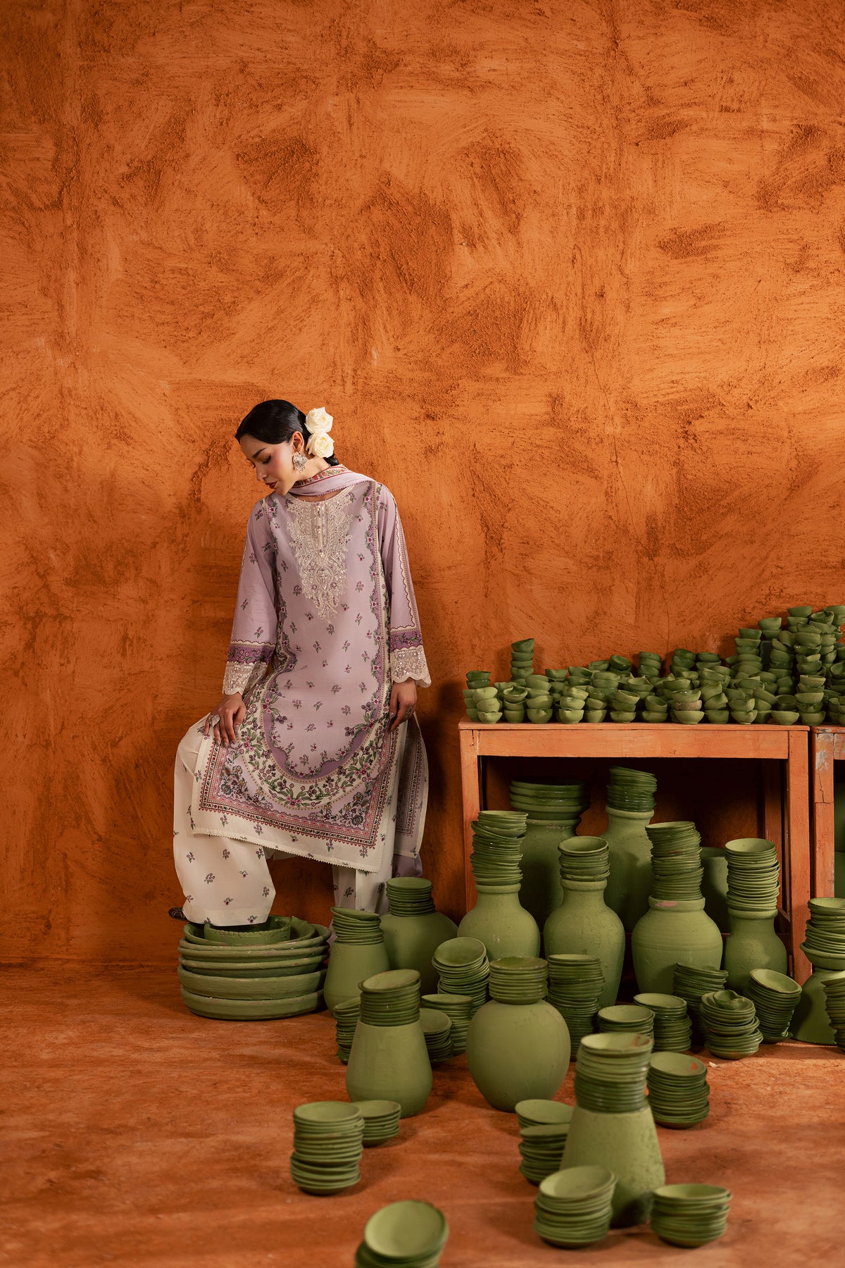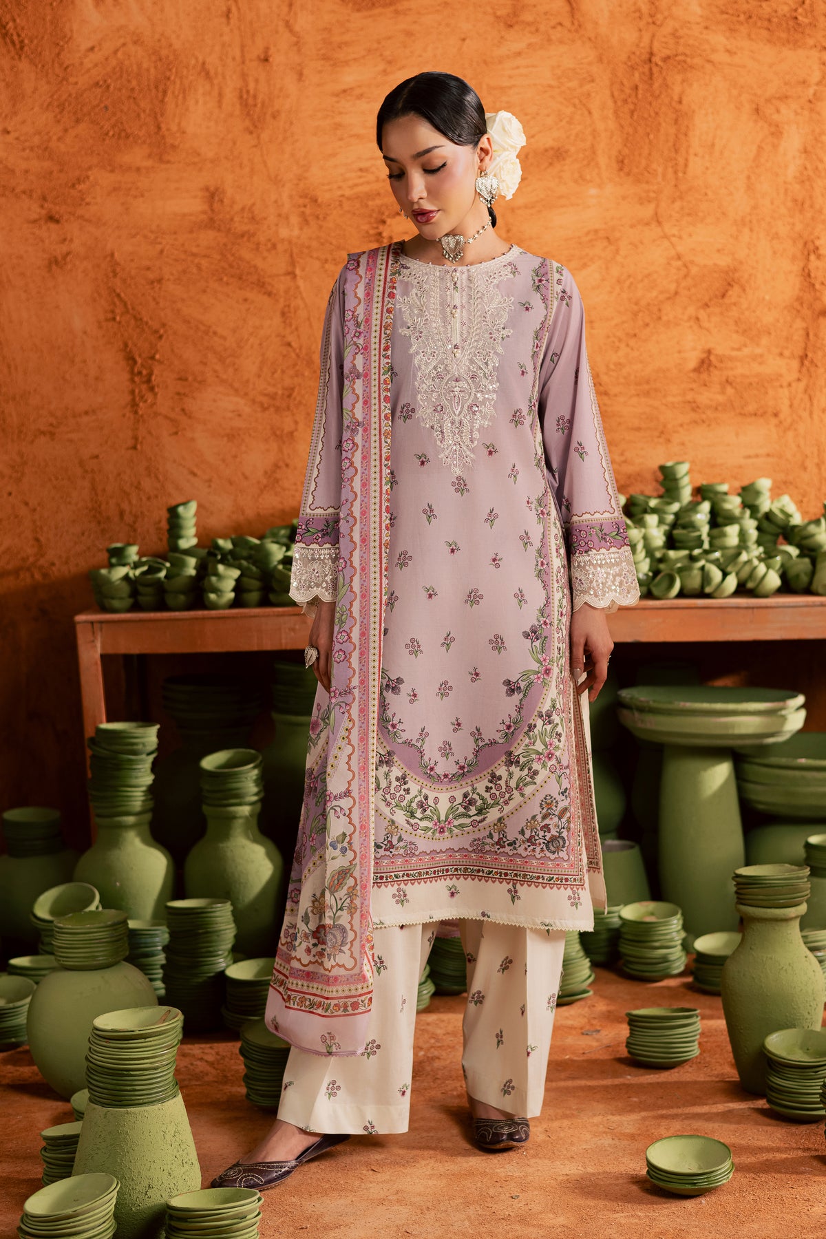 This 3-piece printed lilac ensemble features a shirt with an embroidered neckline, complemented by organza borders and pearl hangings that add a soft, refined detail to the design.