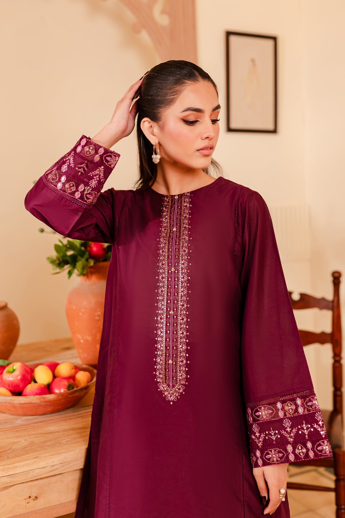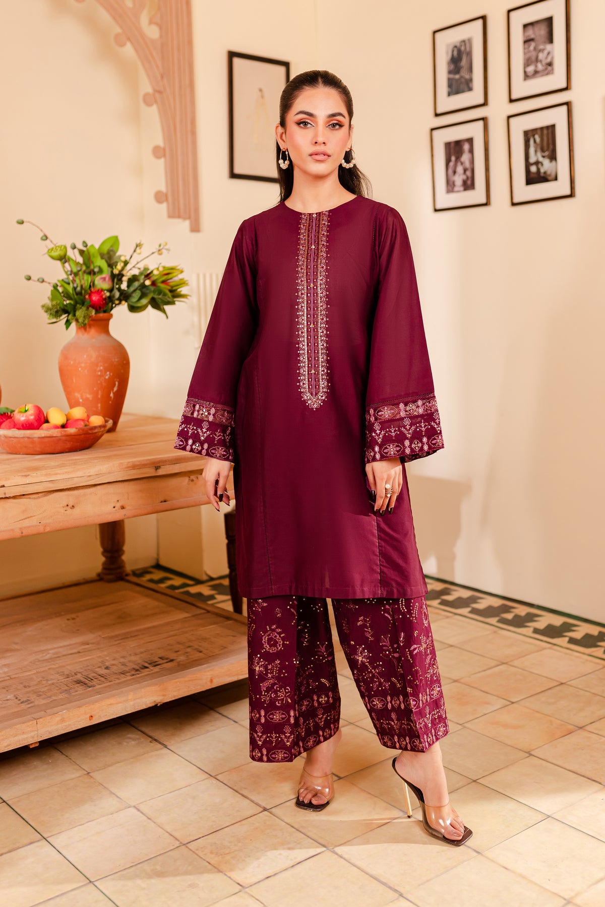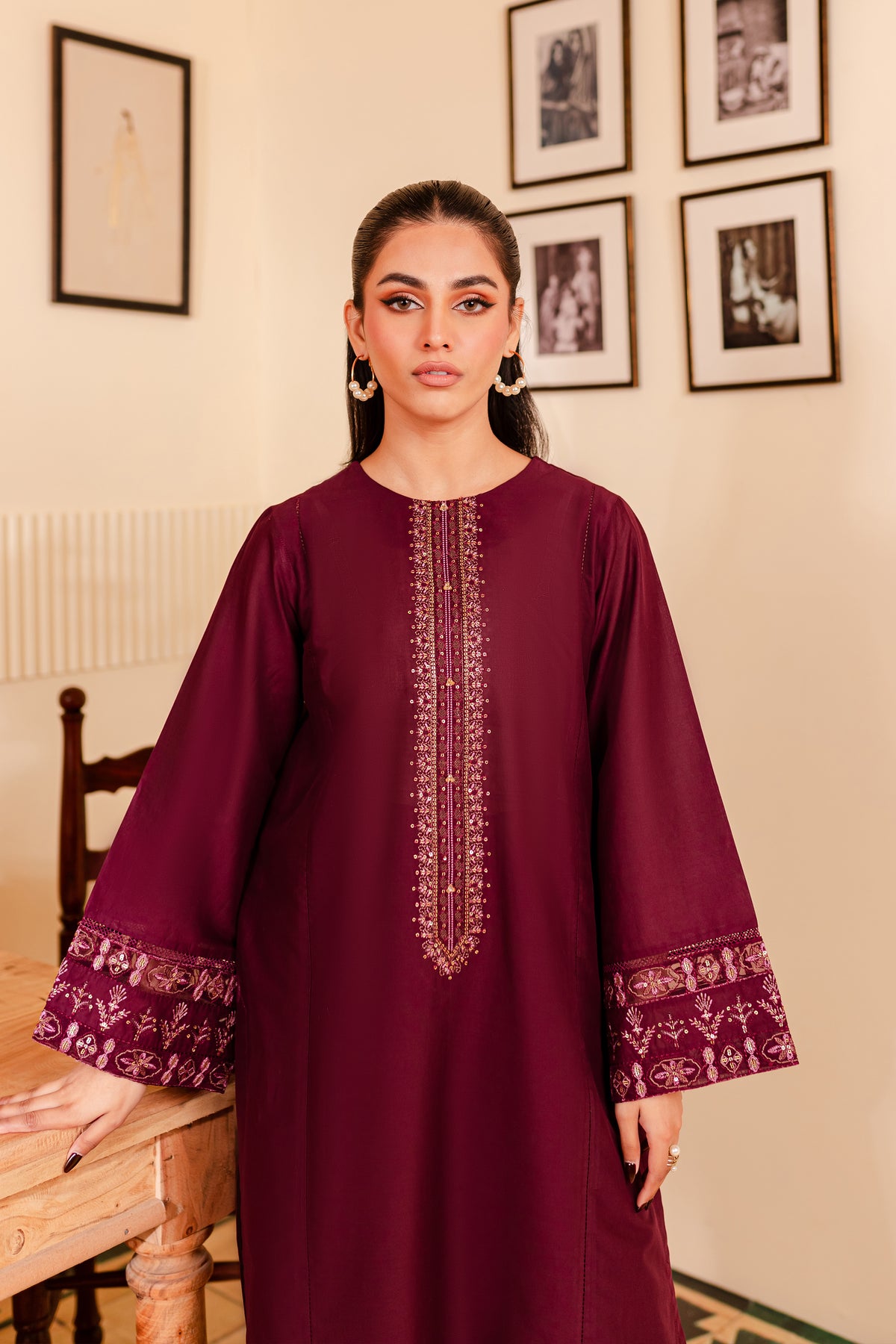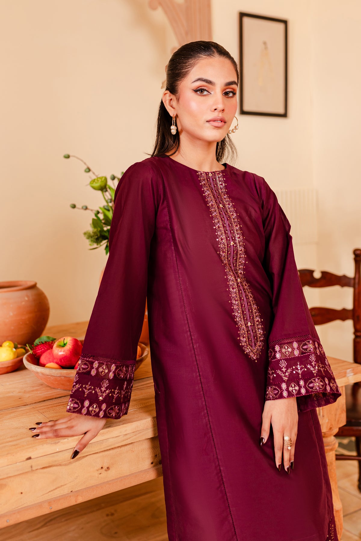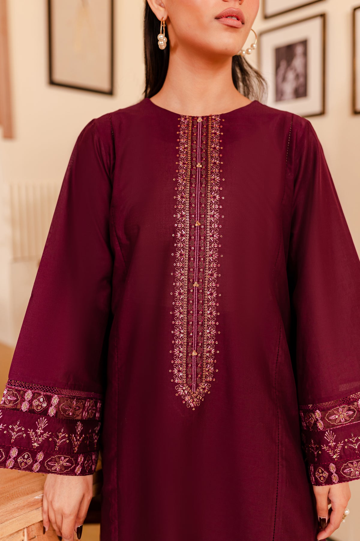 A chic and timeless addition to your wardrobe - our premium quality Pima lawn in the shades of burgundy exudes grace and charm. Uniquely designed straight fit paneled shirt displays fine embroidery at neckline touched up with collage embellishments. Adornments further include intricate embroidery at sleeves.