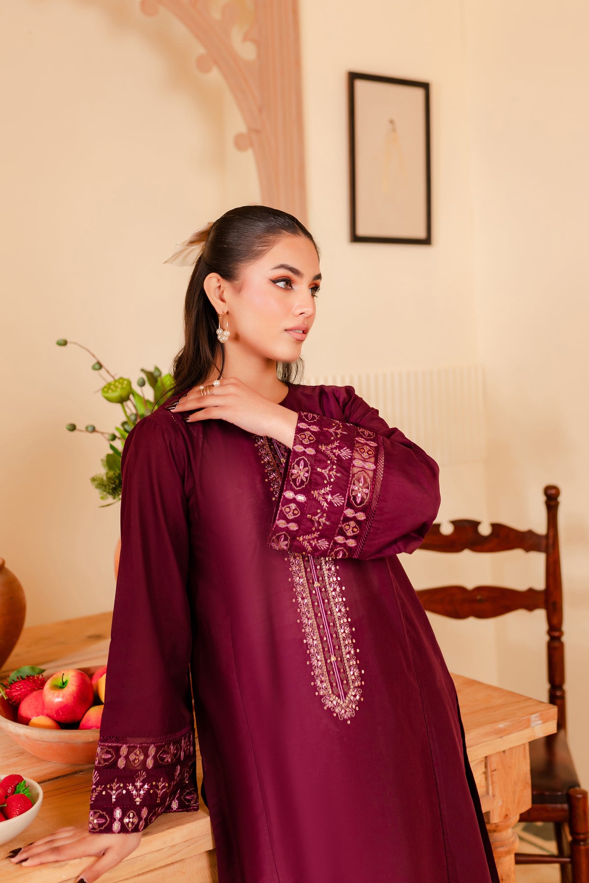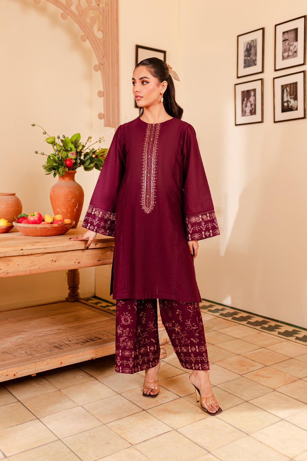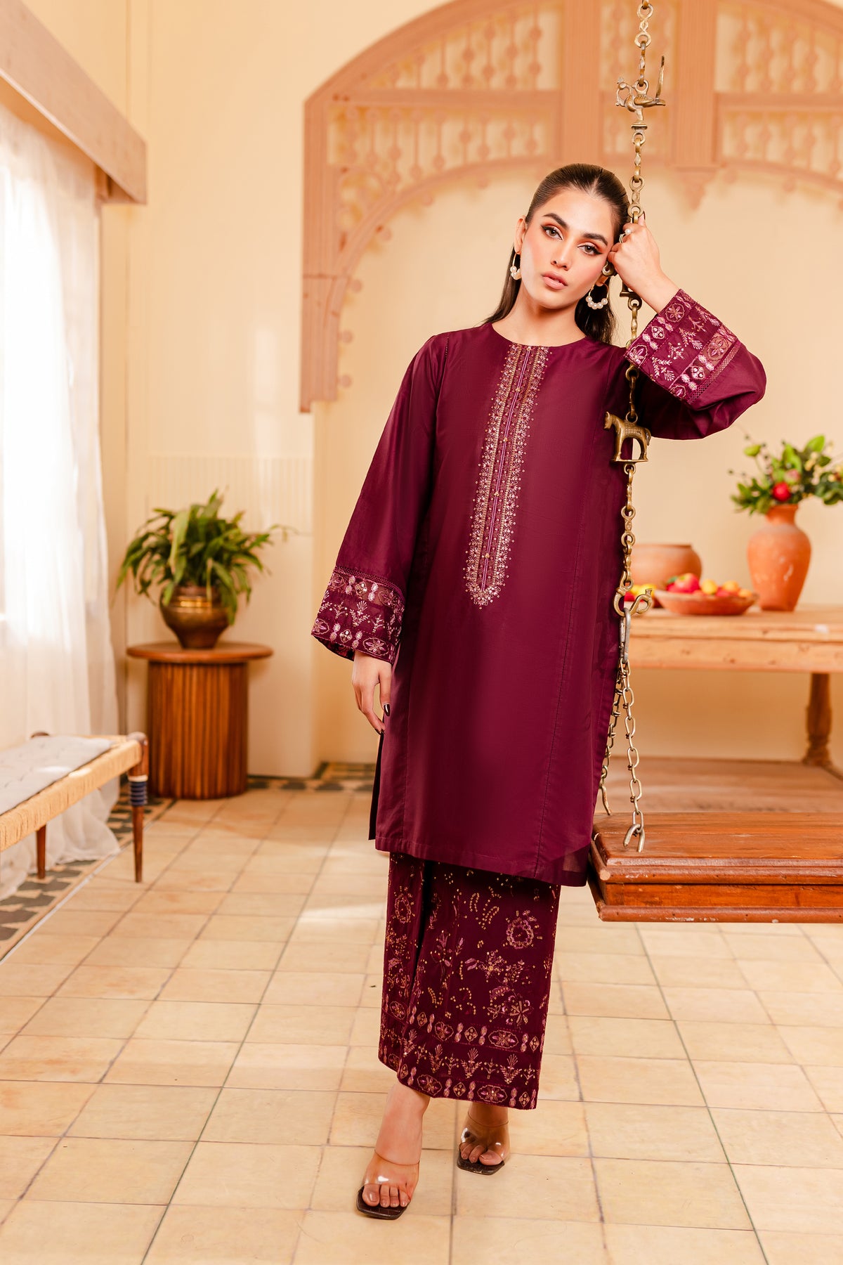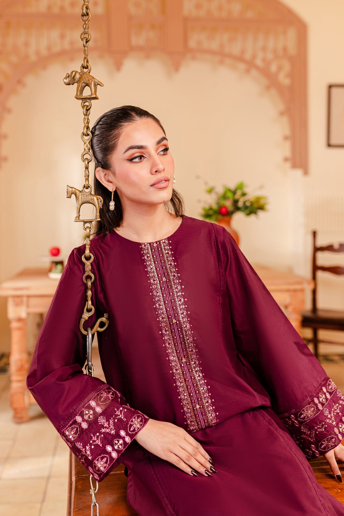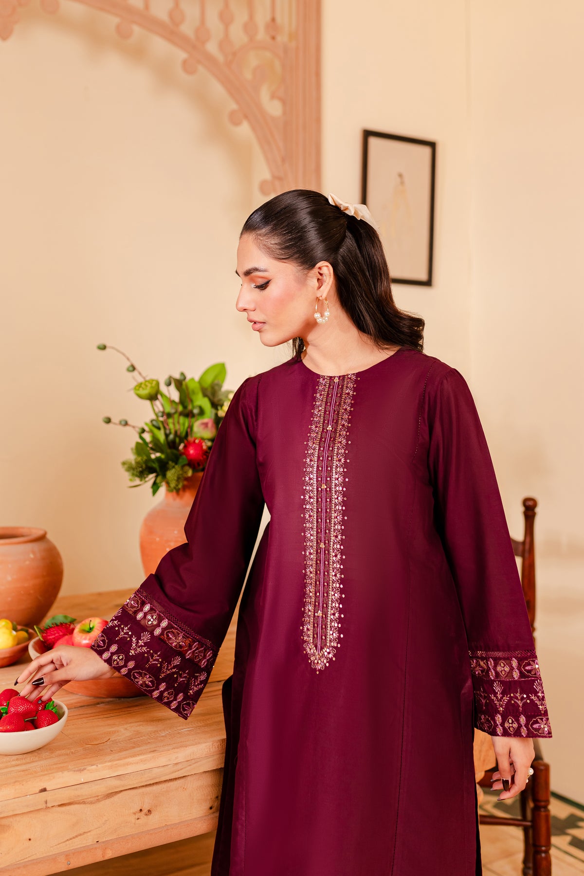 A chic and timeless addition to your wardrobe - our premium quality Pima lawn in the shades of burgundy exudes grace and charm. Uniquely designed straight fit paneled shirt displays fine embroidery at neckline touched up with collage embellishments. Adornments further include intricate embroidery at sleeves.