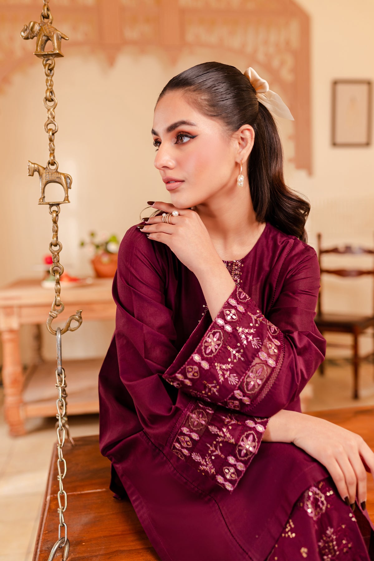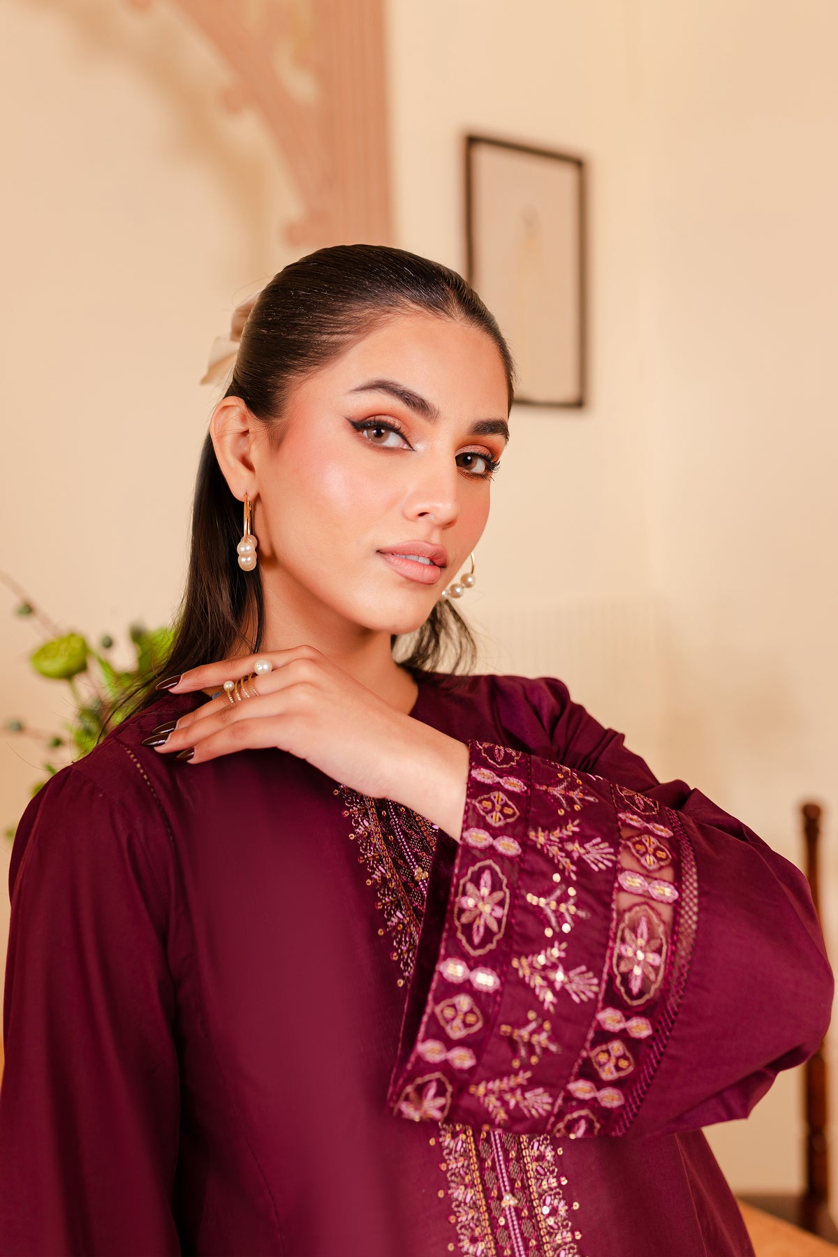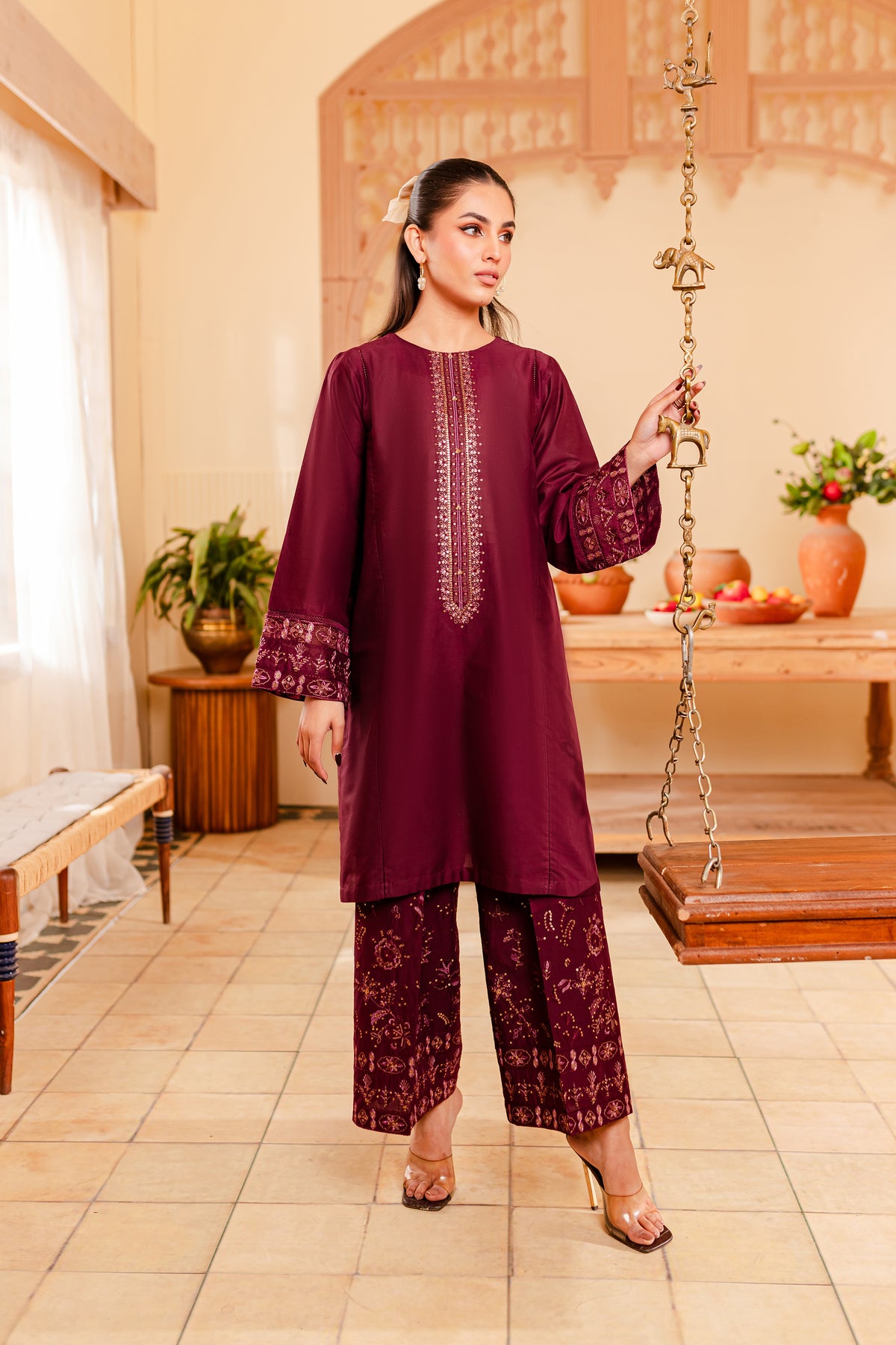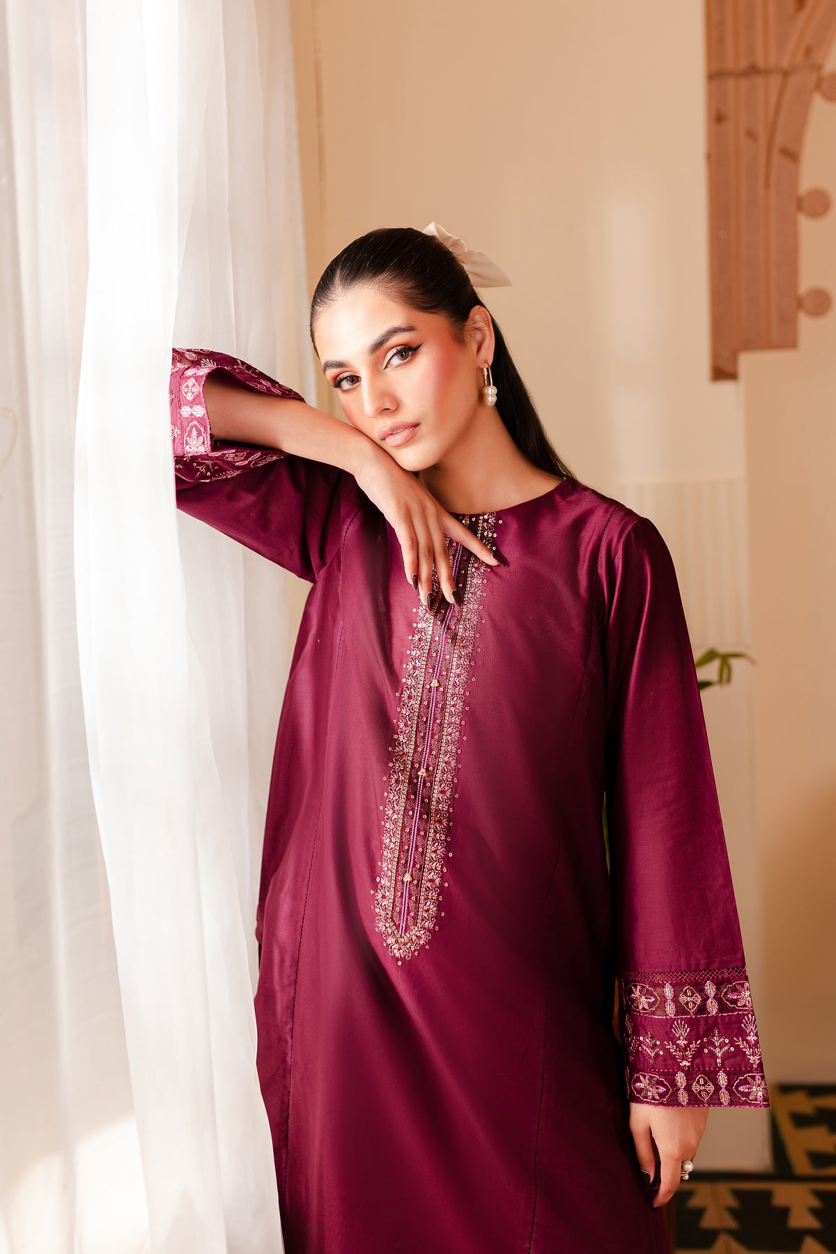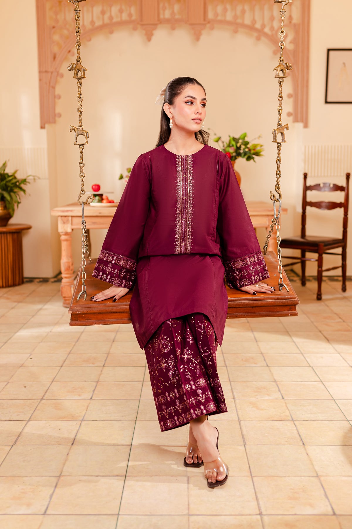 A chic and timeless addition to your wardrobe - our premium quality Pima lawn in the shades of burgundy exudes grace and charm. Uniquely designed straight fit paneled shirt displays fine embroidery at neckline touched up with collage embellishments. Adornments further include intricate embroidery at sleeves.