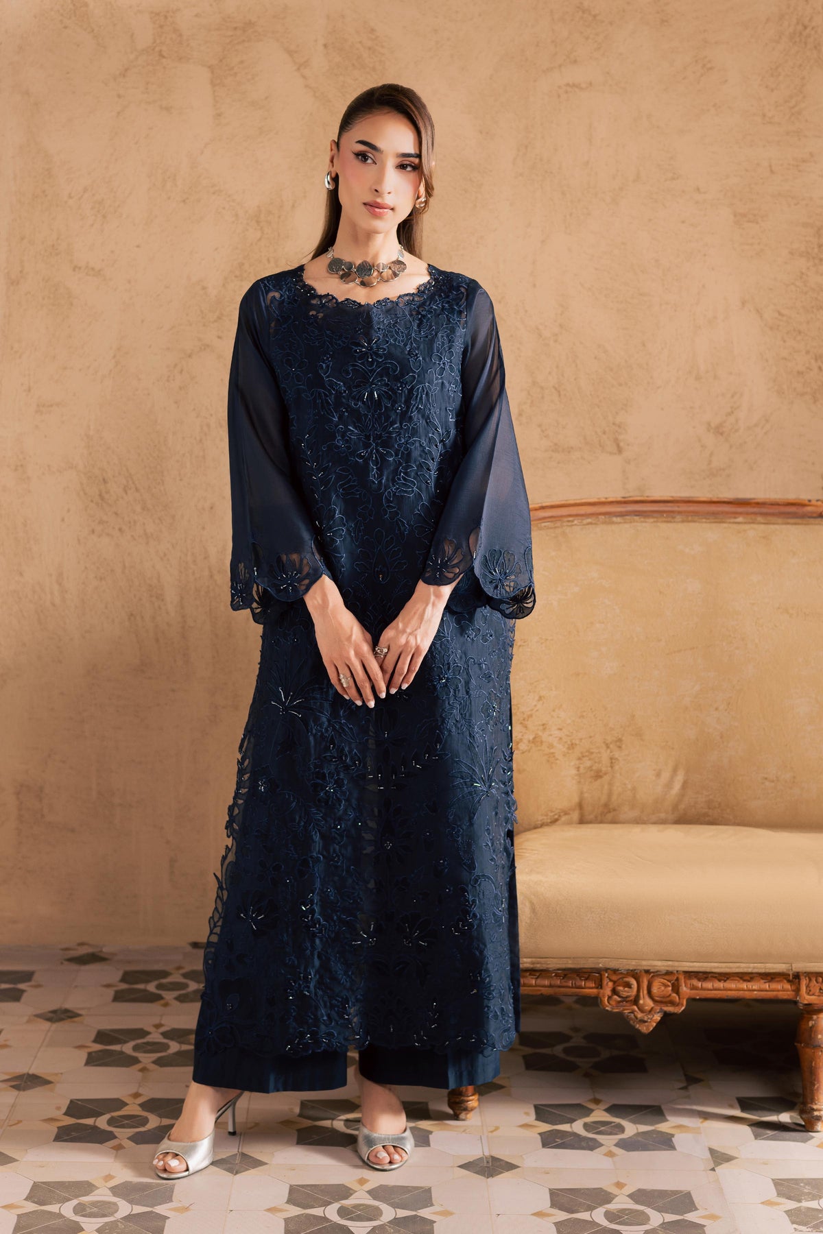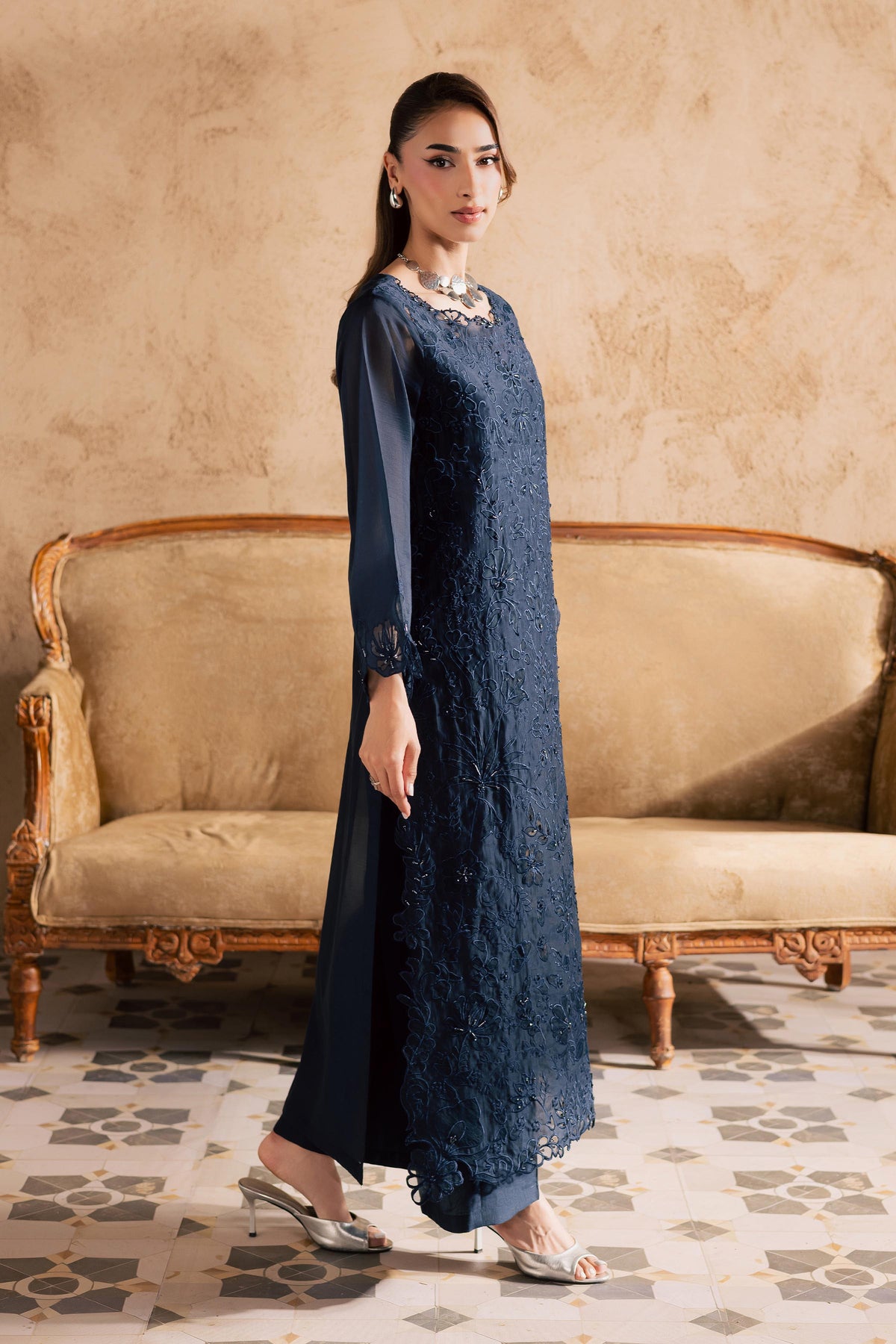 Crafted in paper silk, this ensemble features a heavily embroidered midnight blue shirt with intricate inlay embroidery across the front, enhanced with delicate adda detailing for a refined finish.