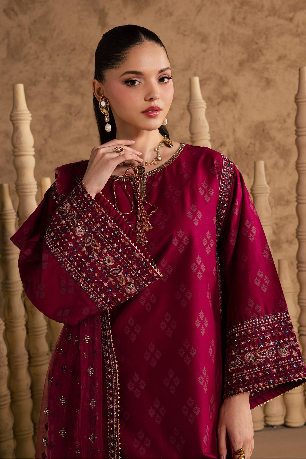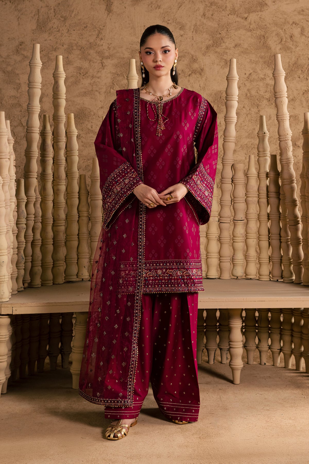 A net embroidered dupatta completes the ensemble, adding delicate texture and a refined finishing touch that elevates the festive appeal.