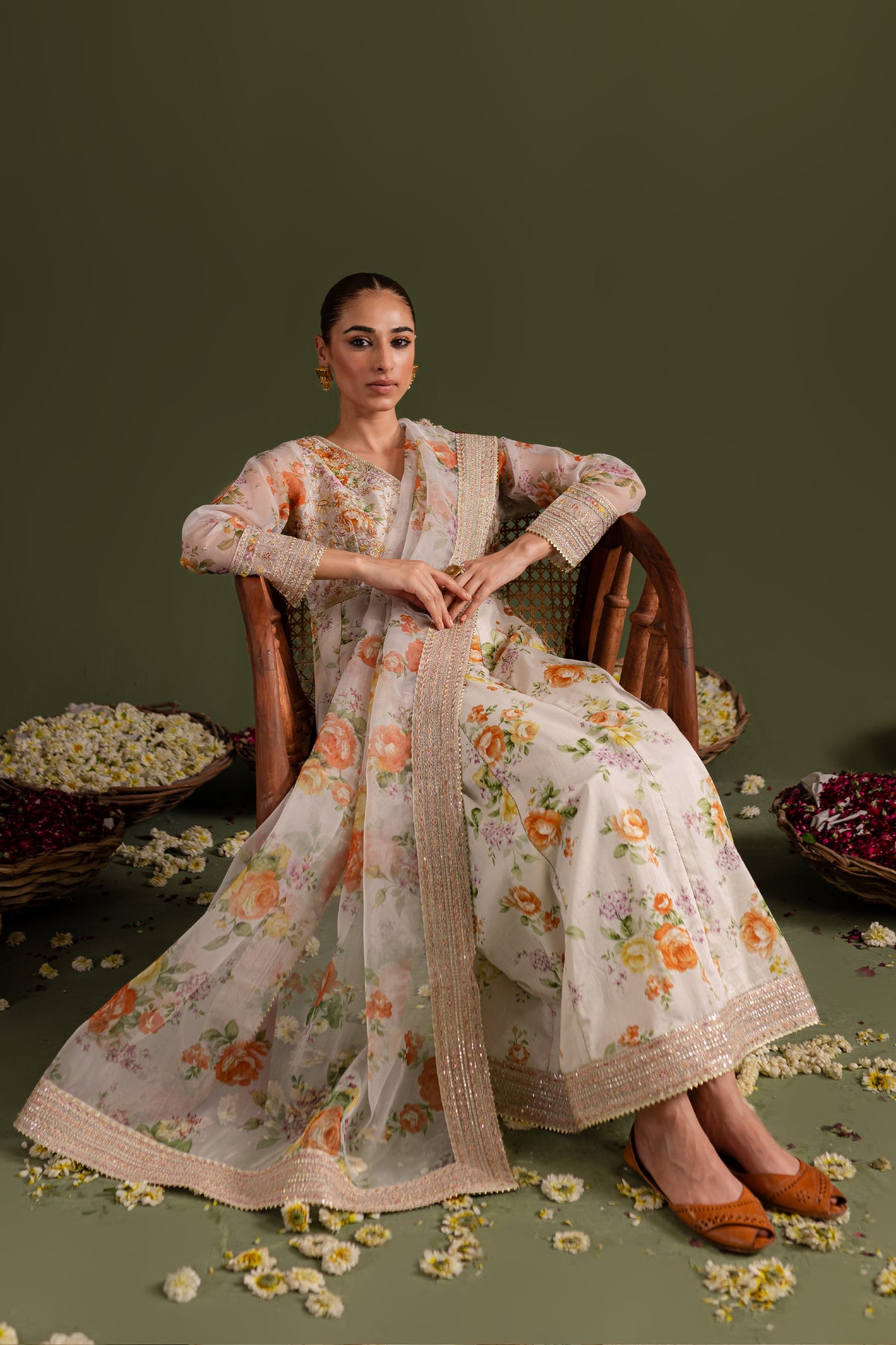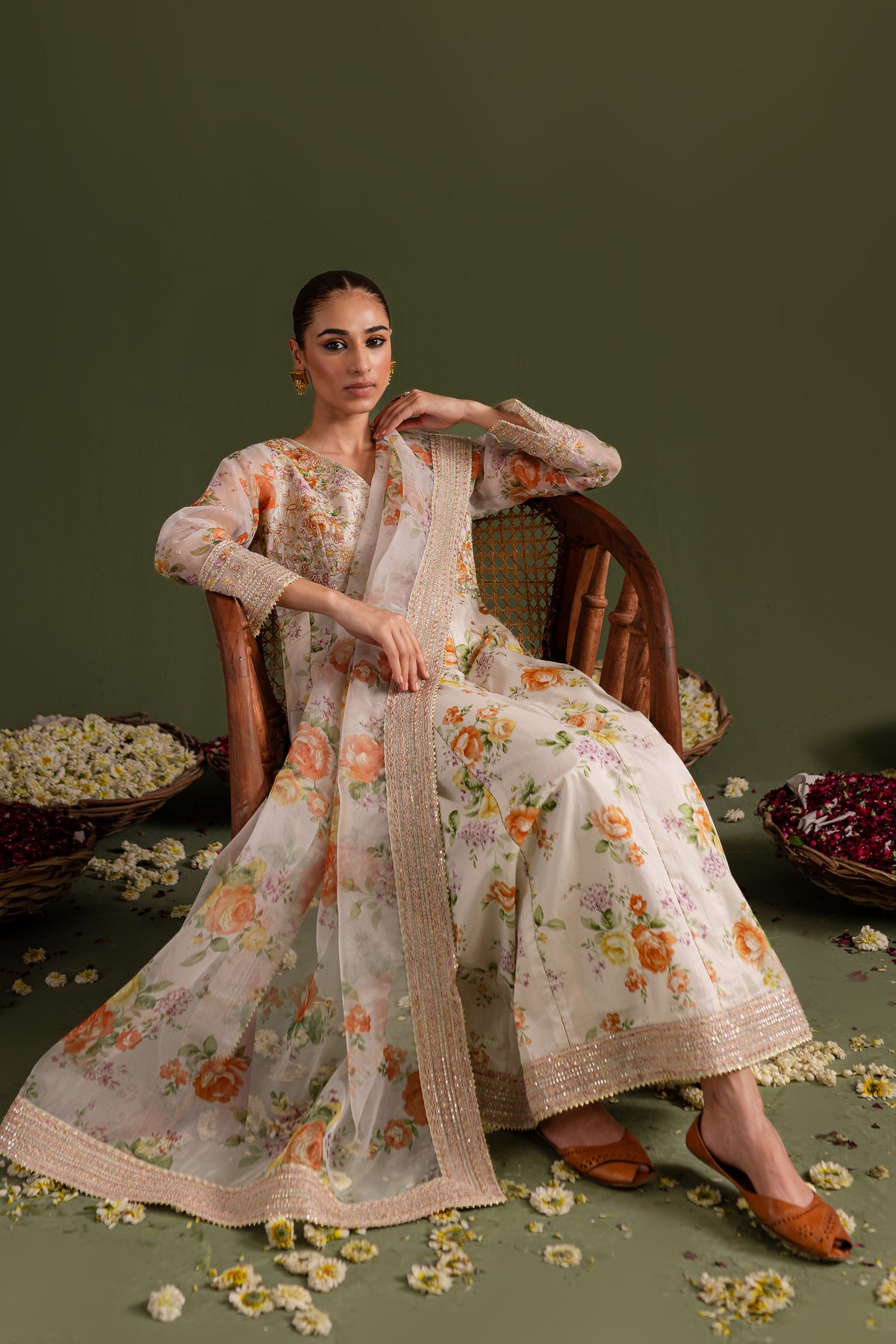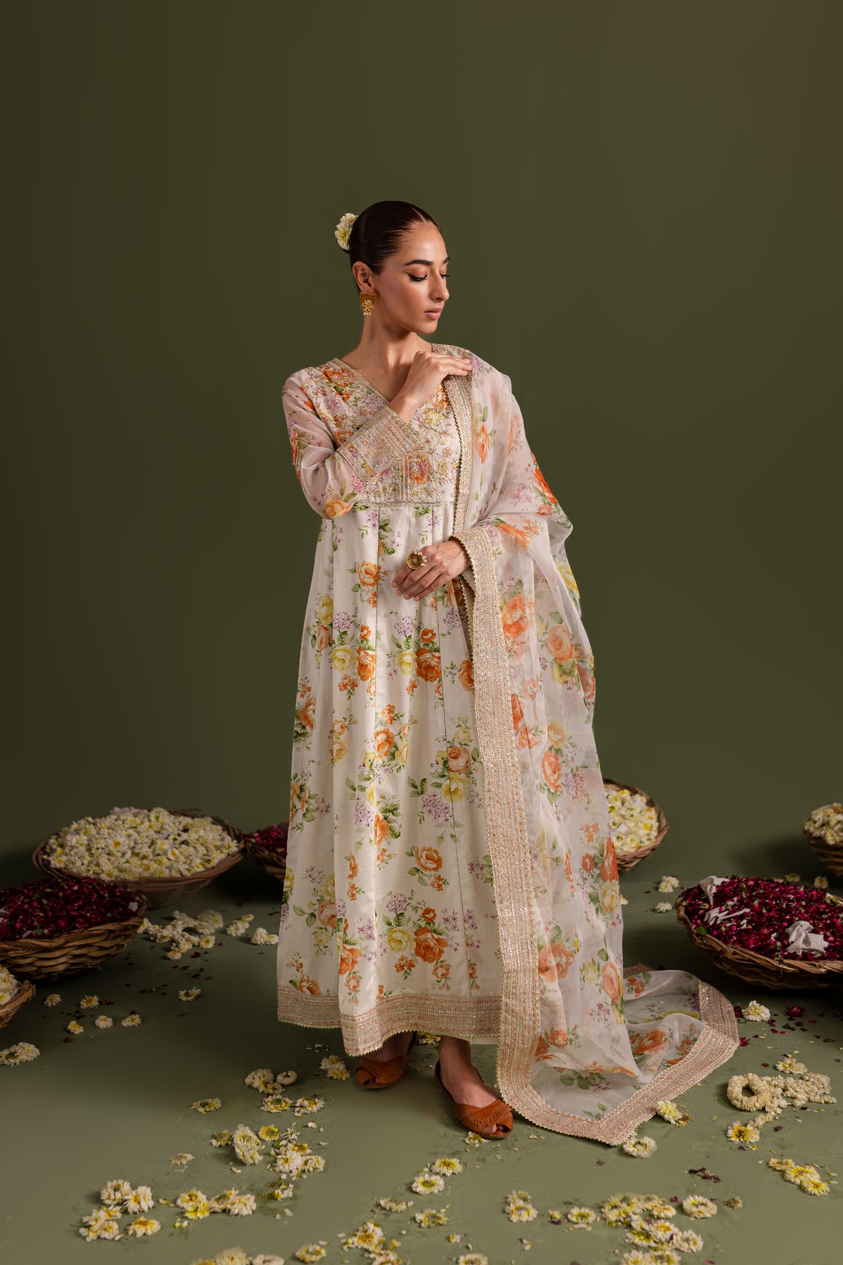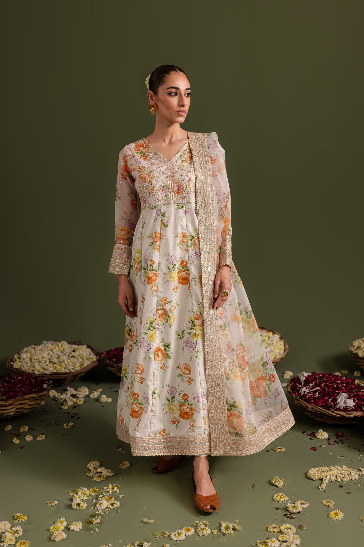 Comes with a printed organza dupatta having embroidered borders on all four sides touched up with lace.