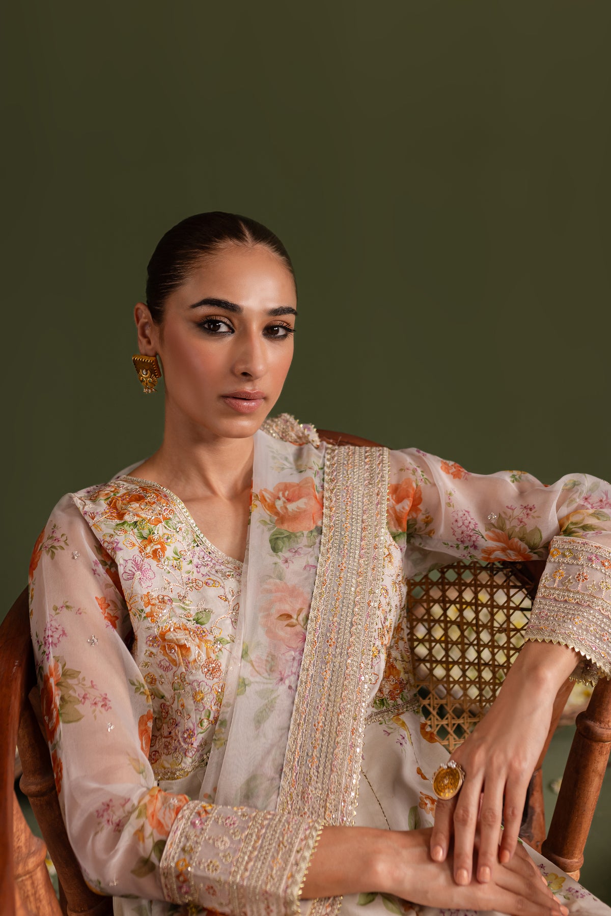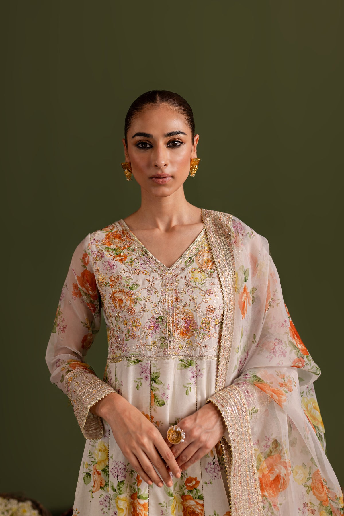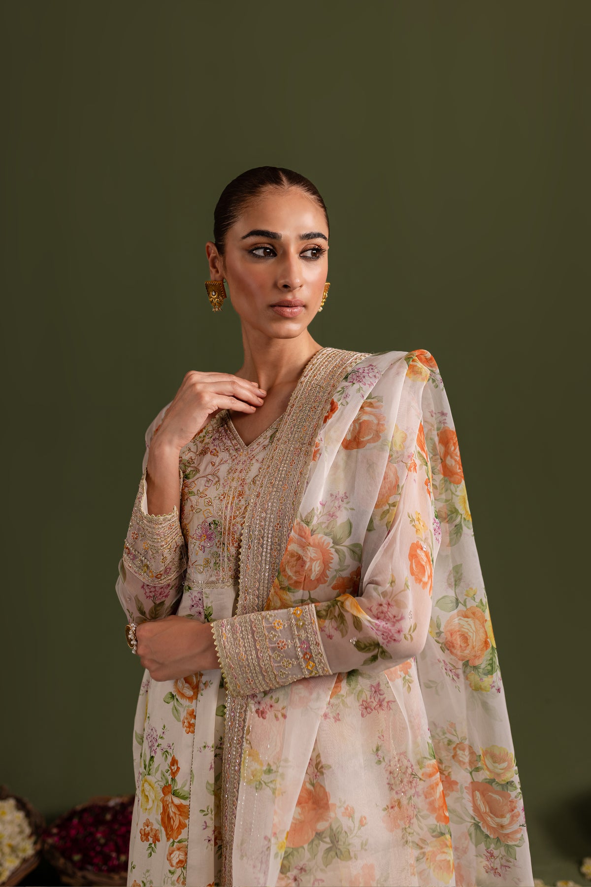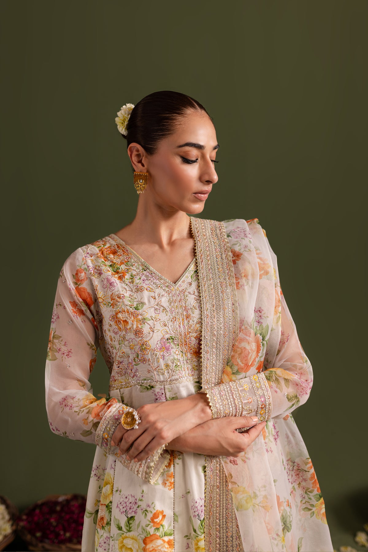Comes with a printed organza dupatta having embroidered borders on all four sides touched up with lace.