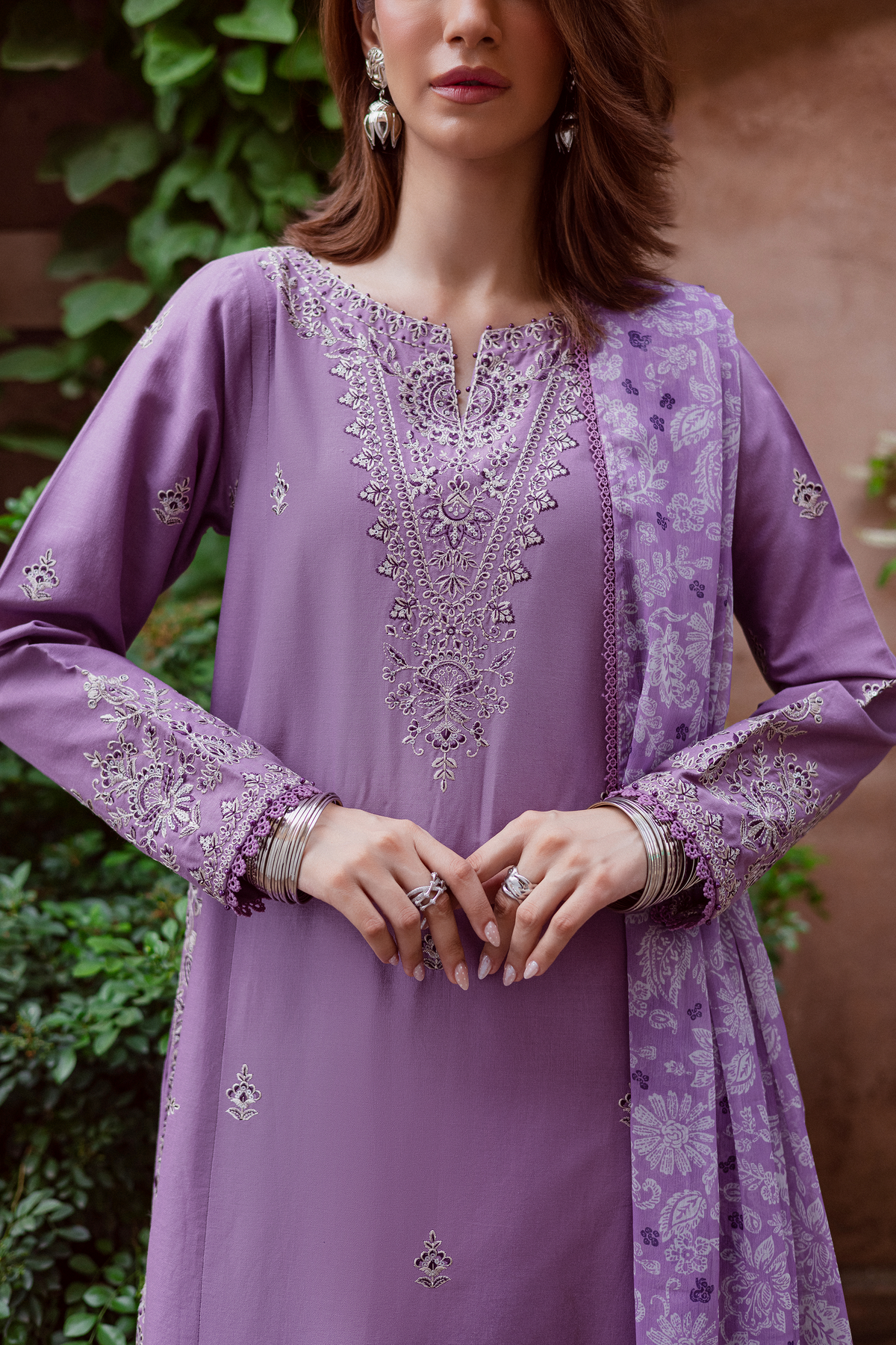 This 3-piece khaddar ensemble exudes understated luxury with its embroidered paneled shirt, designed to showcase meticulous craftsmanship. The sleeves are adorned with delicate embroidery and finished with crochet lace, adding a touch of refined elegance to the silhouette.