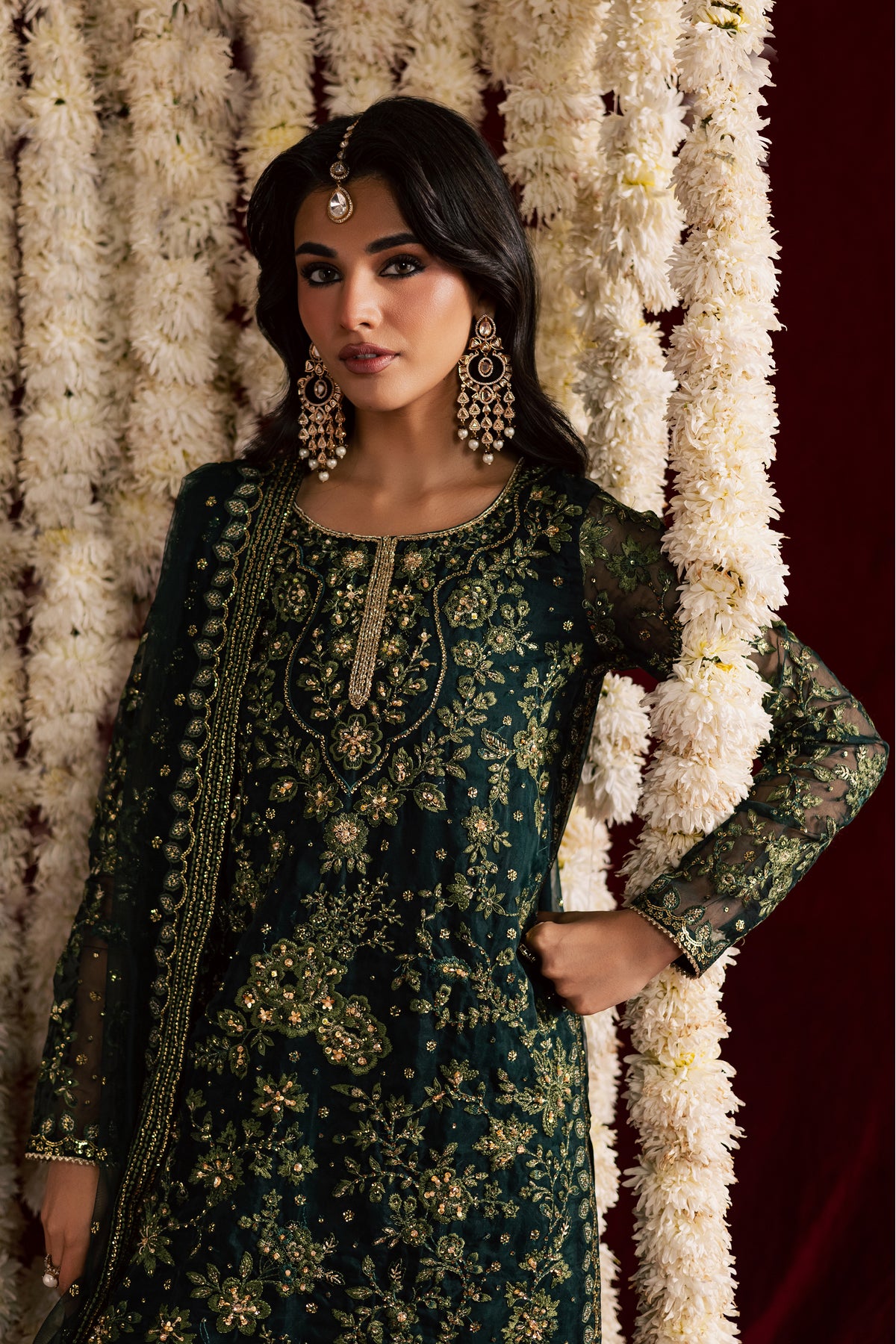 The long green organza shirt is adorned with all-over embroidery, enhanced with intricate adda work for a luxurious finish. Featuring a boat neckline and fully fitted sleeves, it combines elegance with a contemporary silhouette.