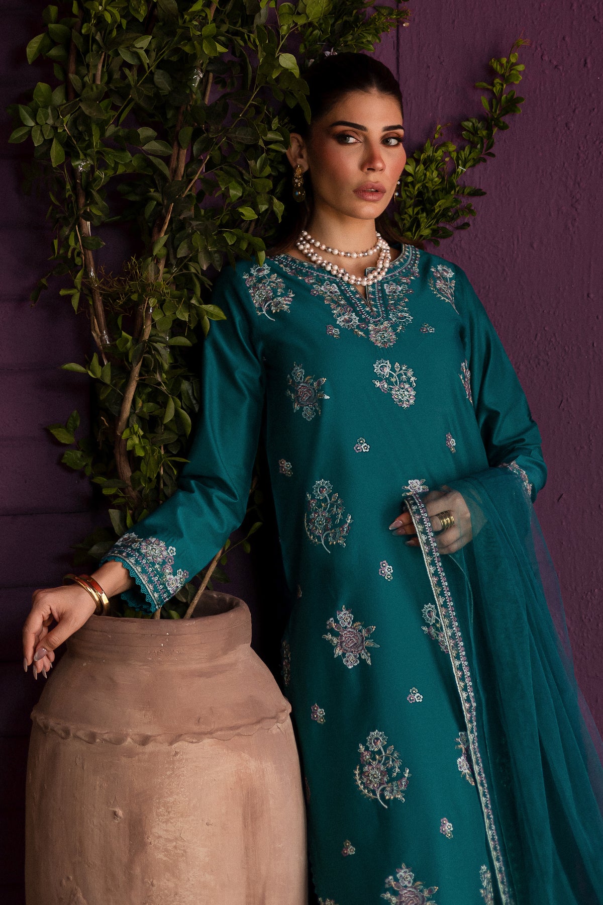 The shirt is paired with an embroidered cambric farshi shalwar with embroidery along the hem enhances its graceful flare and adds richness to the ensemble.
