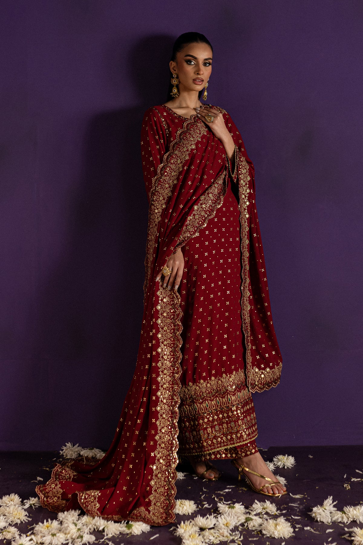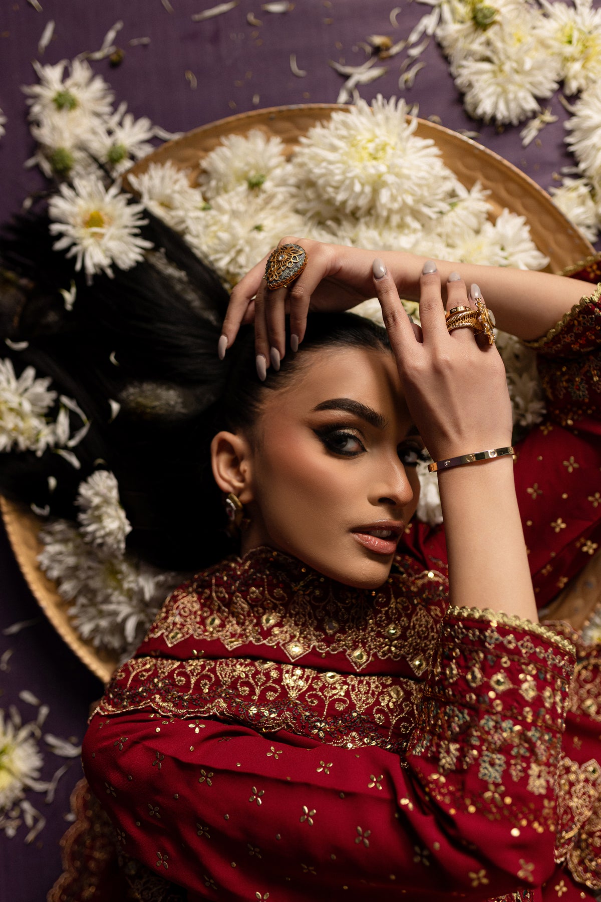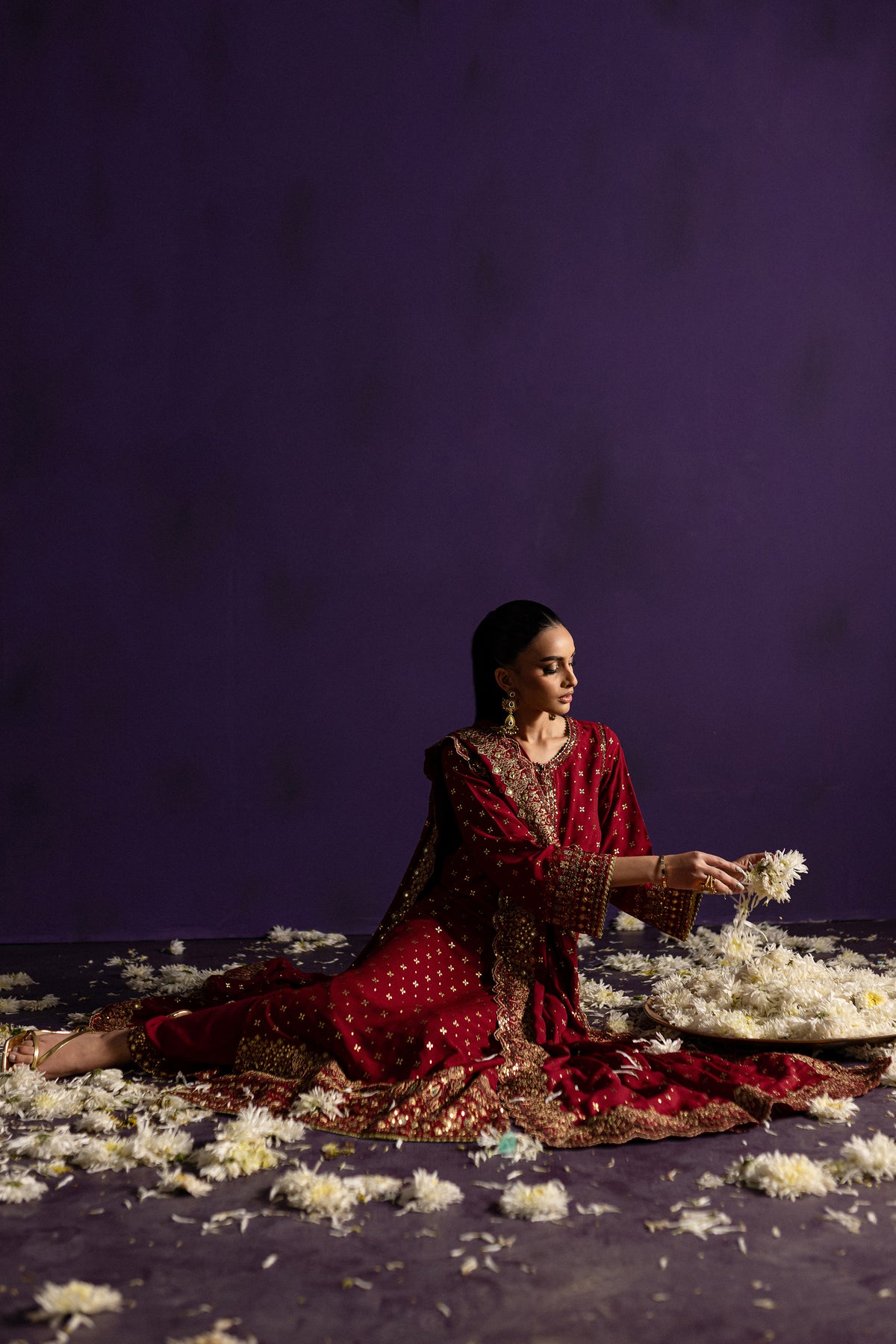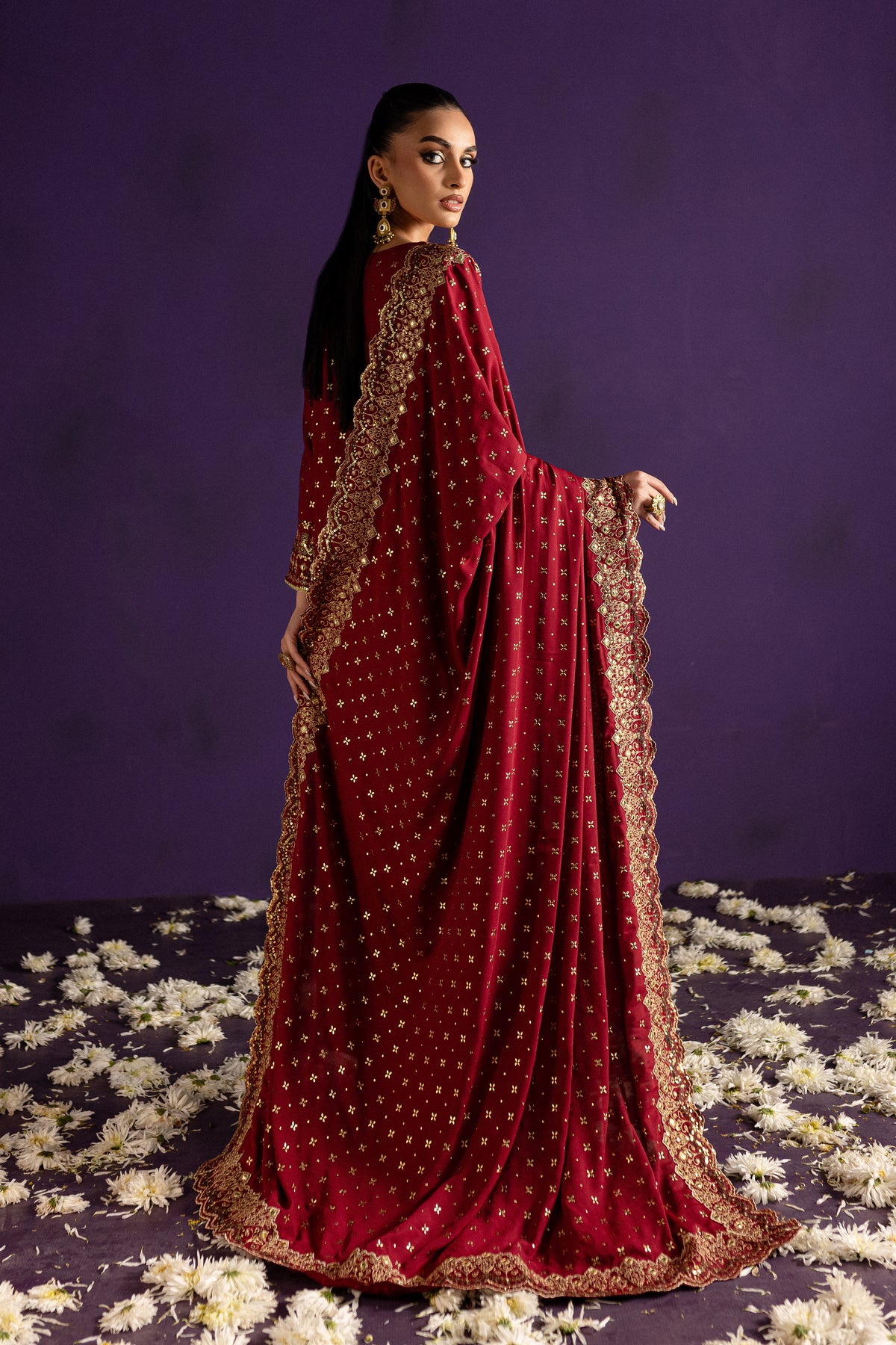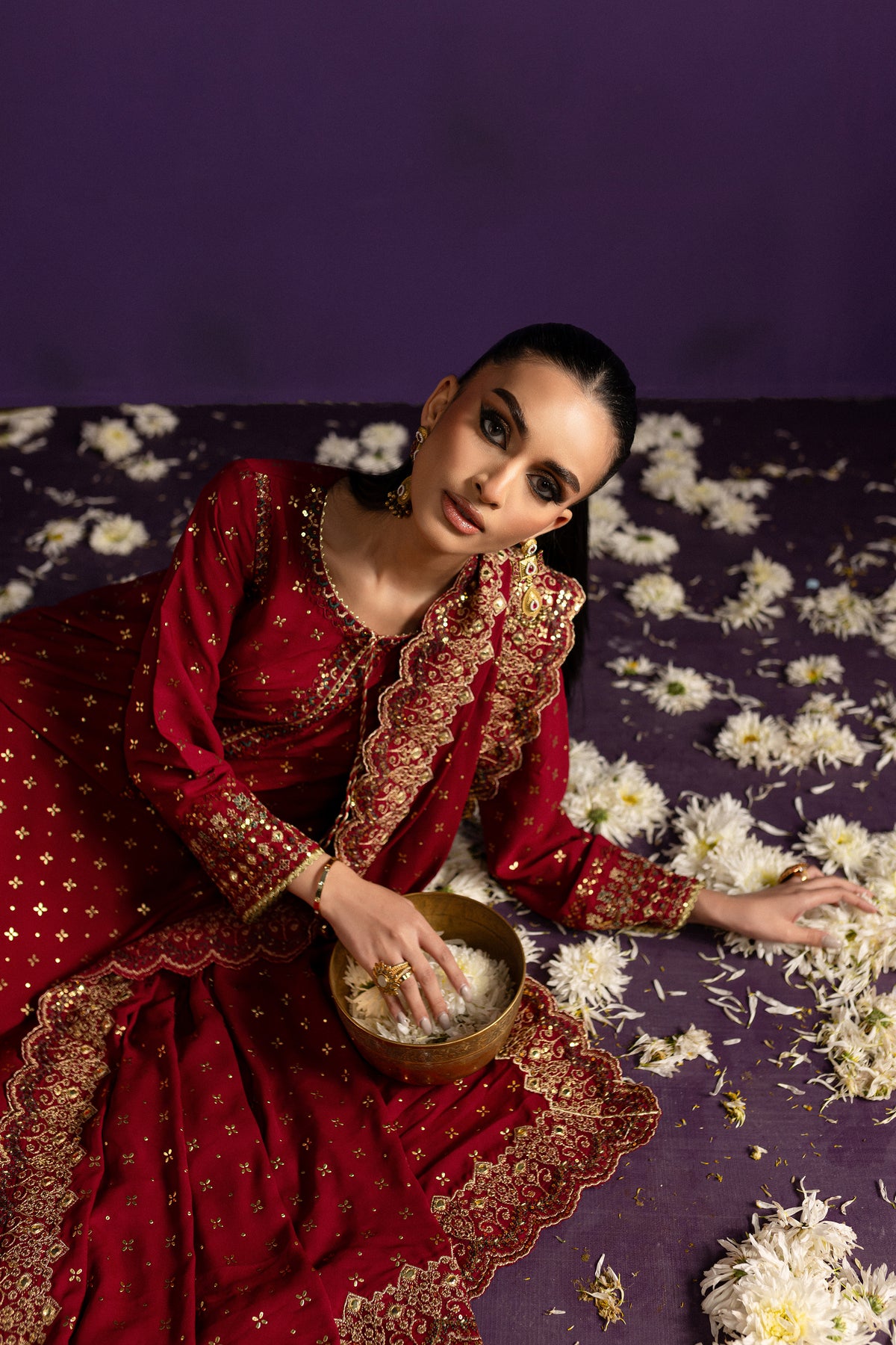 The look is elevated with a metallic foil-printed Georgette chiffon embroidered dupatta, adding an ethereal touch.