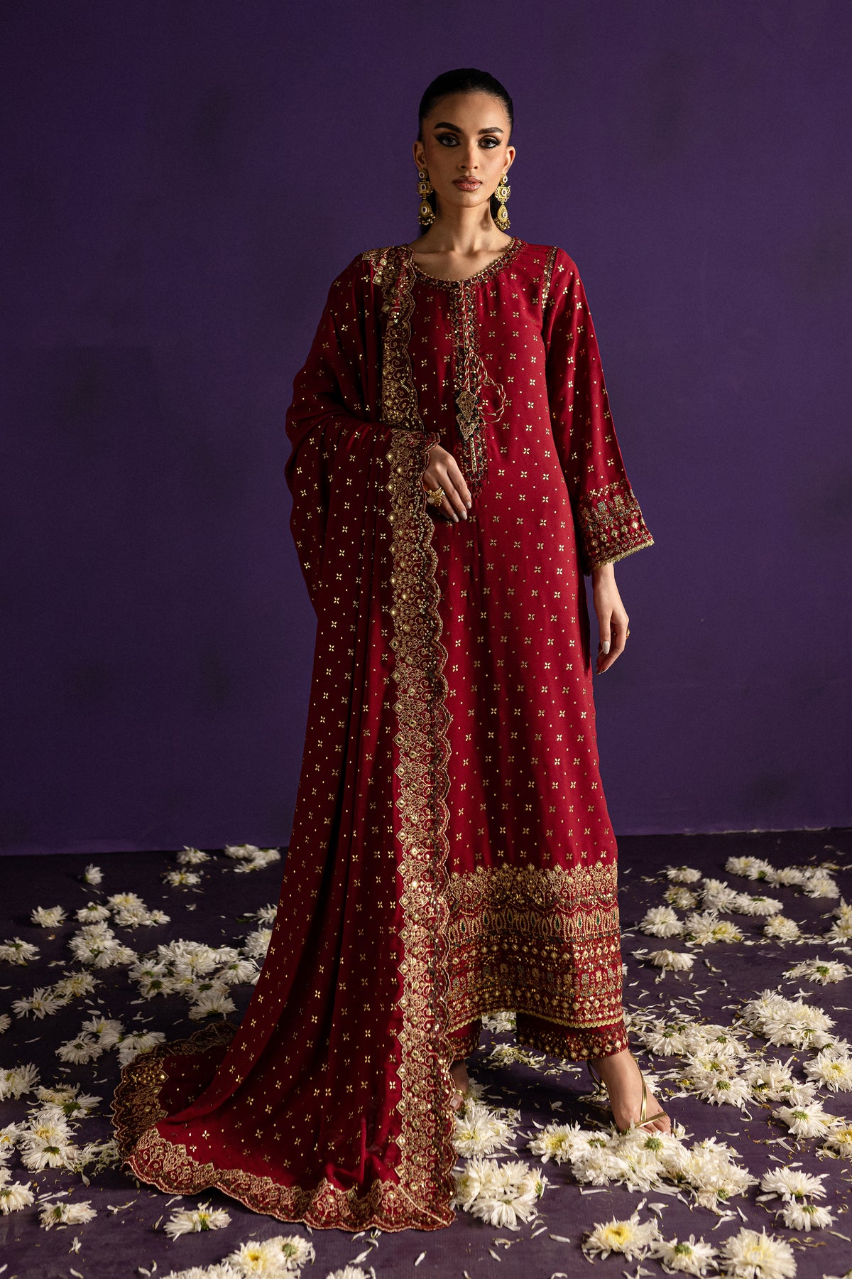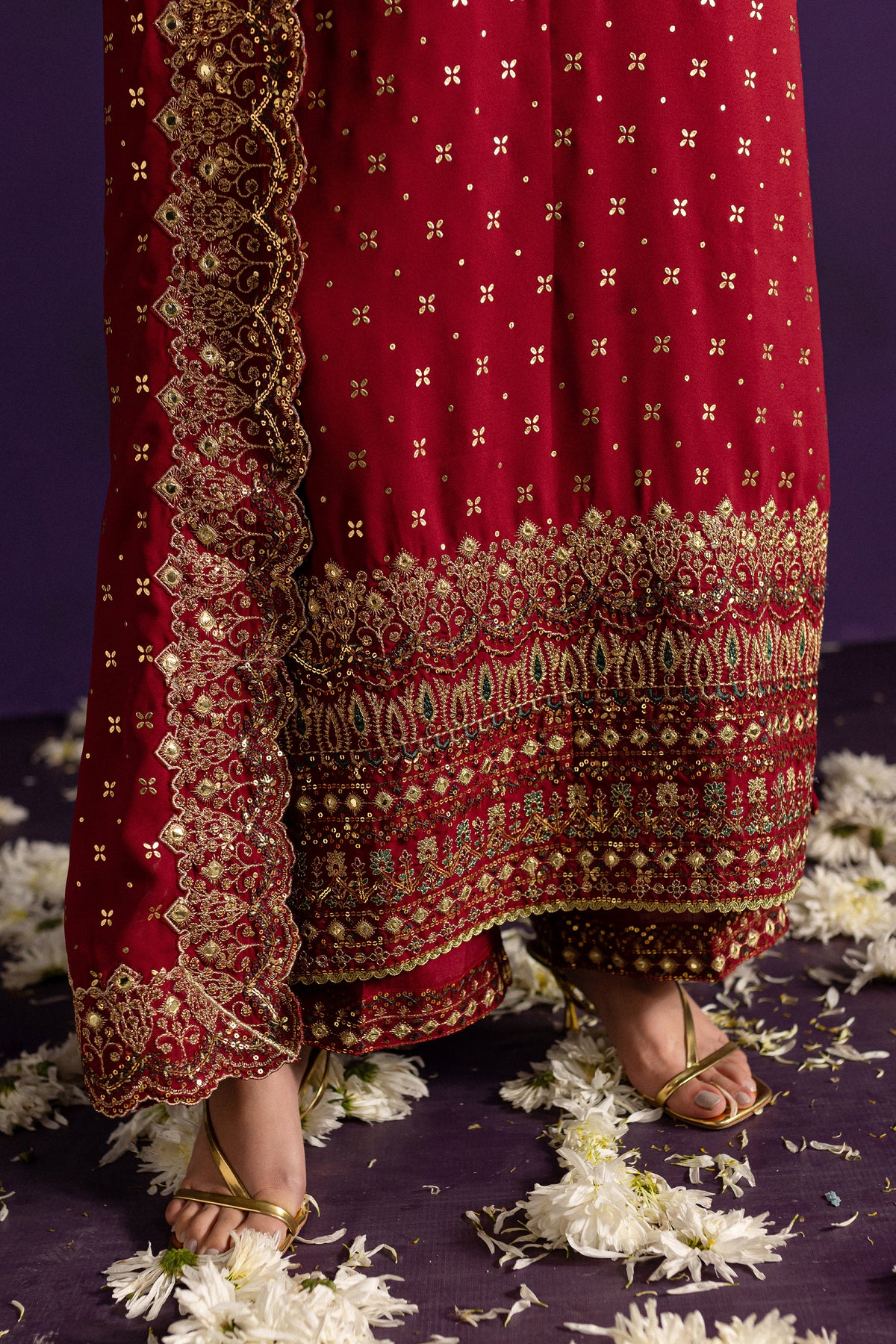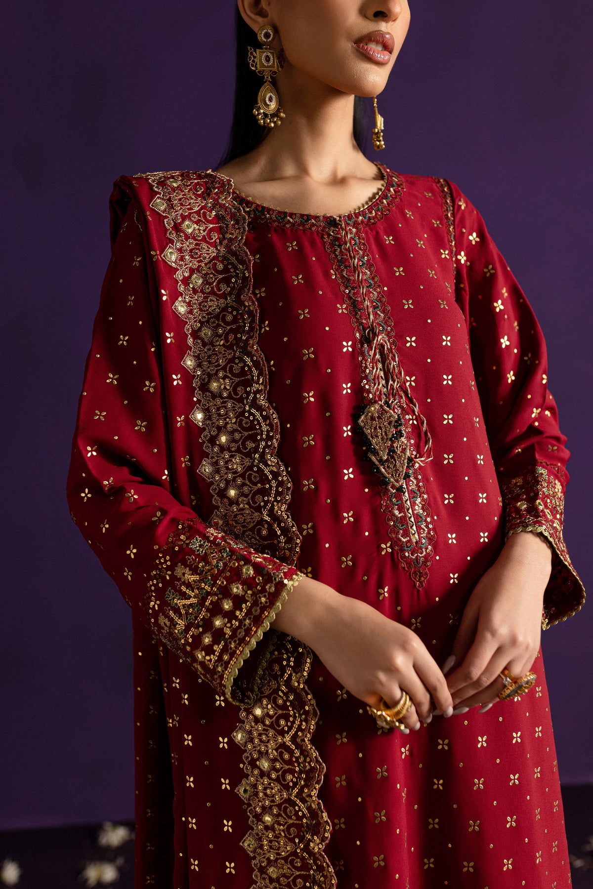 Exude timeless sophistication with this exquisite red metallic foil Georgette chiffon straight long shirt. Detailed embroidery on the neckline, hem, and sleeve borders enhances the elegance of this refined design.