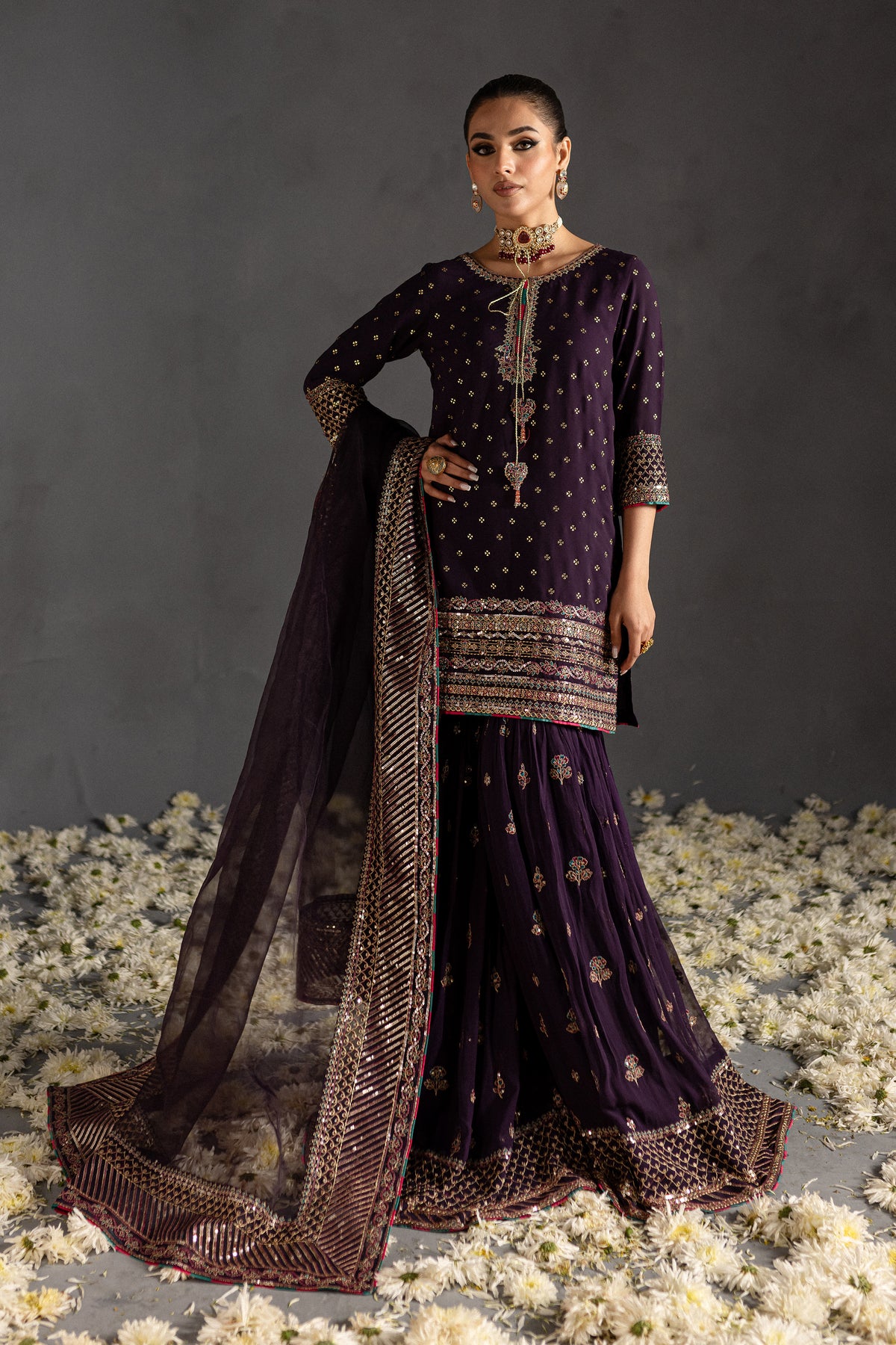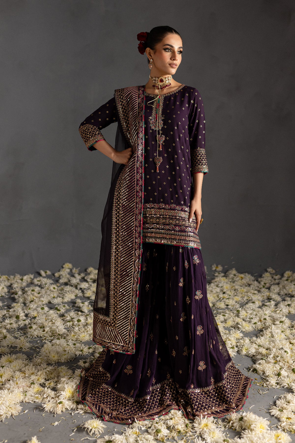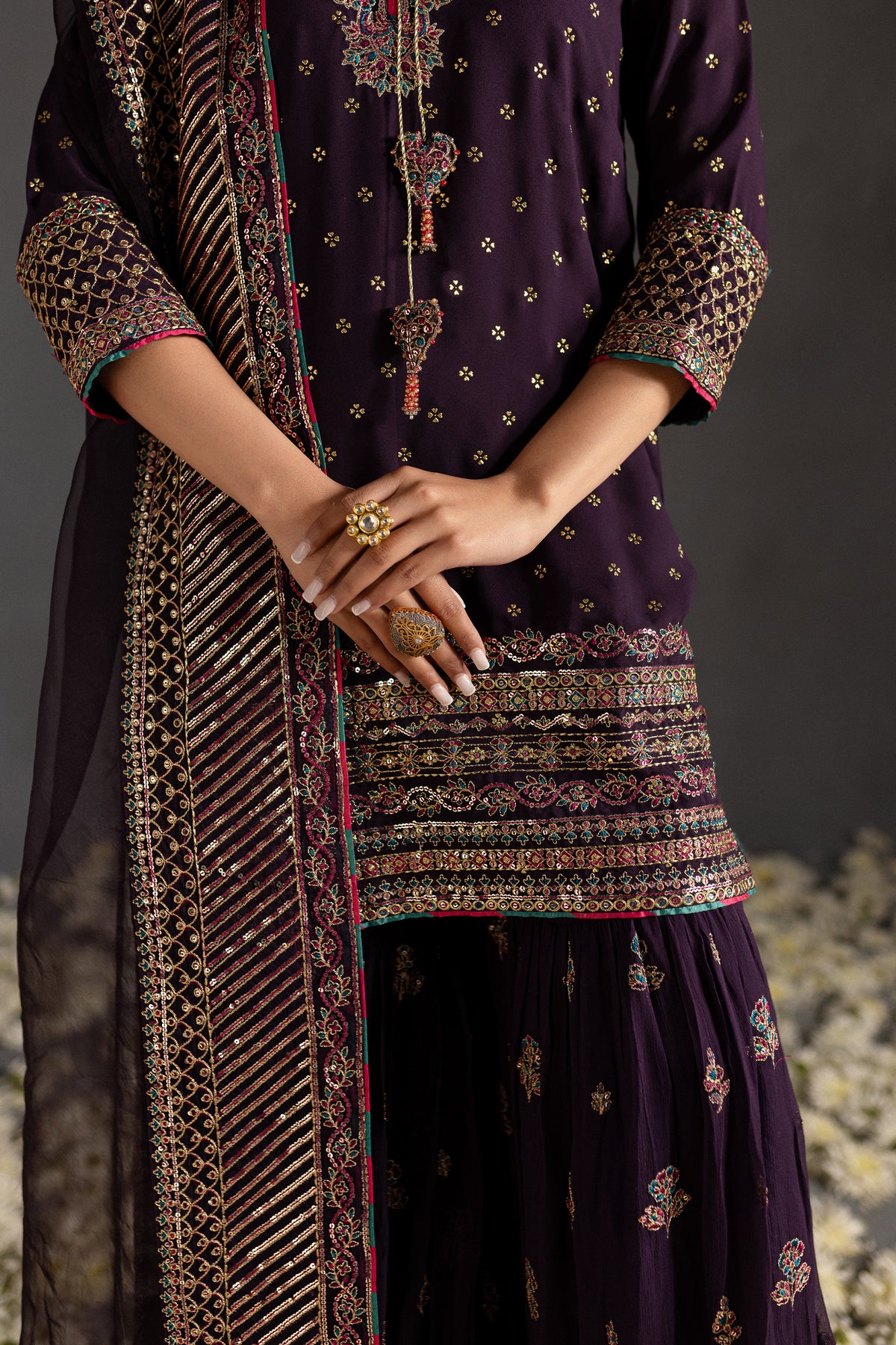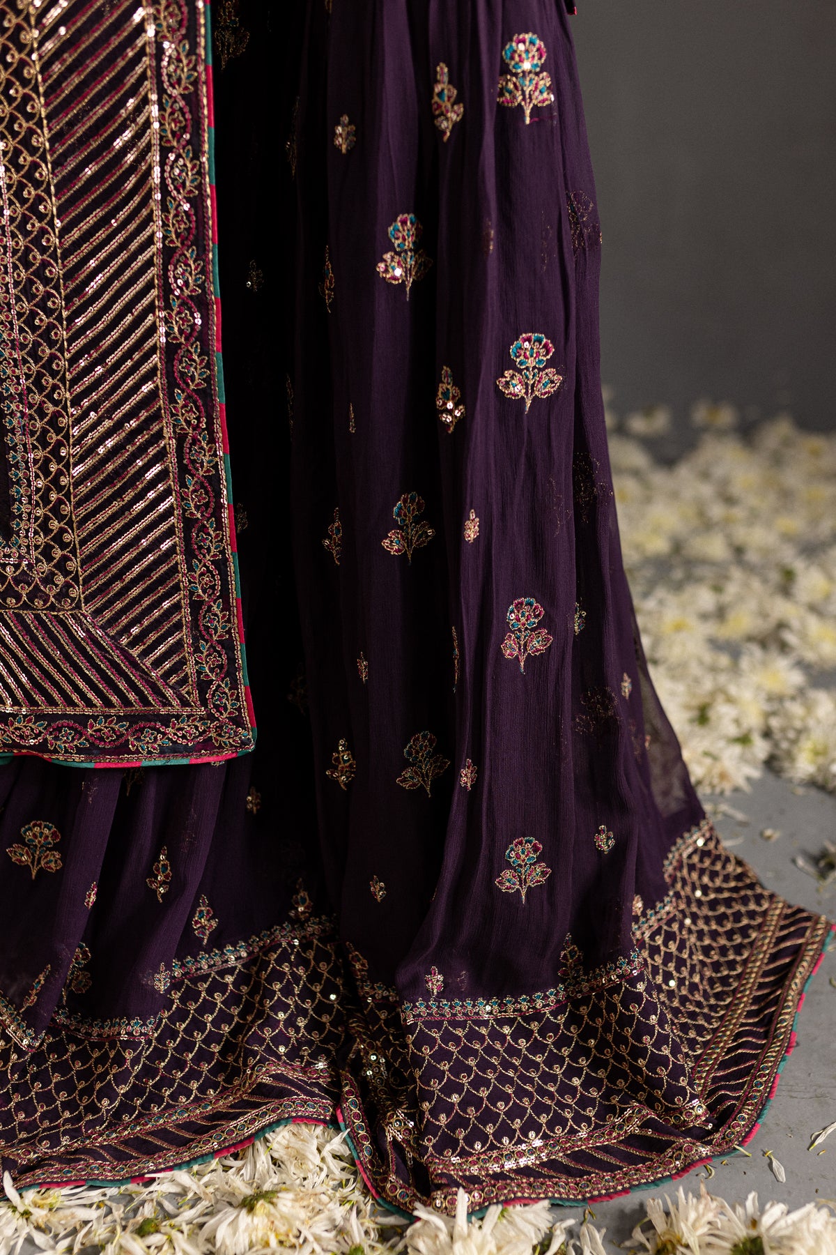 Paired with a crinkle embroidery gharara, the trouser adds graceful movement to the outfit, enhancing the overall flow.