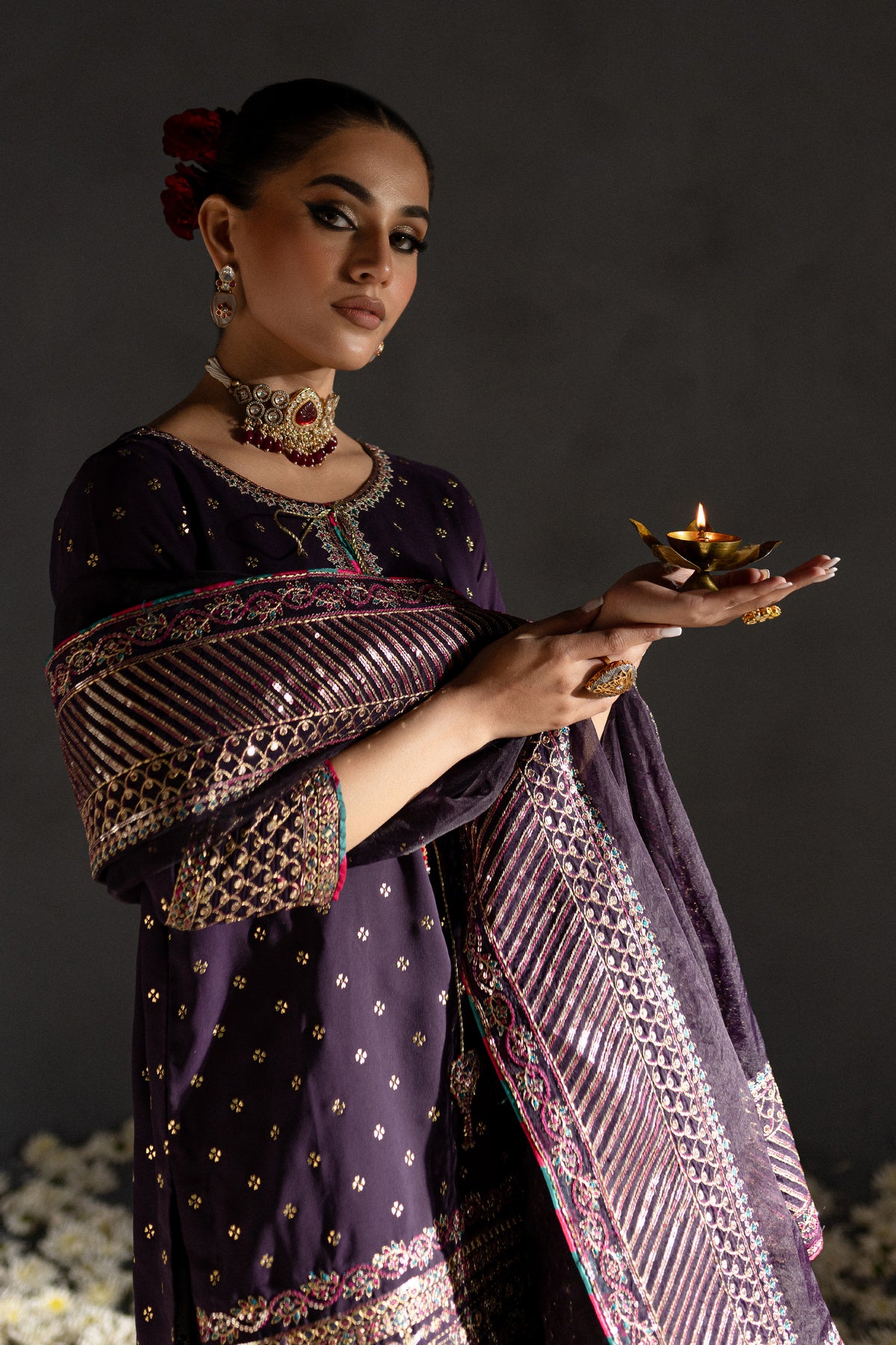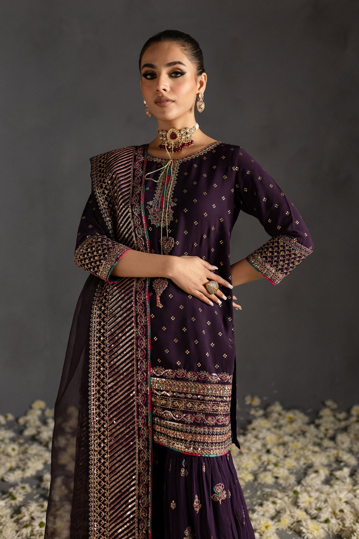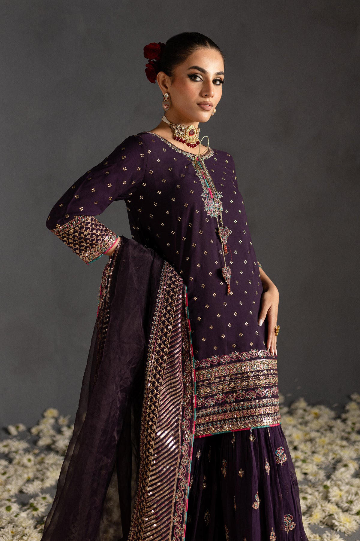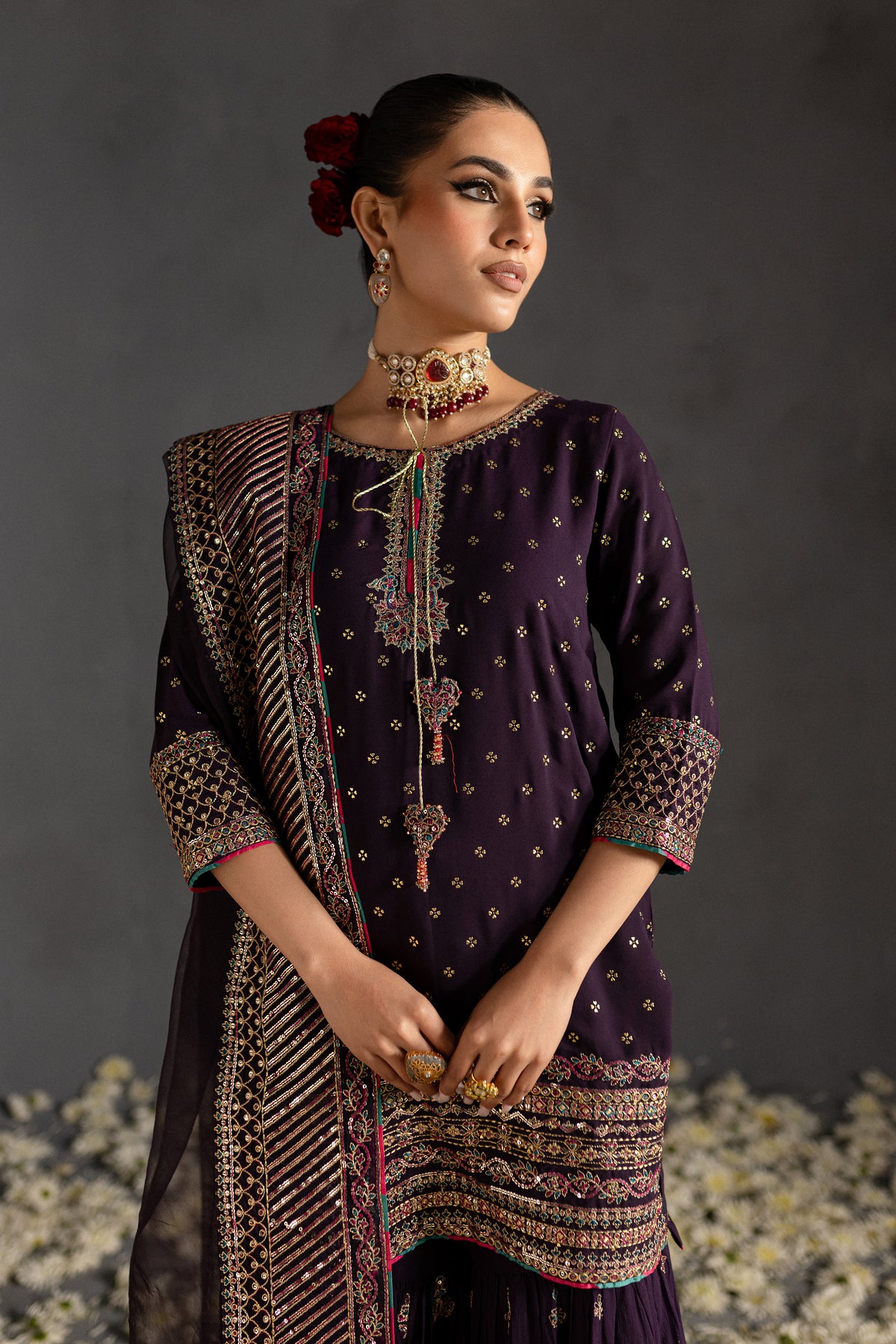 Paired with a crinkle embroidery gharara, the trouser adds graceful movement to the outfit, enhancing the overall flow.