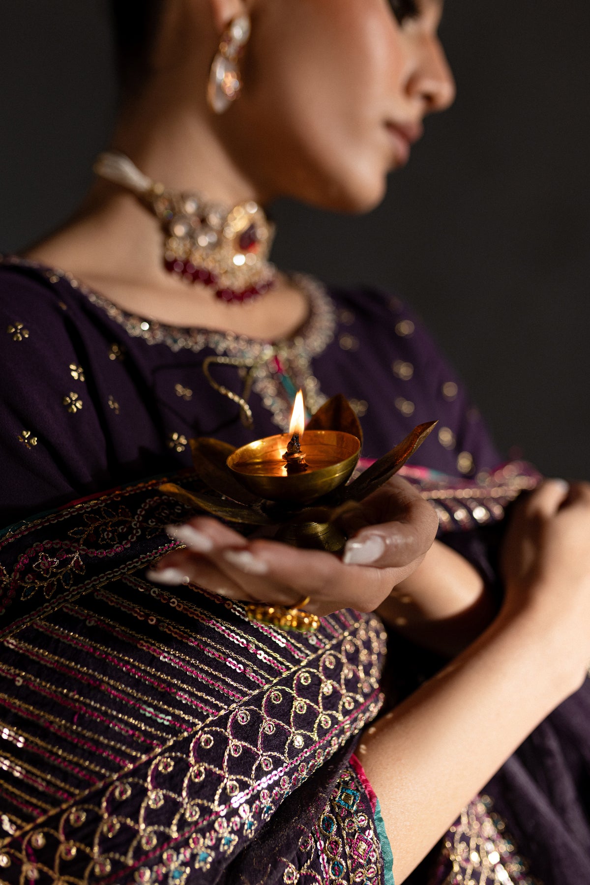 The look is finished with a metallic foil georgette chiffon embroidered dupatta, complementing the rest of the ensemble with its delicate embroidery and luxurious finish.