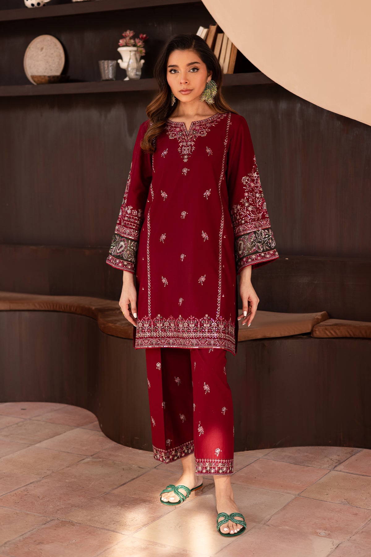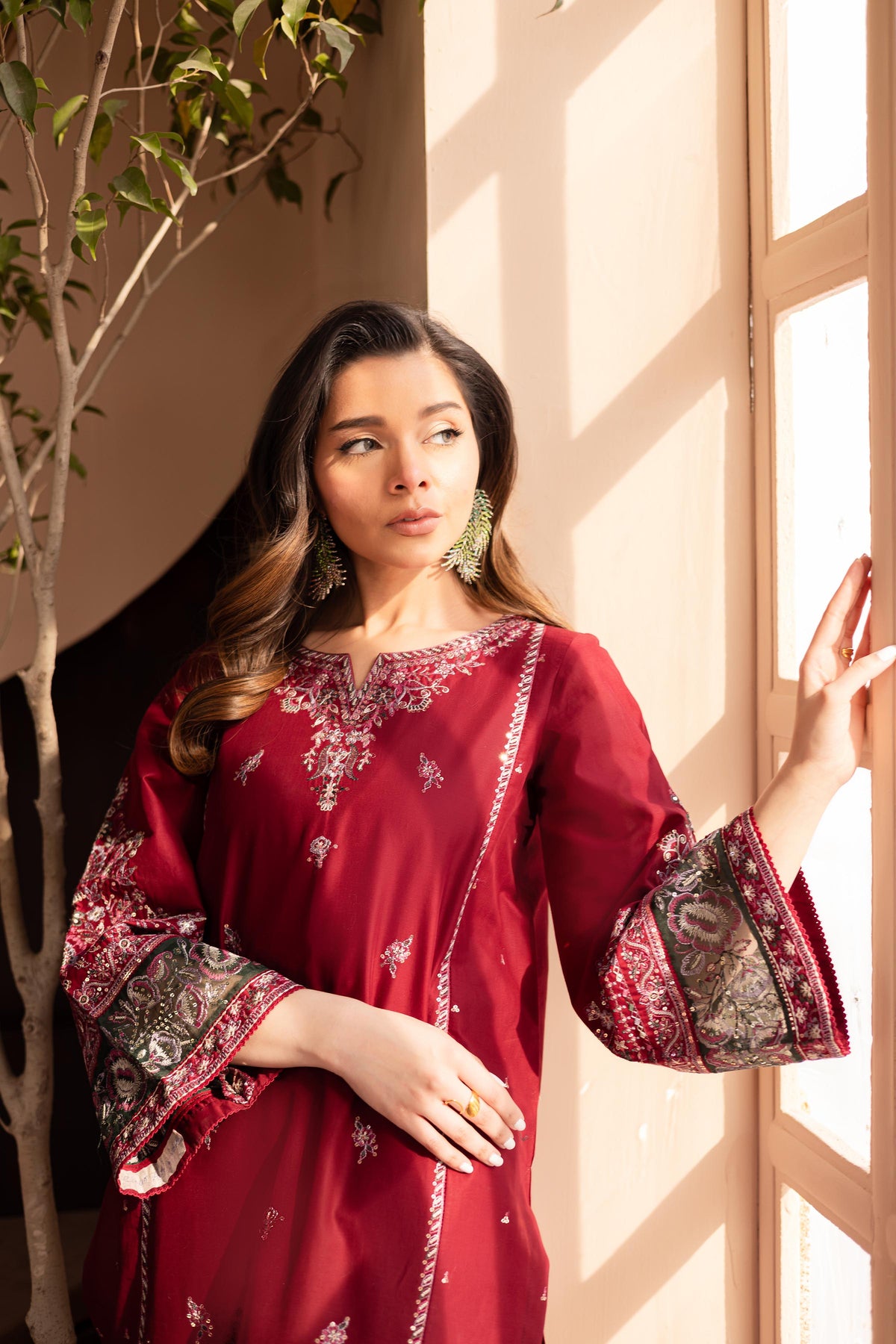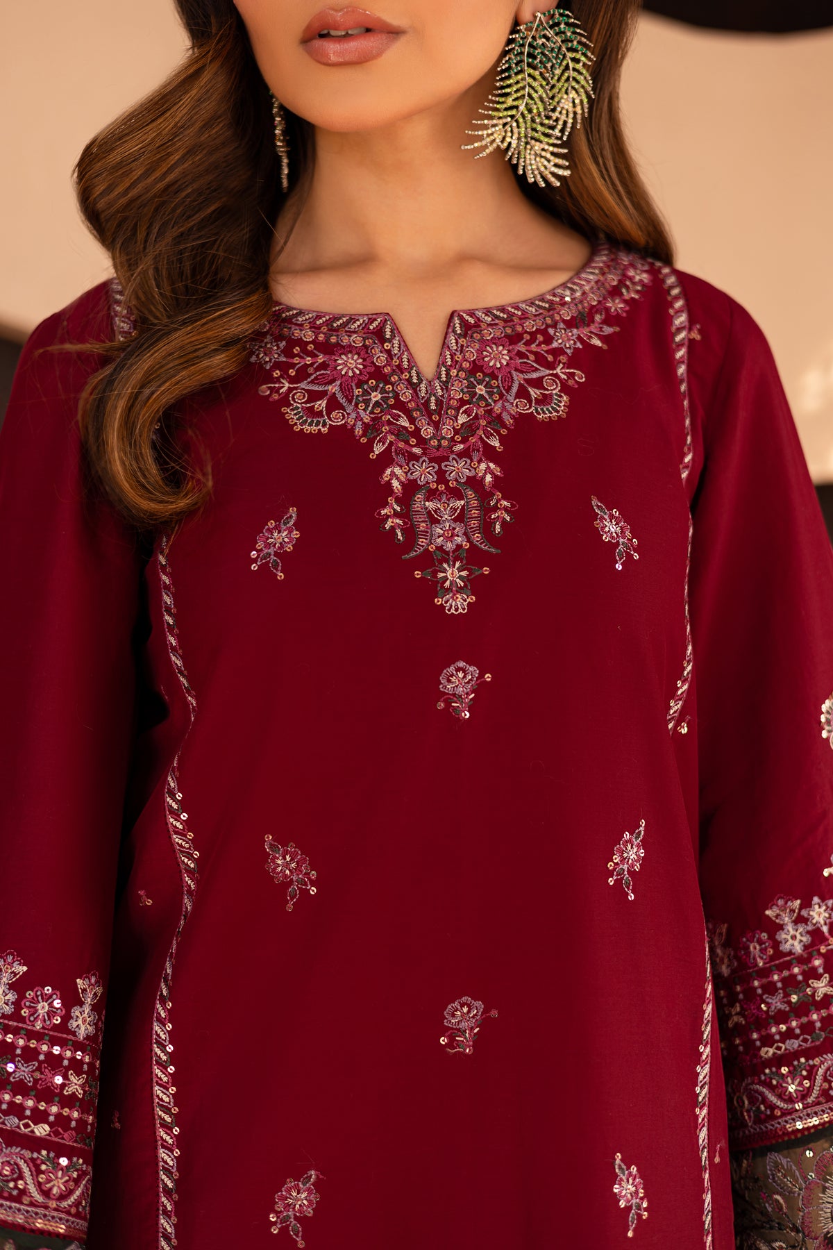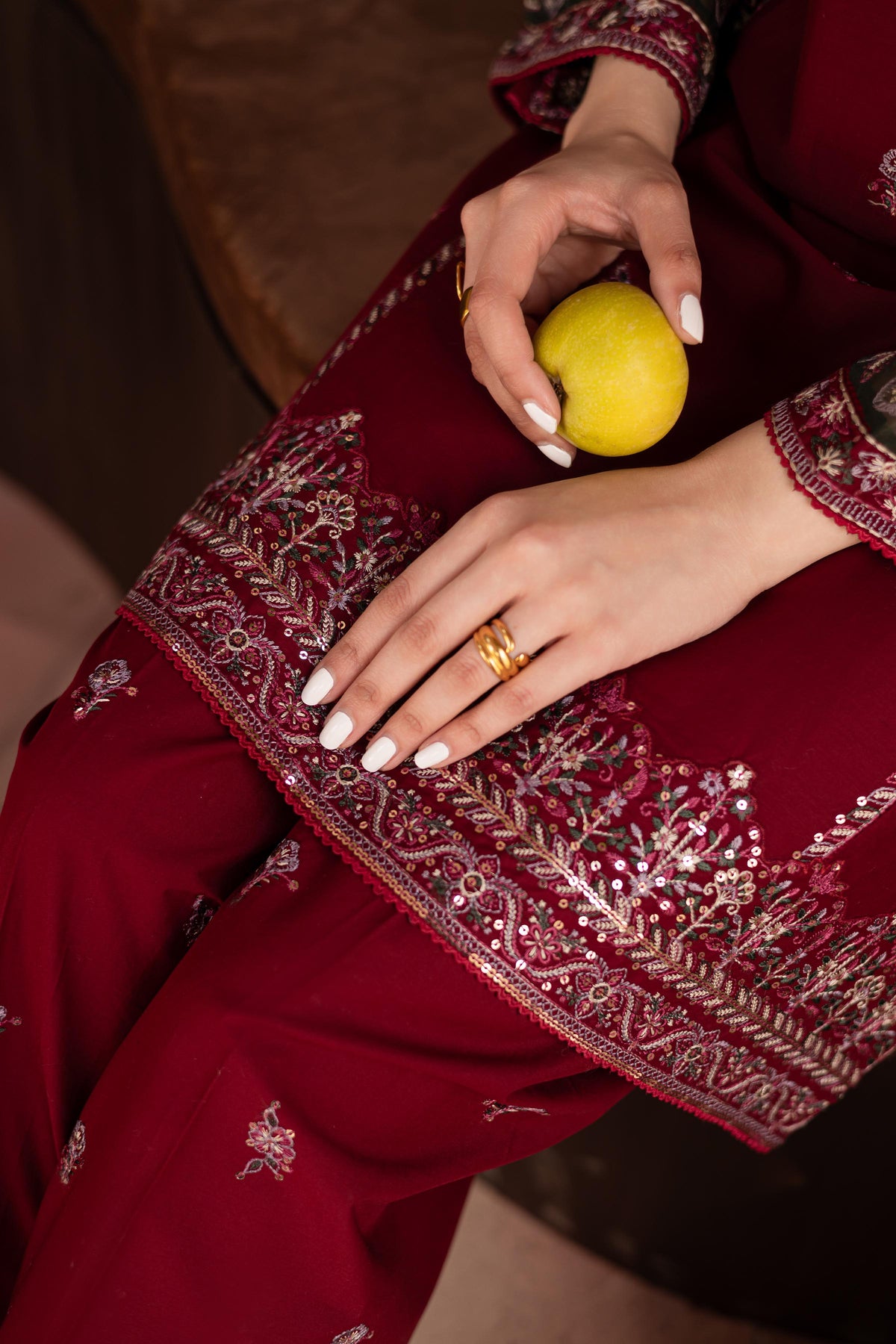 The pima lawn maroon shirt features a beautifully designed composed neckline, complete with a stylish slit for a modern twist. The shirt boasts elegant borders at the hem, with an all-over spread of intricate embroidery that enhances its refined look. The design is balanced, offering just the right amount of embellishment, making it perfect for both casual and festive occasions.