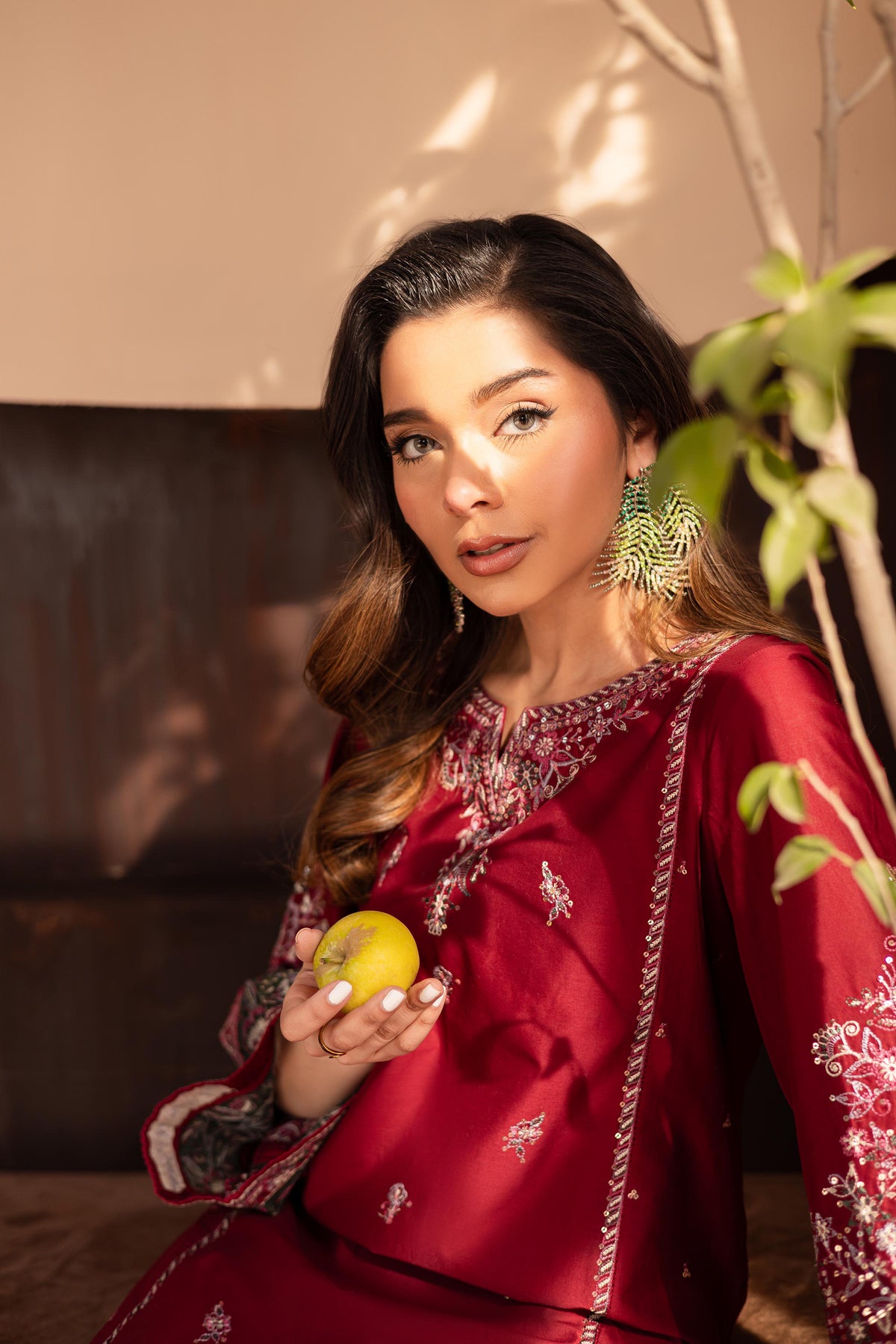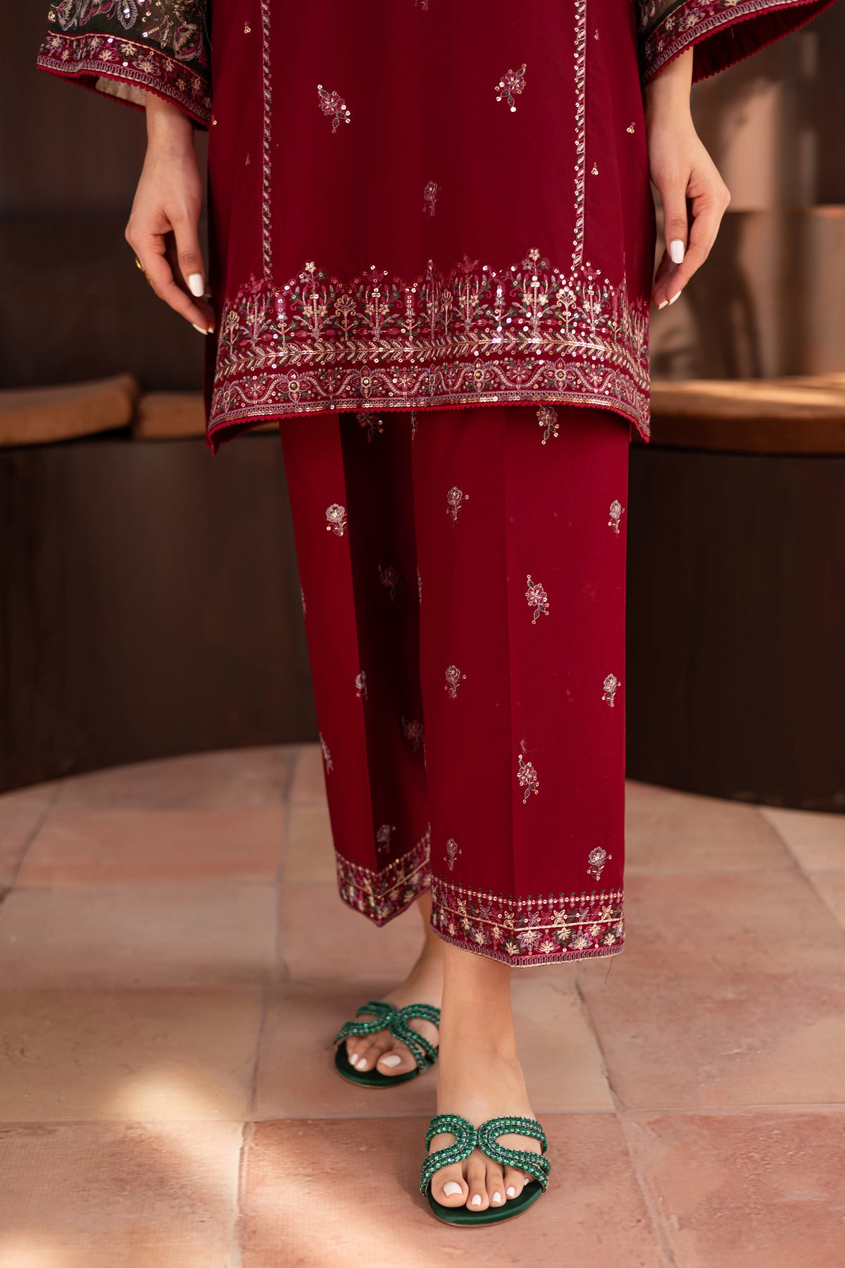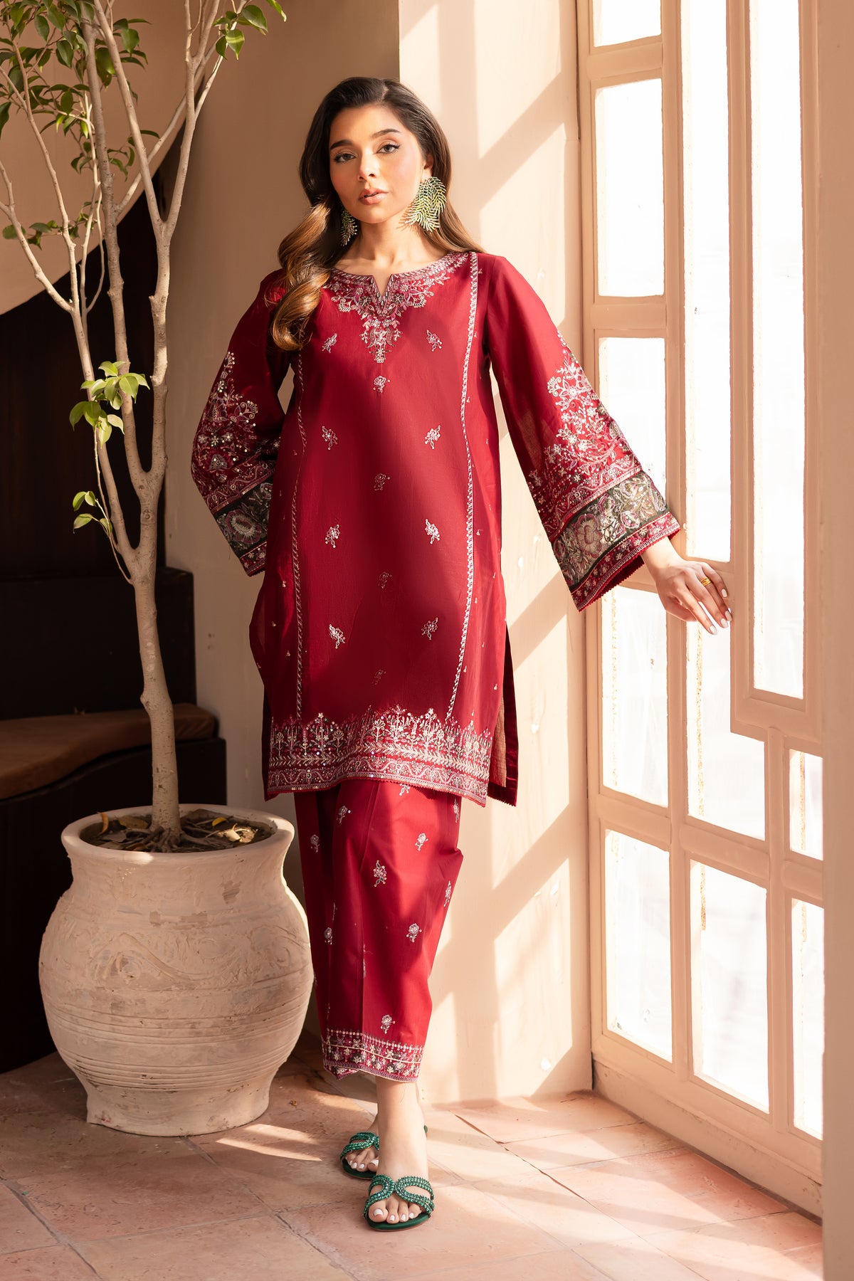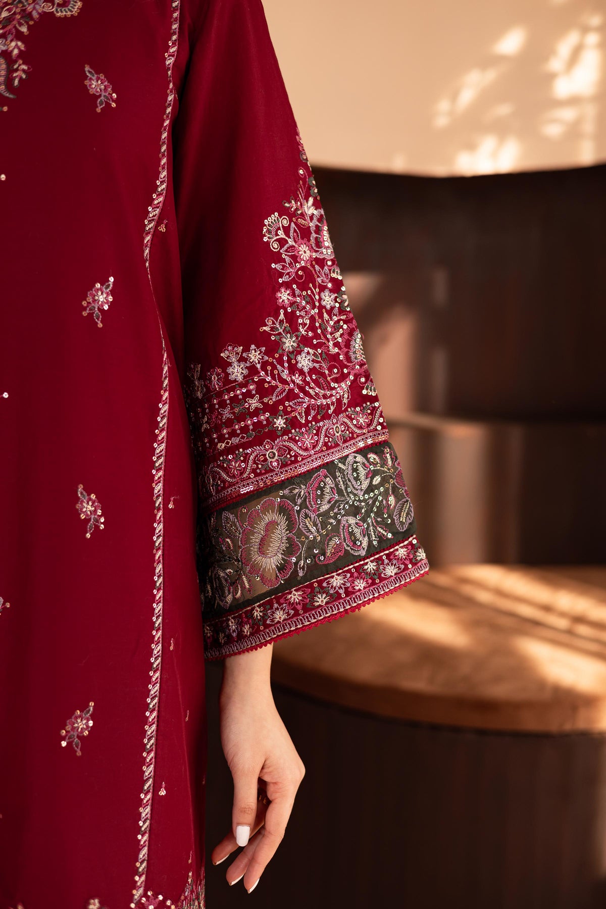 The pima lawn maroon shirt features a beautifully designed composed neckline, complete with a stylish slit for a modern twist. The shirt boasts elegant borders at the hem, with an all-over spread of intricate embroidery that enhances its refined look. The design is balanced, offering just the right amount of embellishment, making it perfect for both casual and festive occasions.
