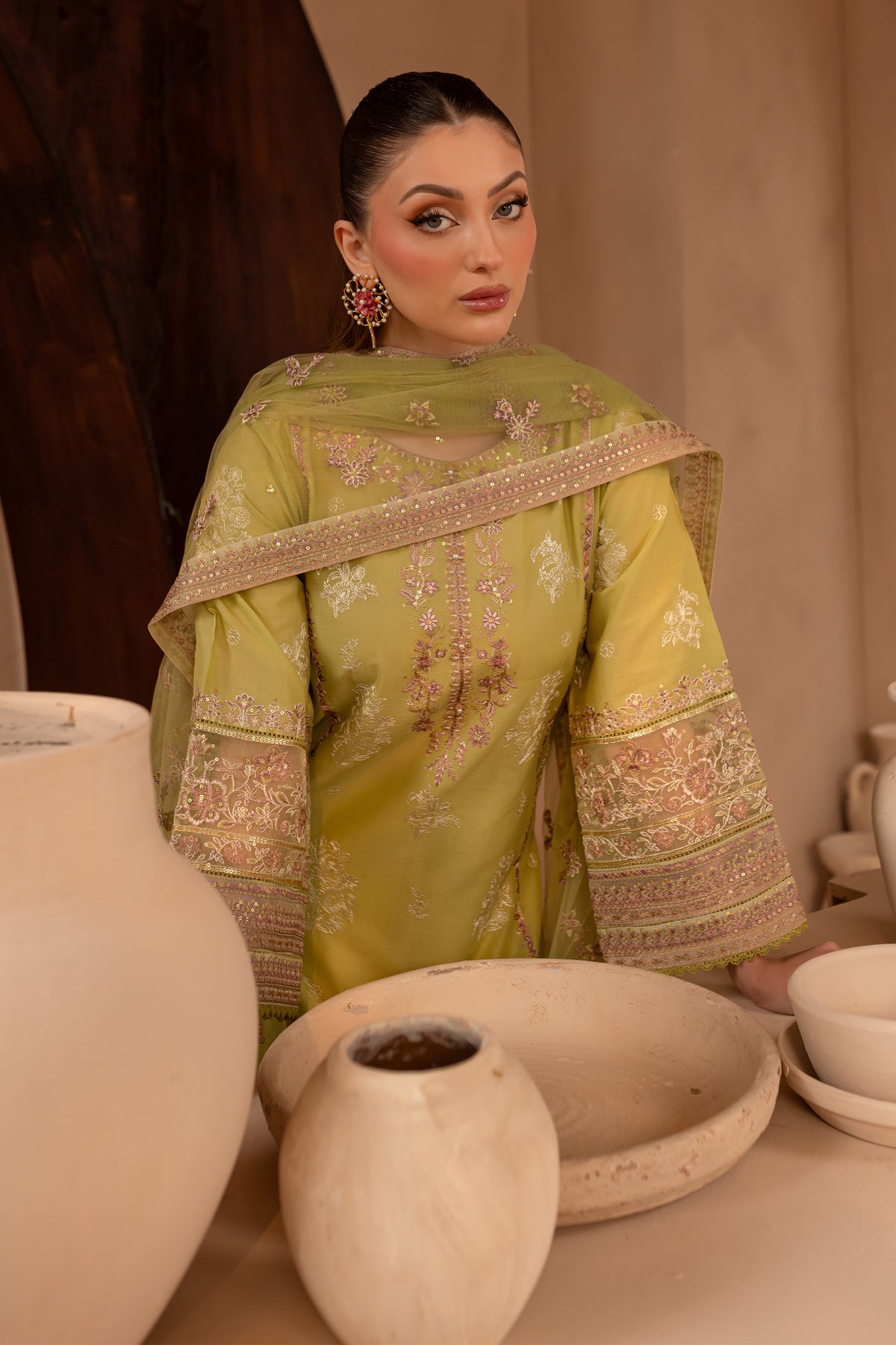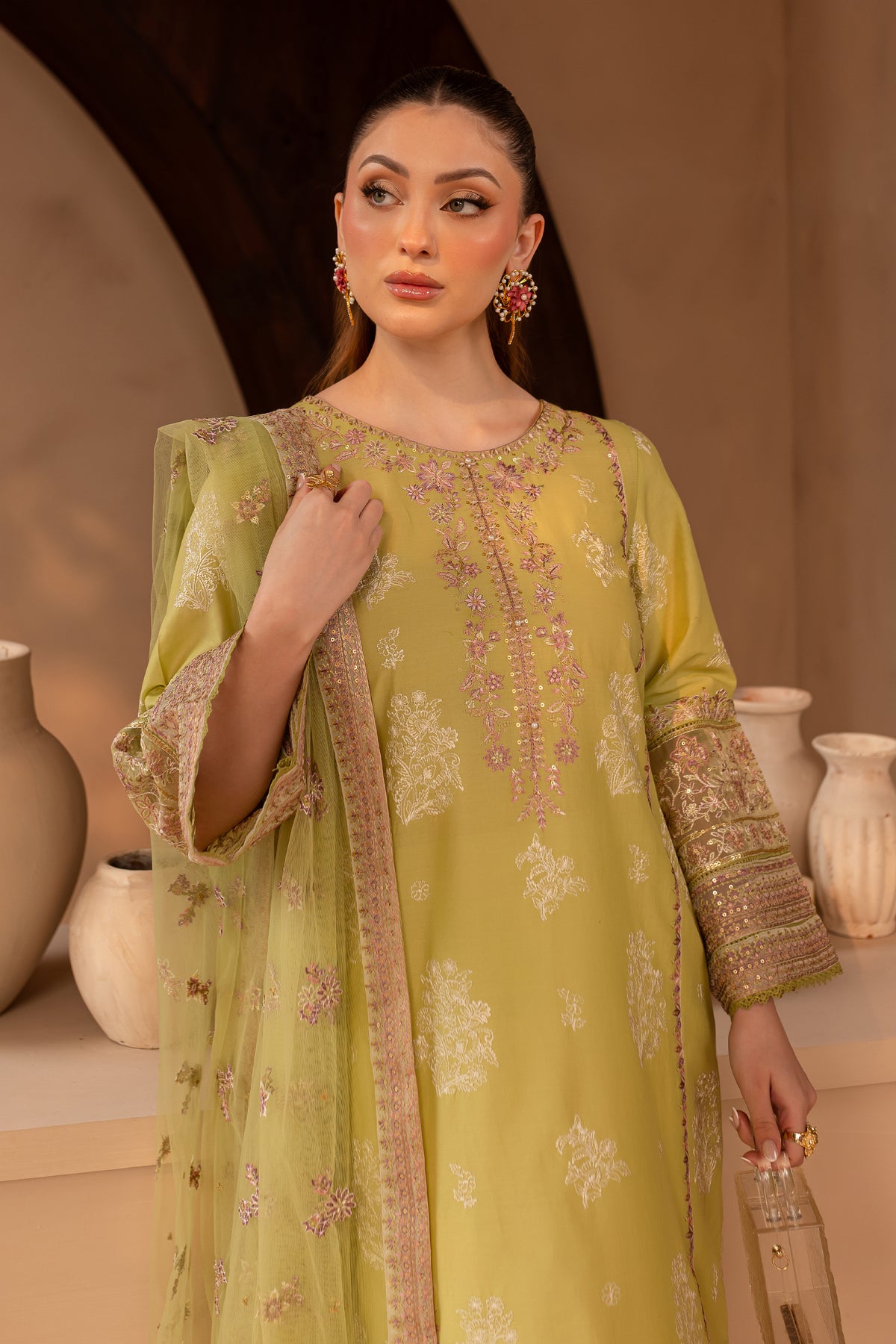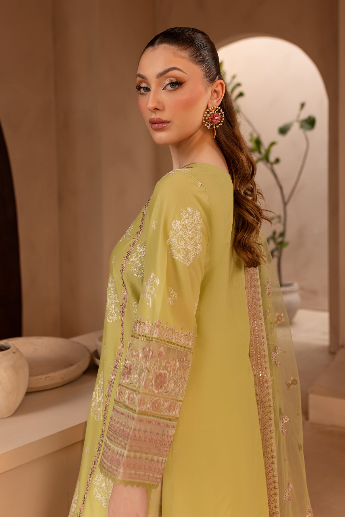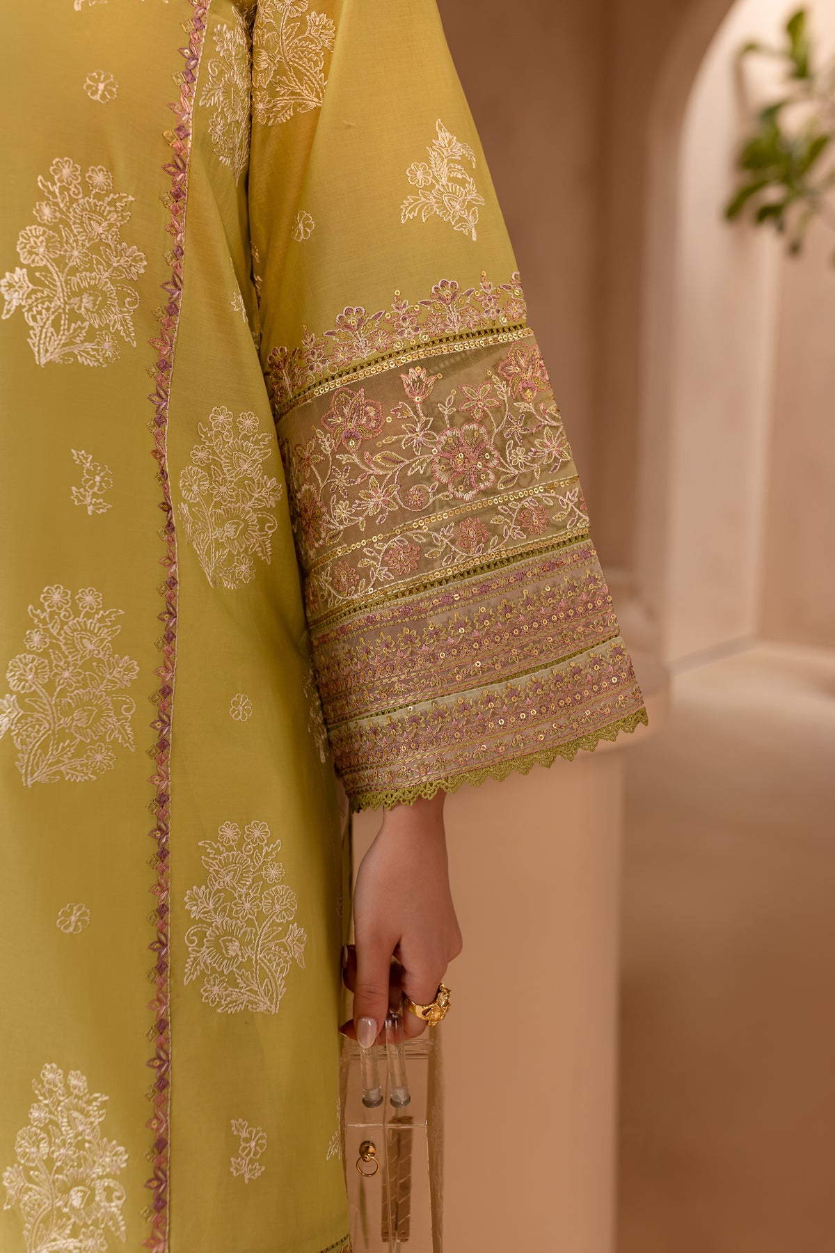 This embroidered apple green mid-length pima lawn shirt features a beautifully detailed neckline and button stand finish, highlighted with a button collage for a chic touch. The front of the shirt is fully embroidered, with elegant organza borders at the hem, adding a refined, delicate finish. The sleeves are embroidered with contrasting organza borders, and both the sleeves and shirt hem are finished with crochet lace for an intricate, graceful touch.