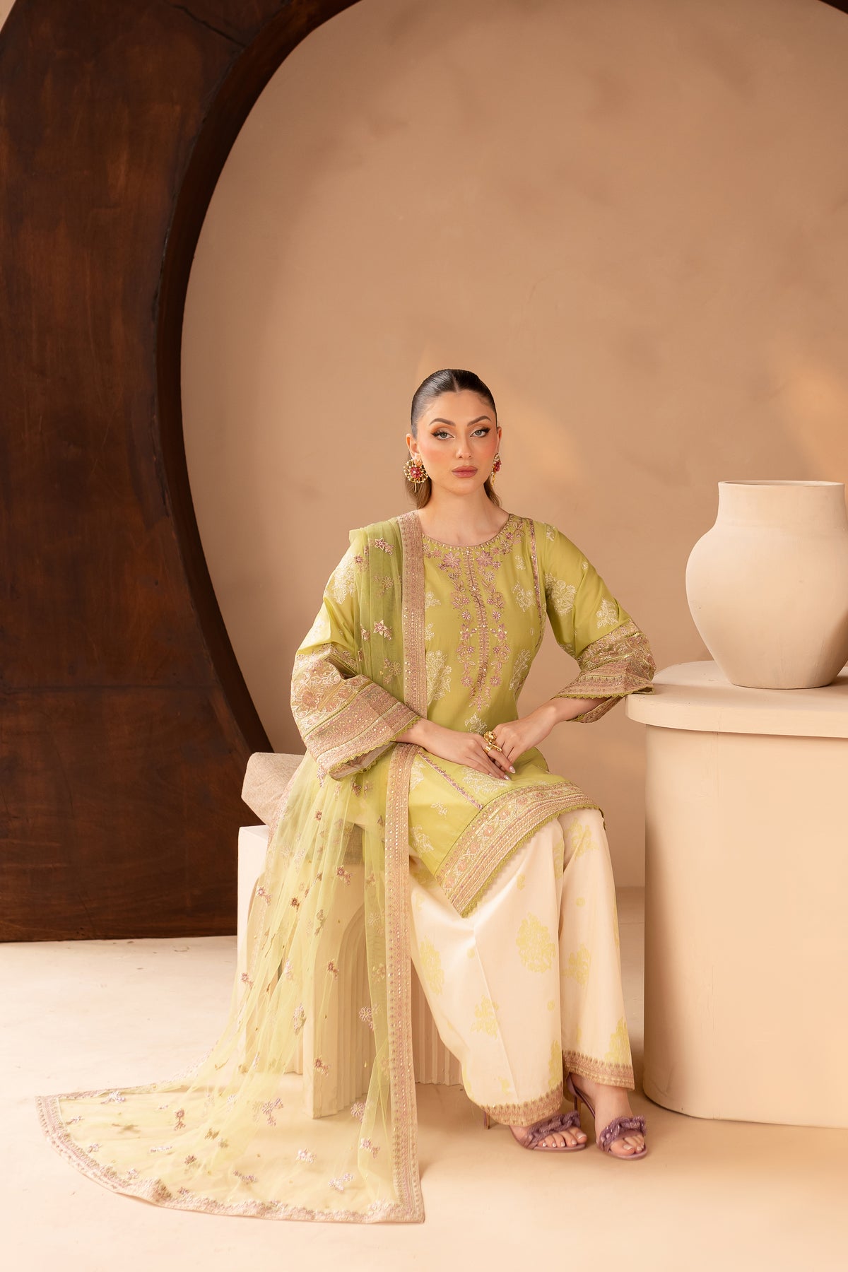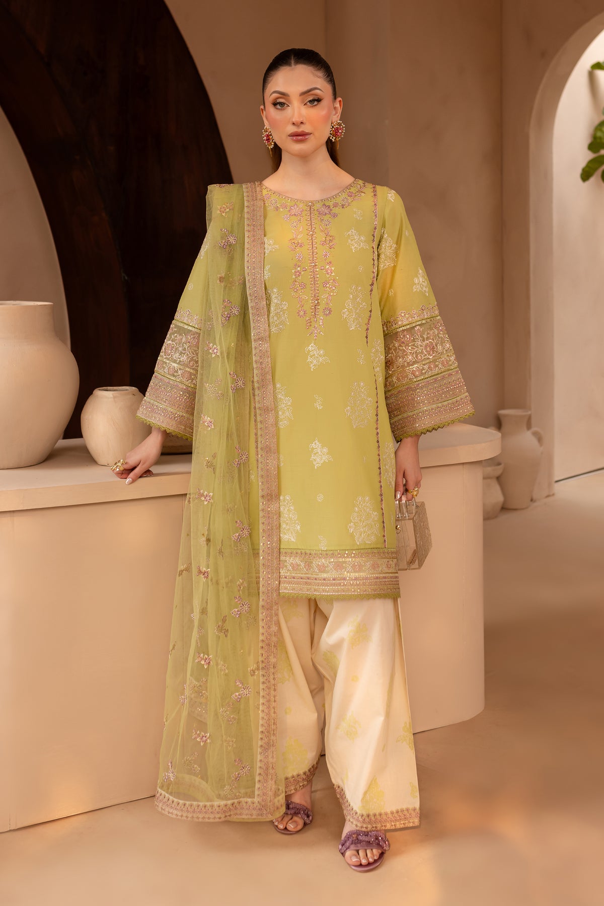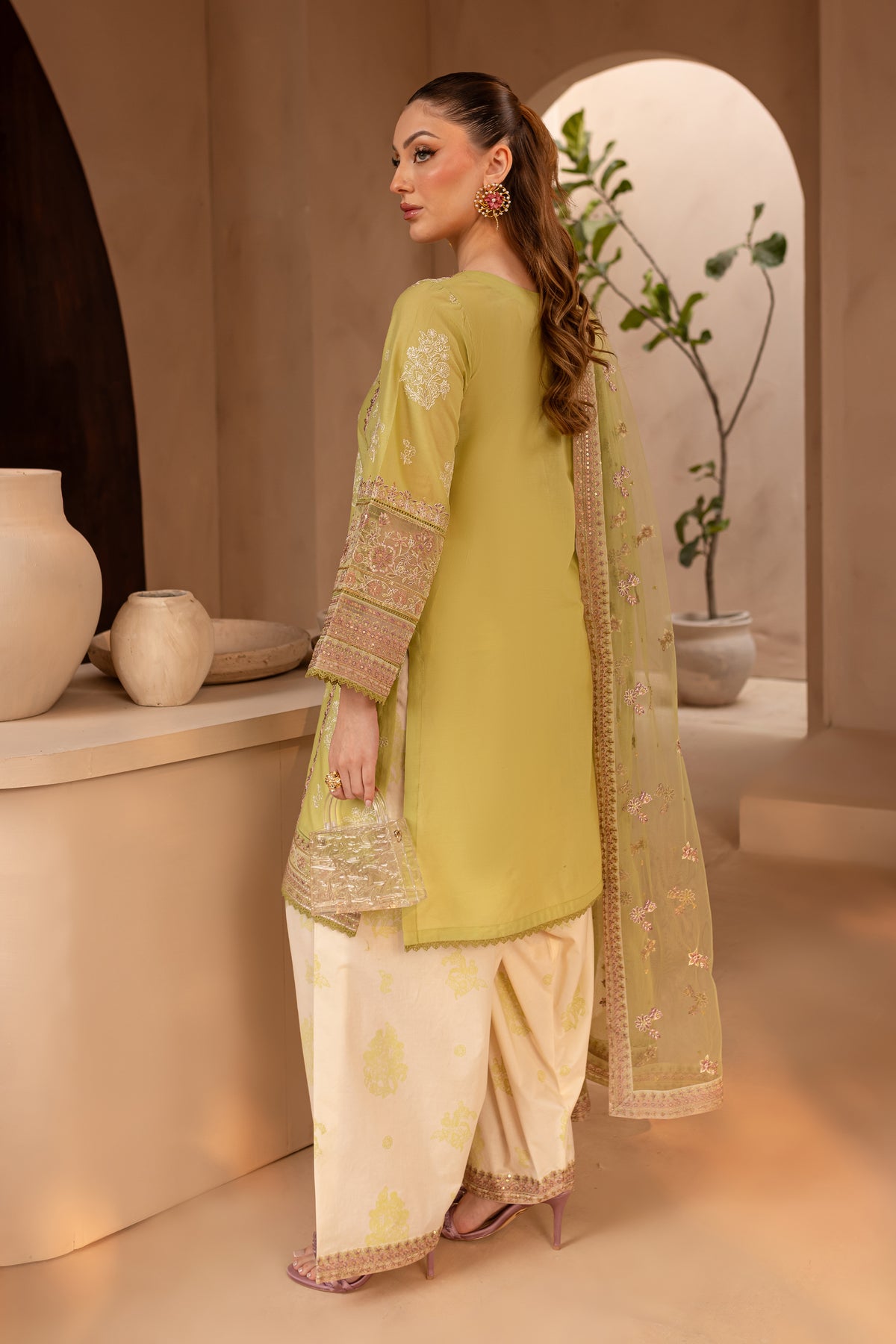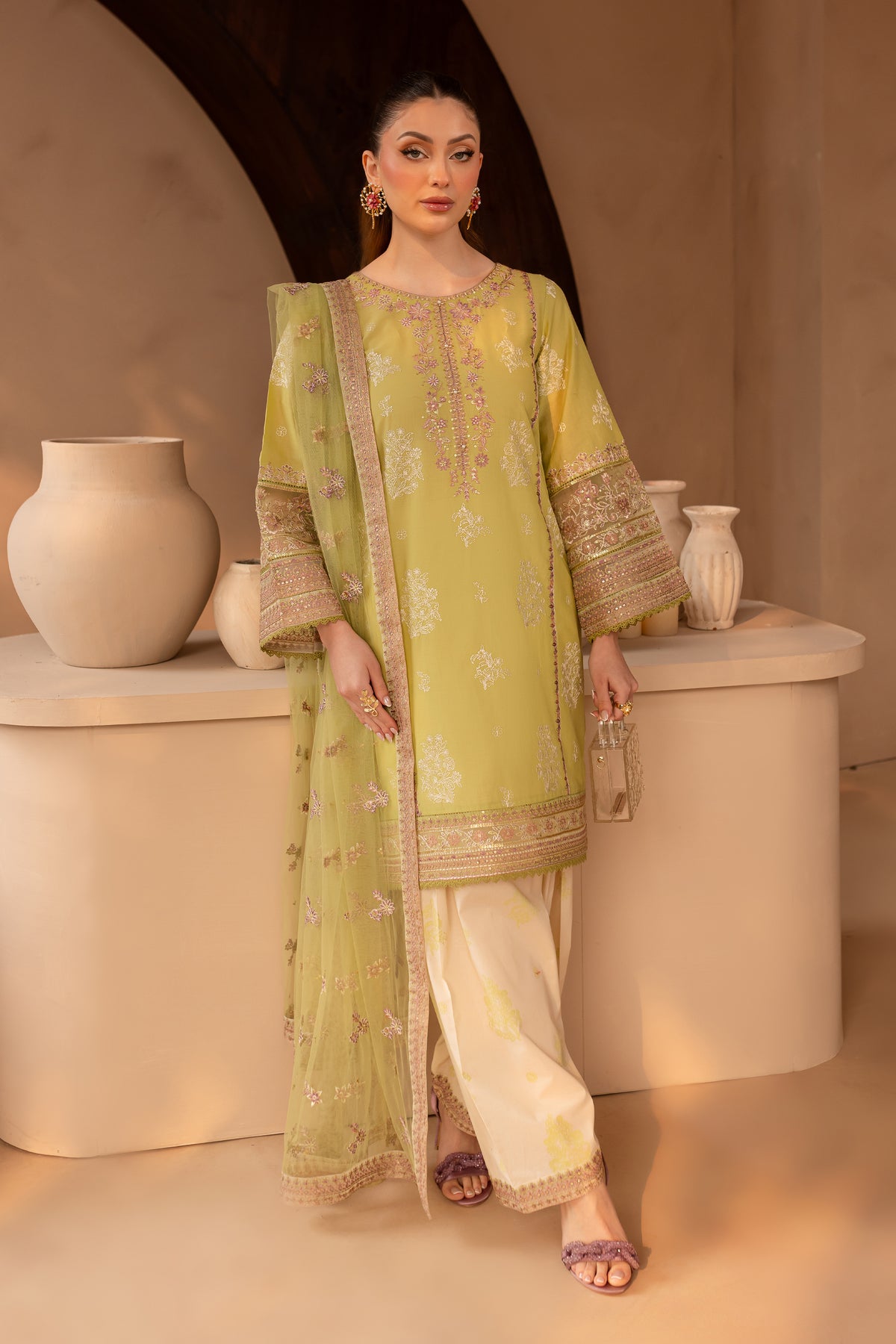 This embroidered apple green mid-length pima lawn shirt features a beautifully detailed neckline and button stand finish, highlighted with a button collage for a chic touch. The front of the shirt is fully embroidered, with elegant organza borders at the hem, adding a refined, delicate finish. The sleeves are embroidered with contrasting organza borders, and both the sleeves and shirt hem are finished with crochet lace for an intricate, graceful touch.