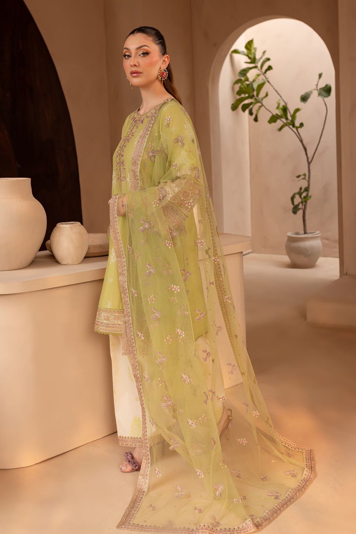 The ensemble is completed with a net dupatta, adorned with embroidered borders and a soft spread, adding a light, elegant touch to the overall outfit.