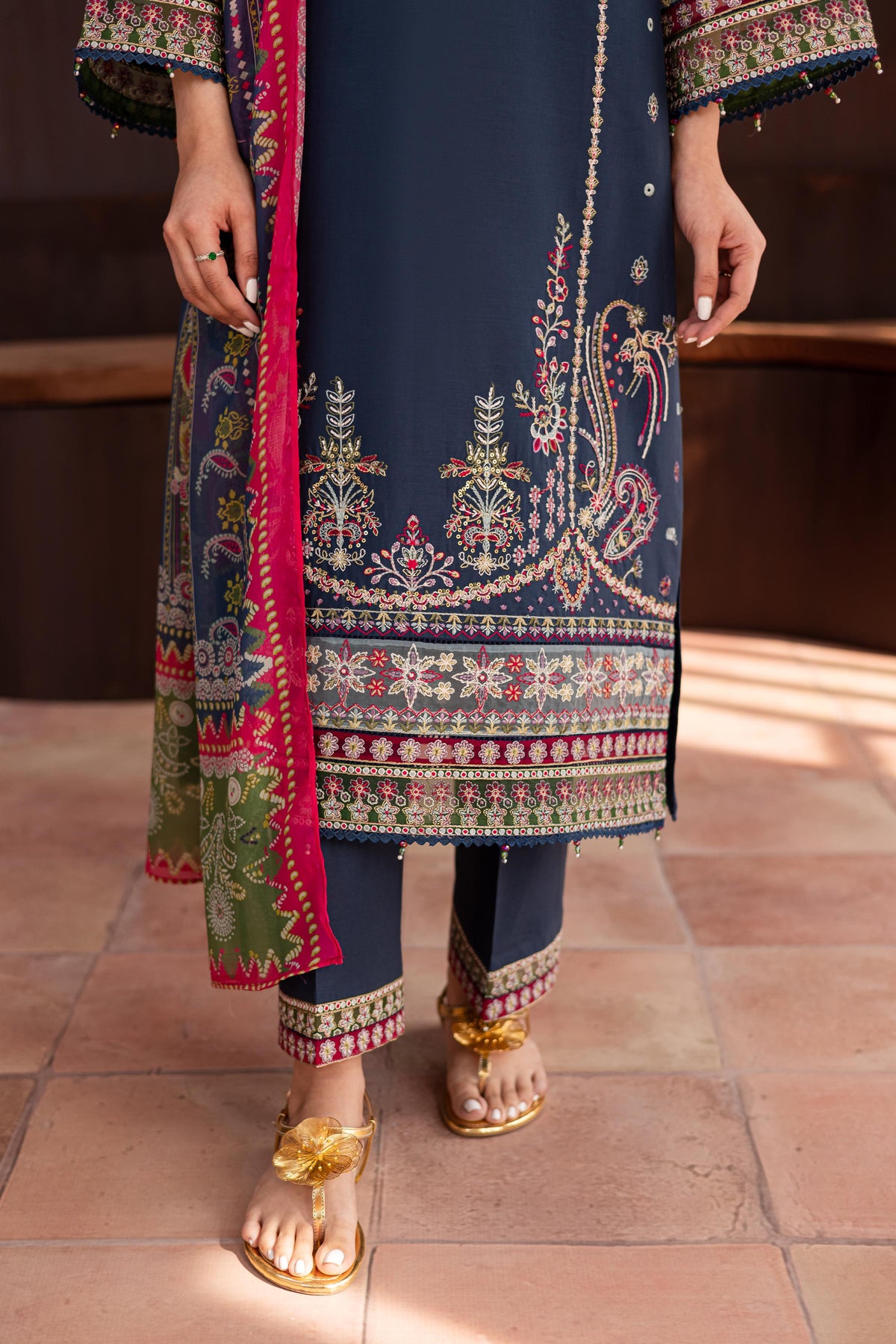 This exquisite ensemble features a multicoloured geometric embroidered pima lawn long shirt with a structured silhouette, composed neck, and hem. The intricate embroidery adds vibrancy and texture, while organza borders with multi-coloured details on the sleeves and hem enhance its elegance. Hanging beads and crystals add a touch of glamour, making it perfect for festive occasions.