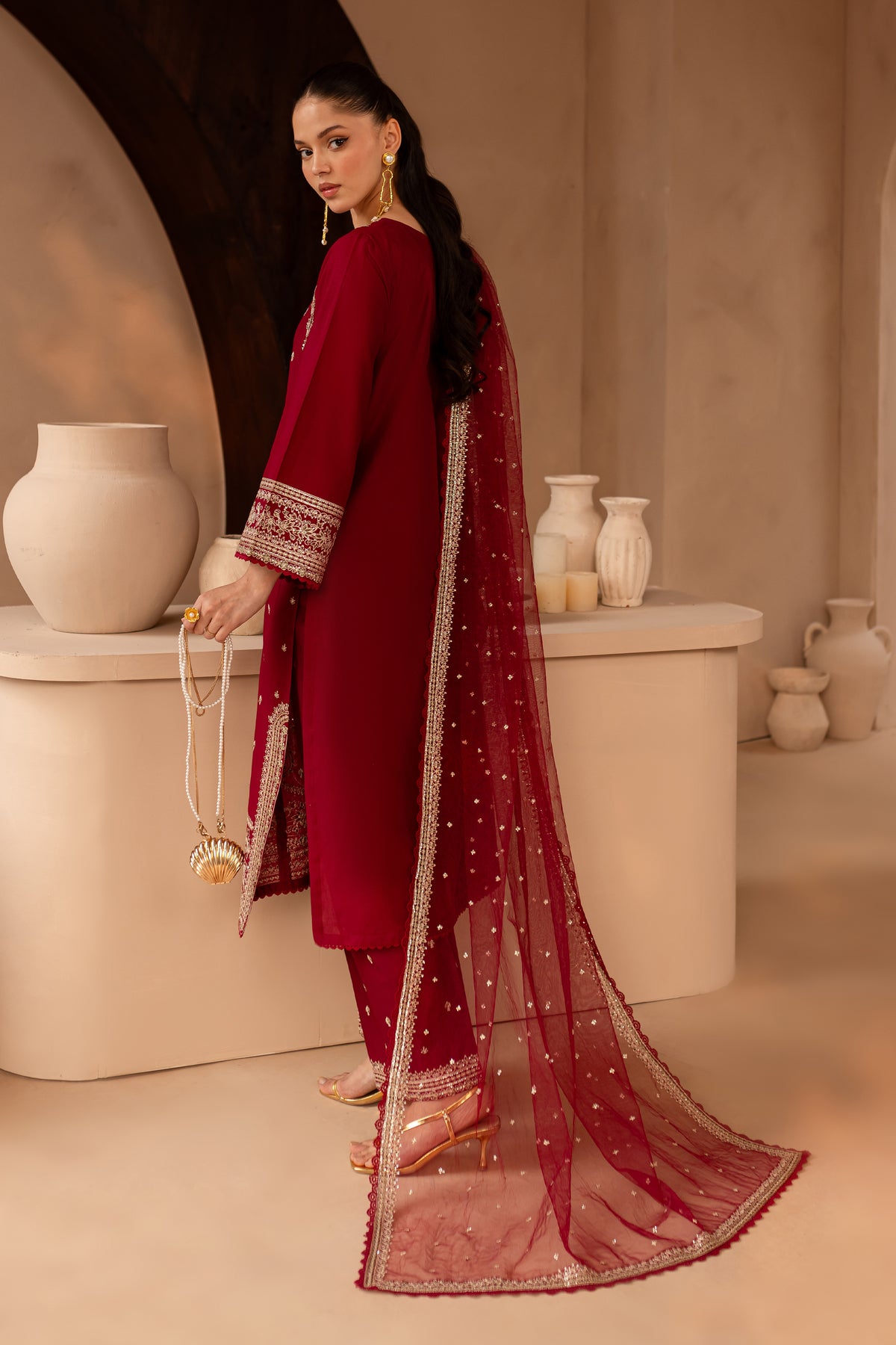 This panelled pima lawn long shirt features intricate tilla and sequin embroidery on the neckline, elegantly finished with piping and a crystal collage, adding a touch of glamour on top of its tibetan red shade. The sleeves are adorned with embroidered borders for a refined finish.