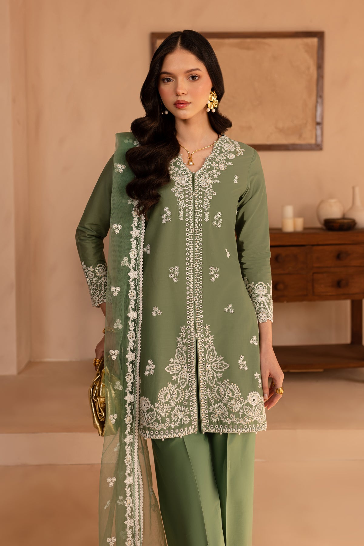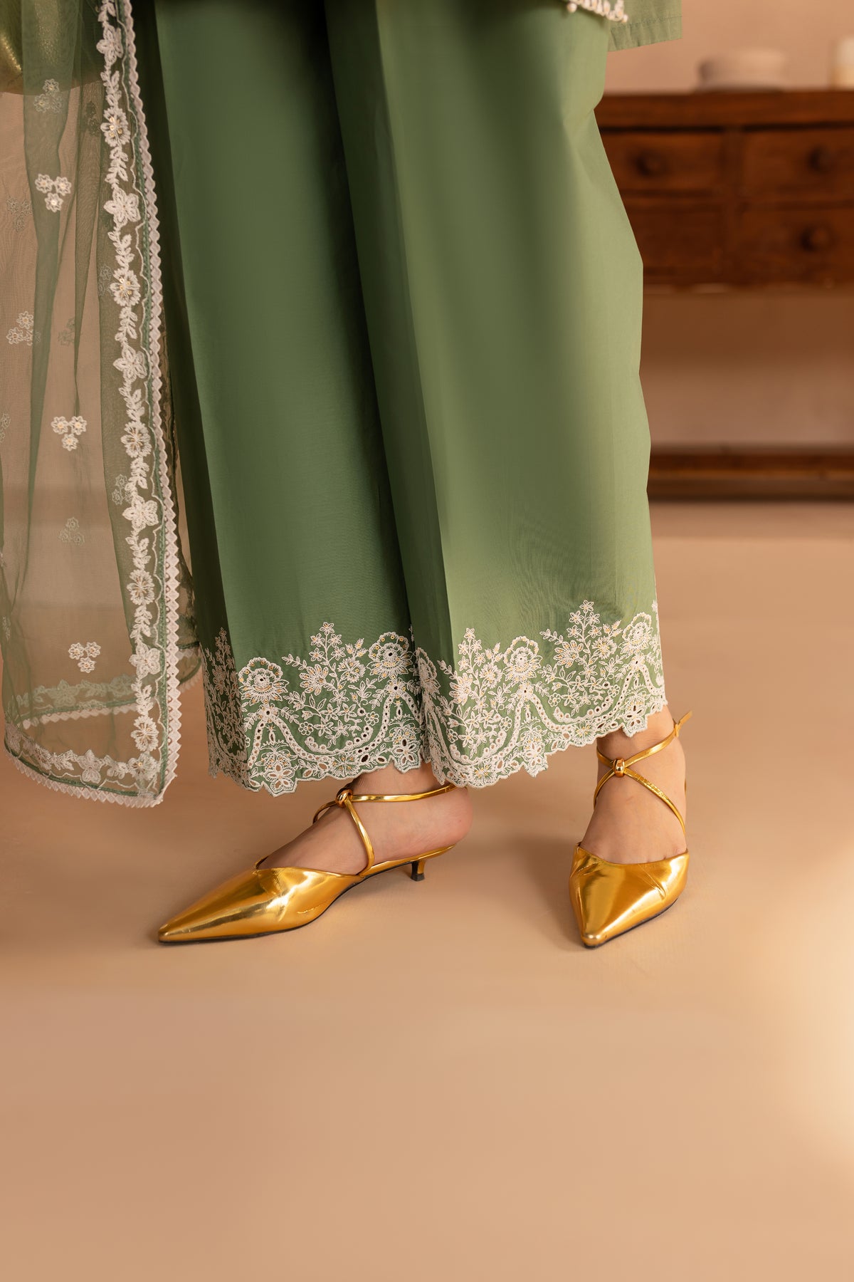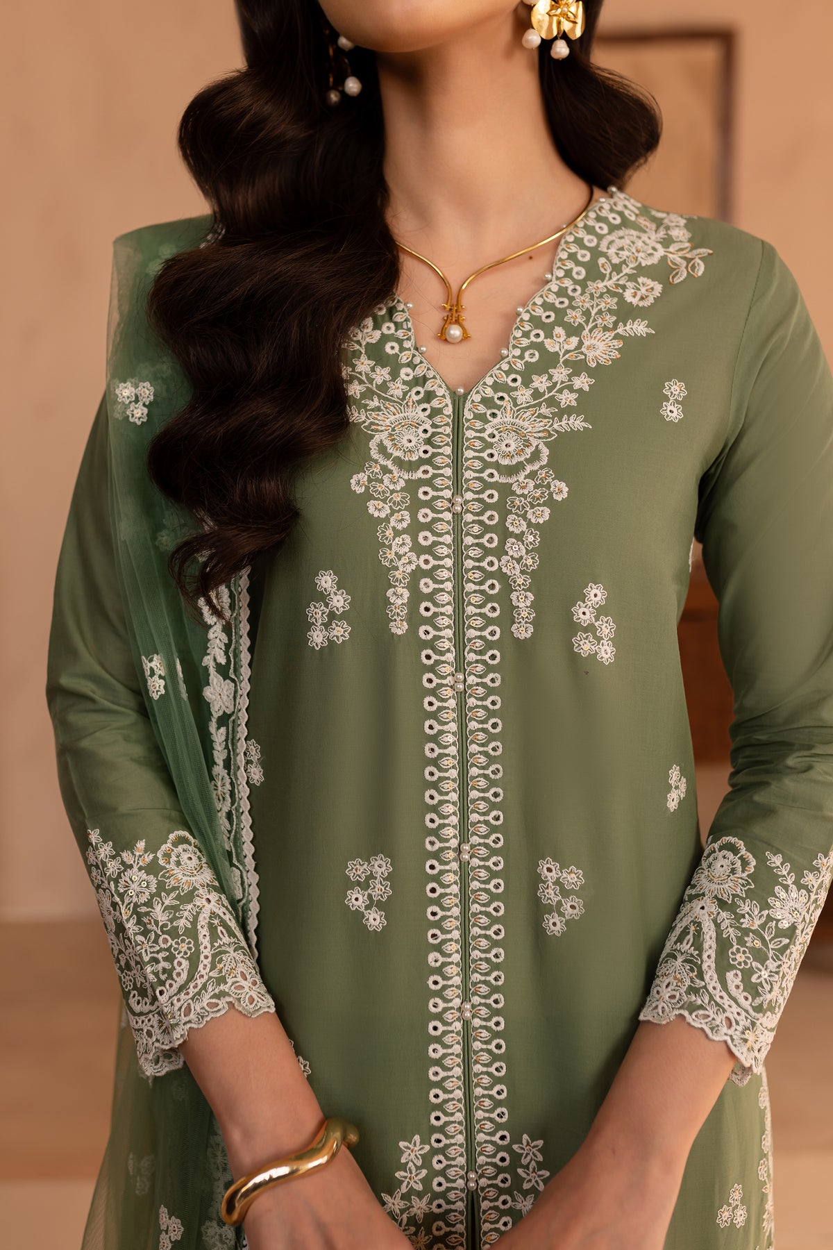 The ensemble is completed with a net embroidered dupatta, finished with delicate lace edges, adding a soft and refined finish to the overall look.