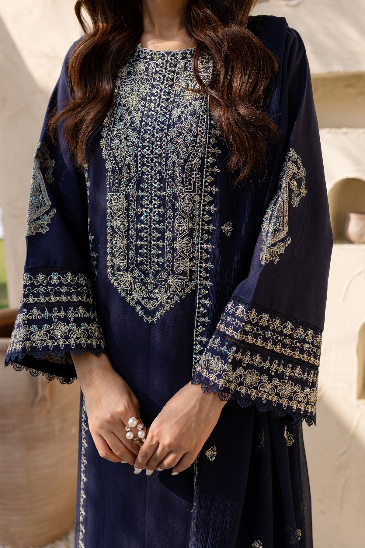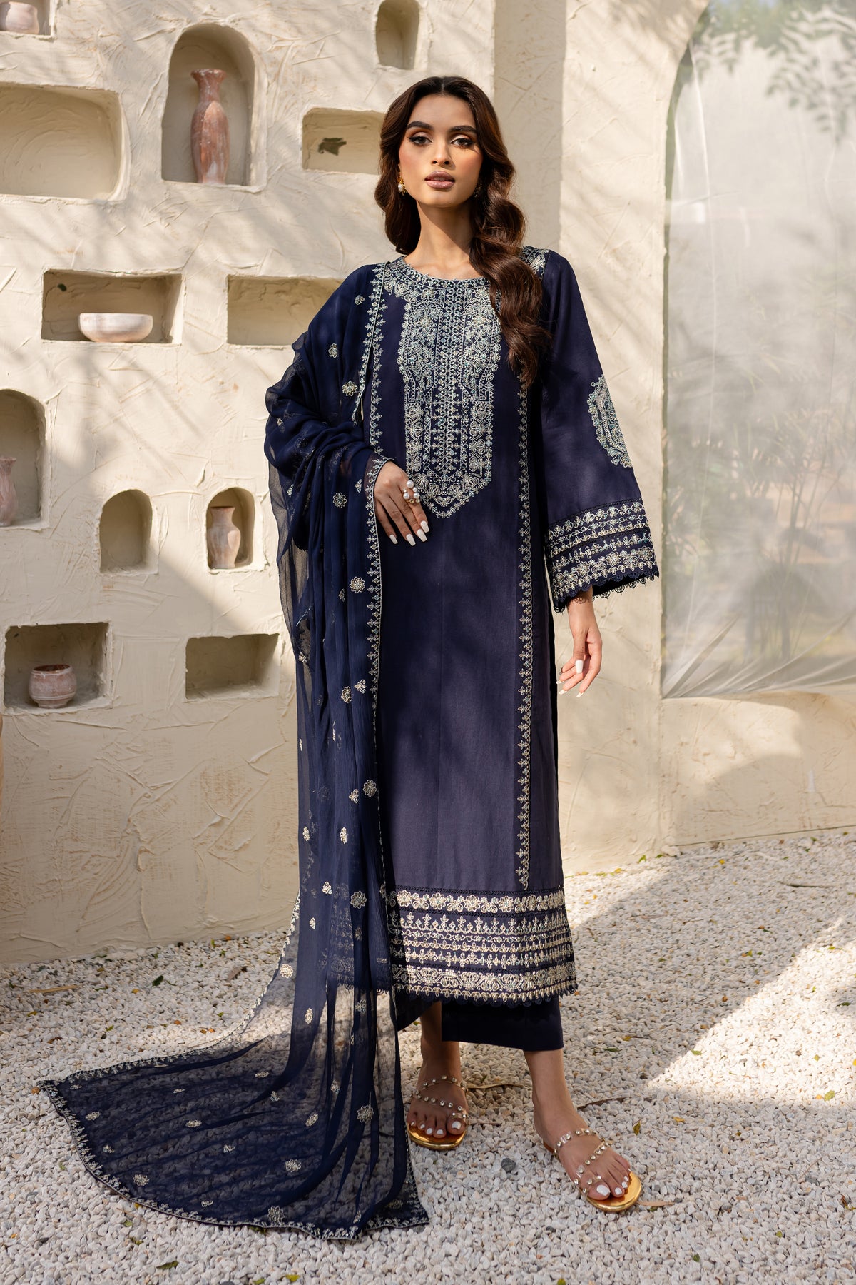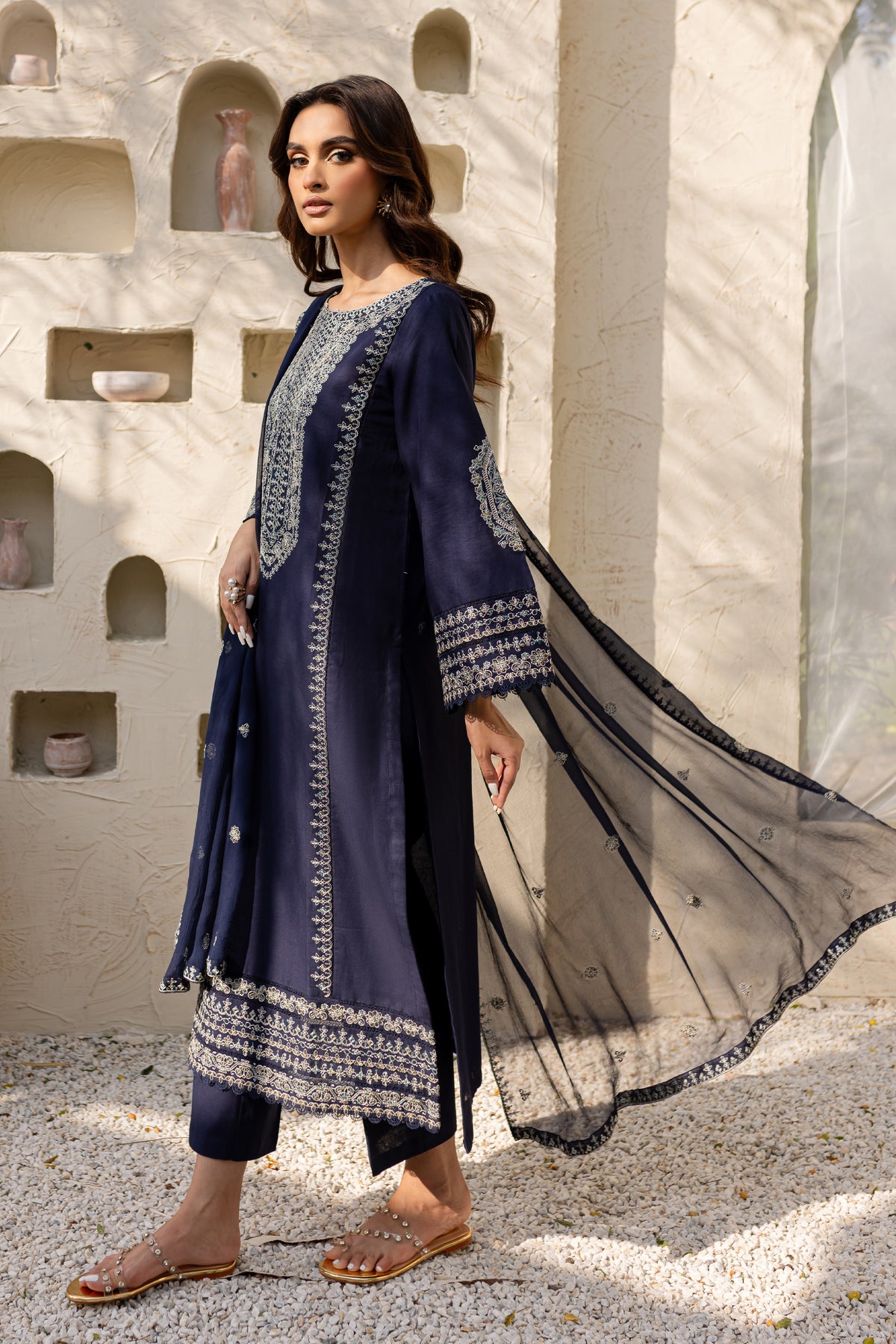 A chic and timeless addition to your winter wardrobe – dark blue outfit in the premium khaddar fabric is a must-have. Heavily embroidered three-paneled shirt displays composed embroidery at neckline, hem, and sleeves.