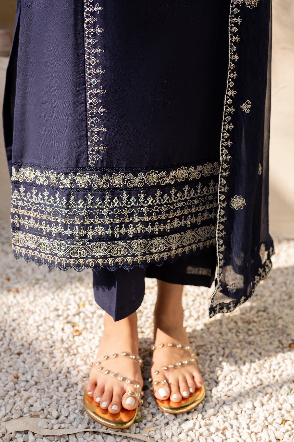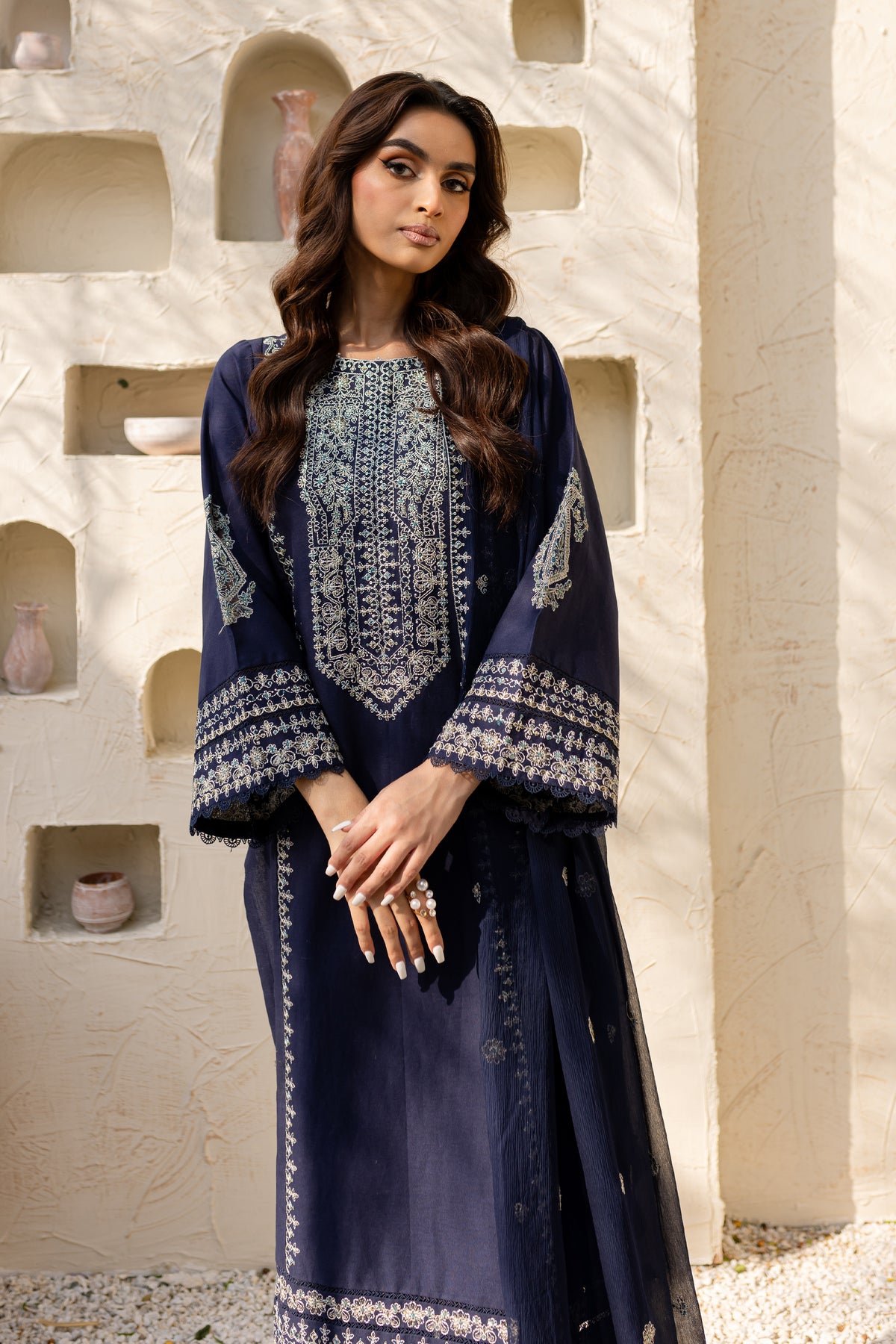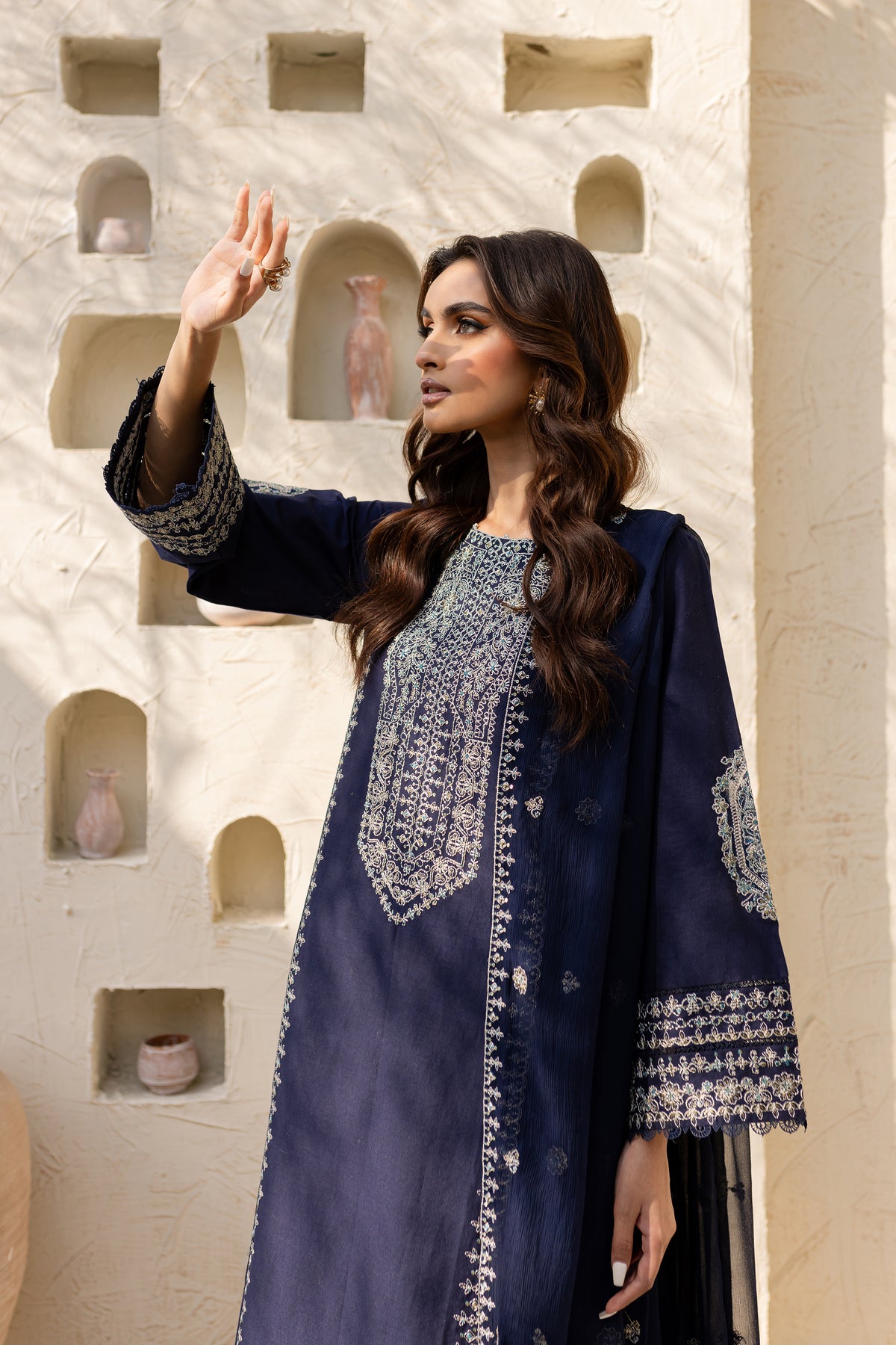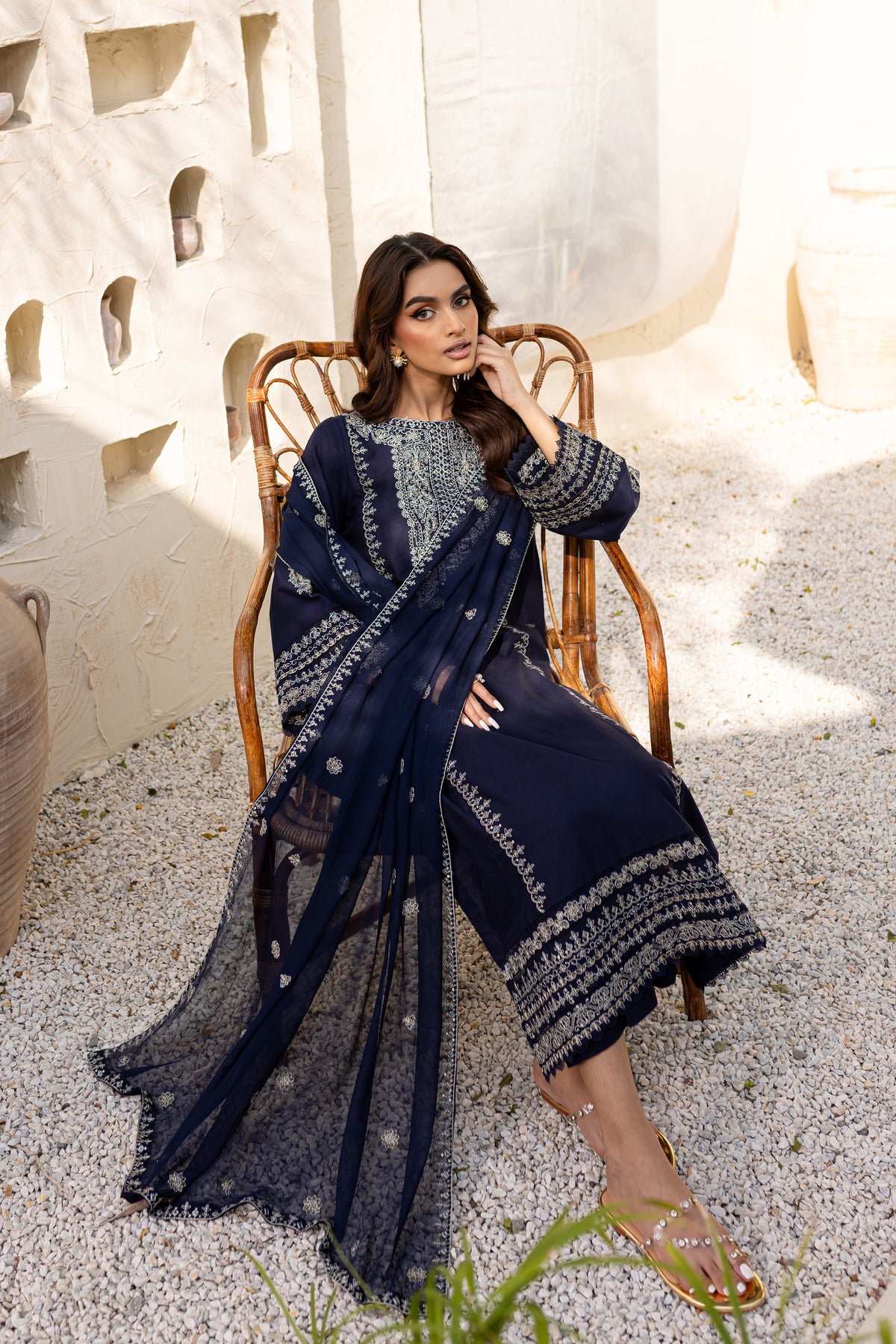 A chic and timeless addition to your winter wardrobe – dark blue outfit in the premium khaddar fabric is a must-have. Heavily embroidered three-paneled shirt displays composed embroidery at neckline, hem, and sleeves.