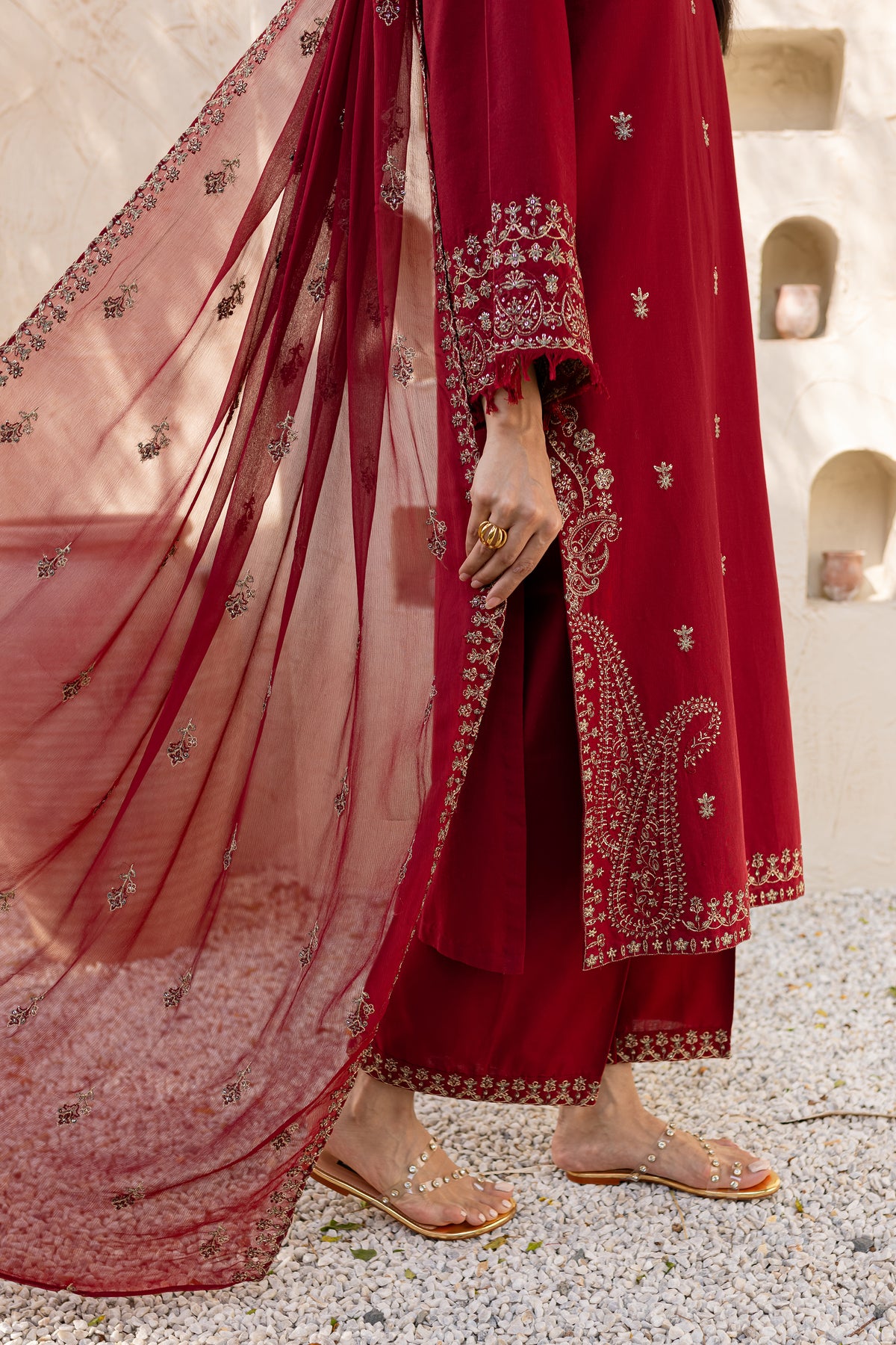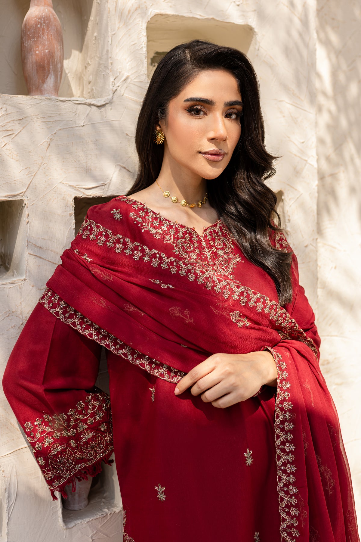 A crinkle dupatta, detailed with a spread pattern and embroidered borders adds sophistication and fluidity.