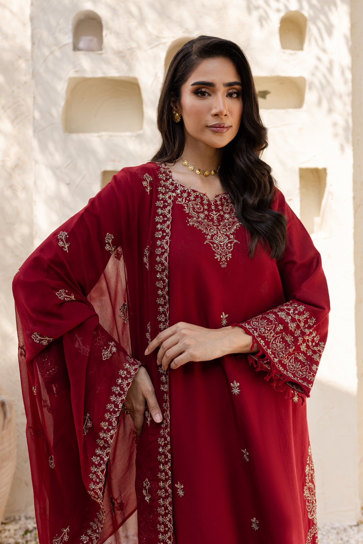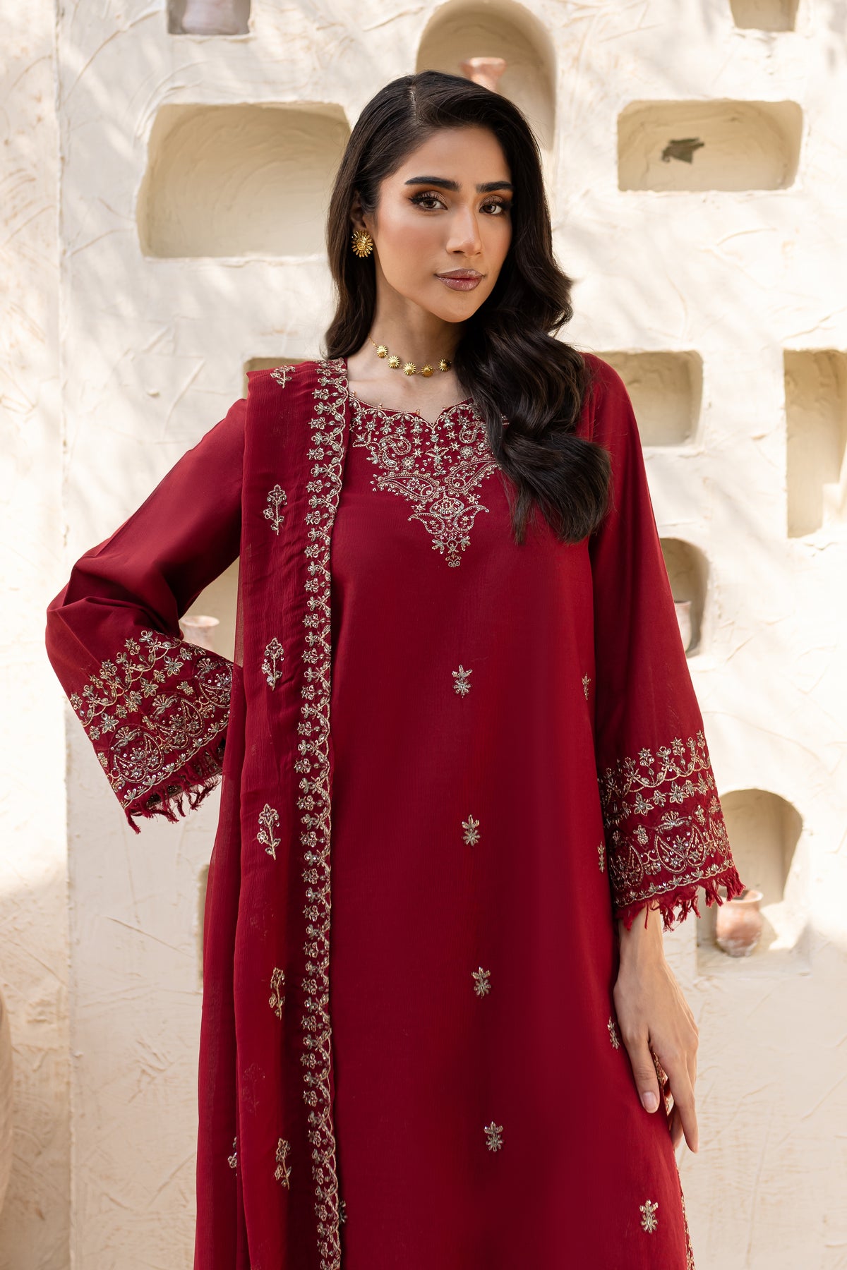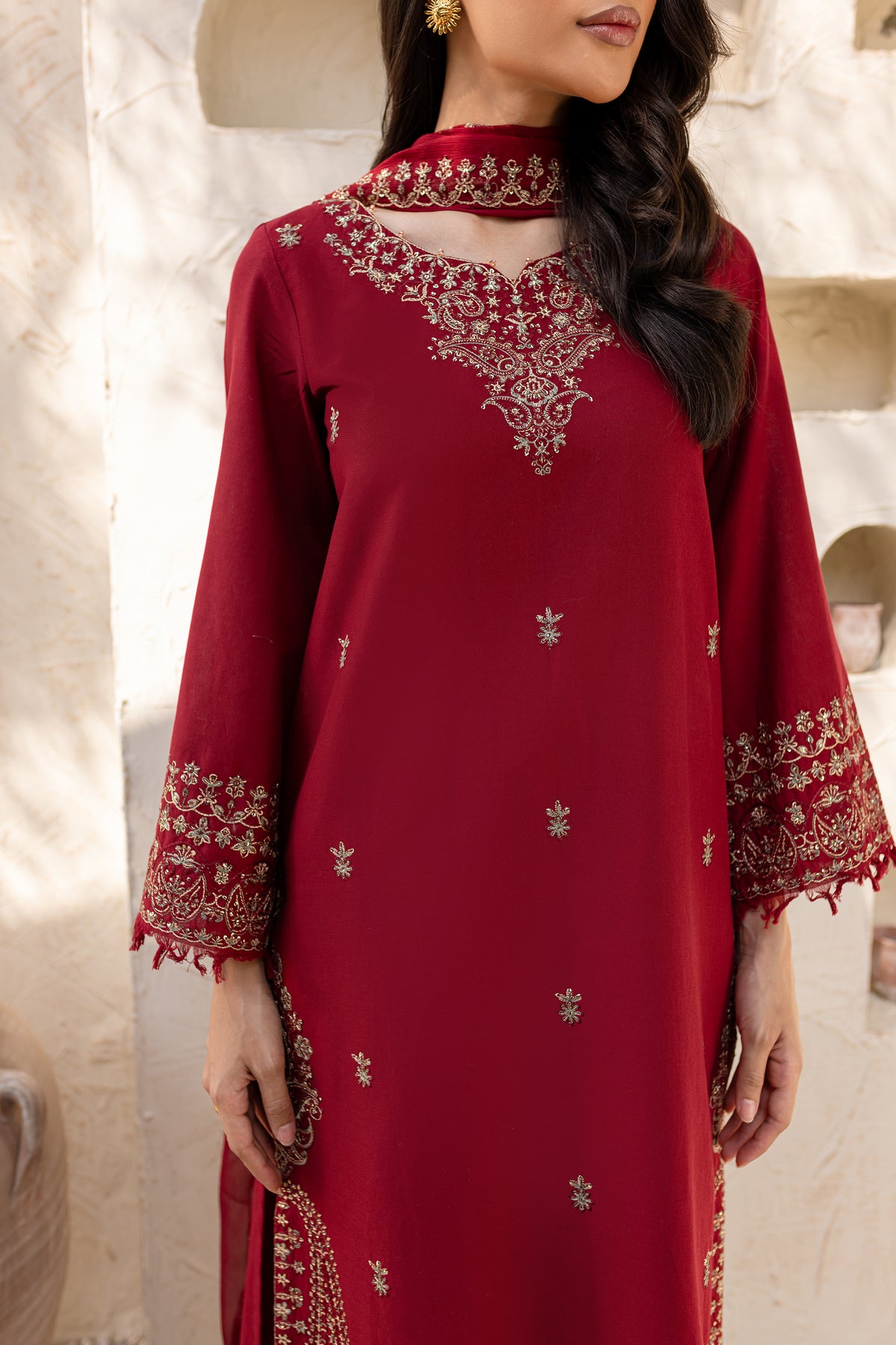 Naaz is an exquisite khaddar ensemble with understated elegance in beet root color. The shirt features a minimalistic neckline but is enriched with heavy embroidery along the hem at the side seams. The front showcases a delicate spread of embroidery, adding a refined touch. The sleeves are also embroidered and finished with a soft fray at the hem for an artistic flair.