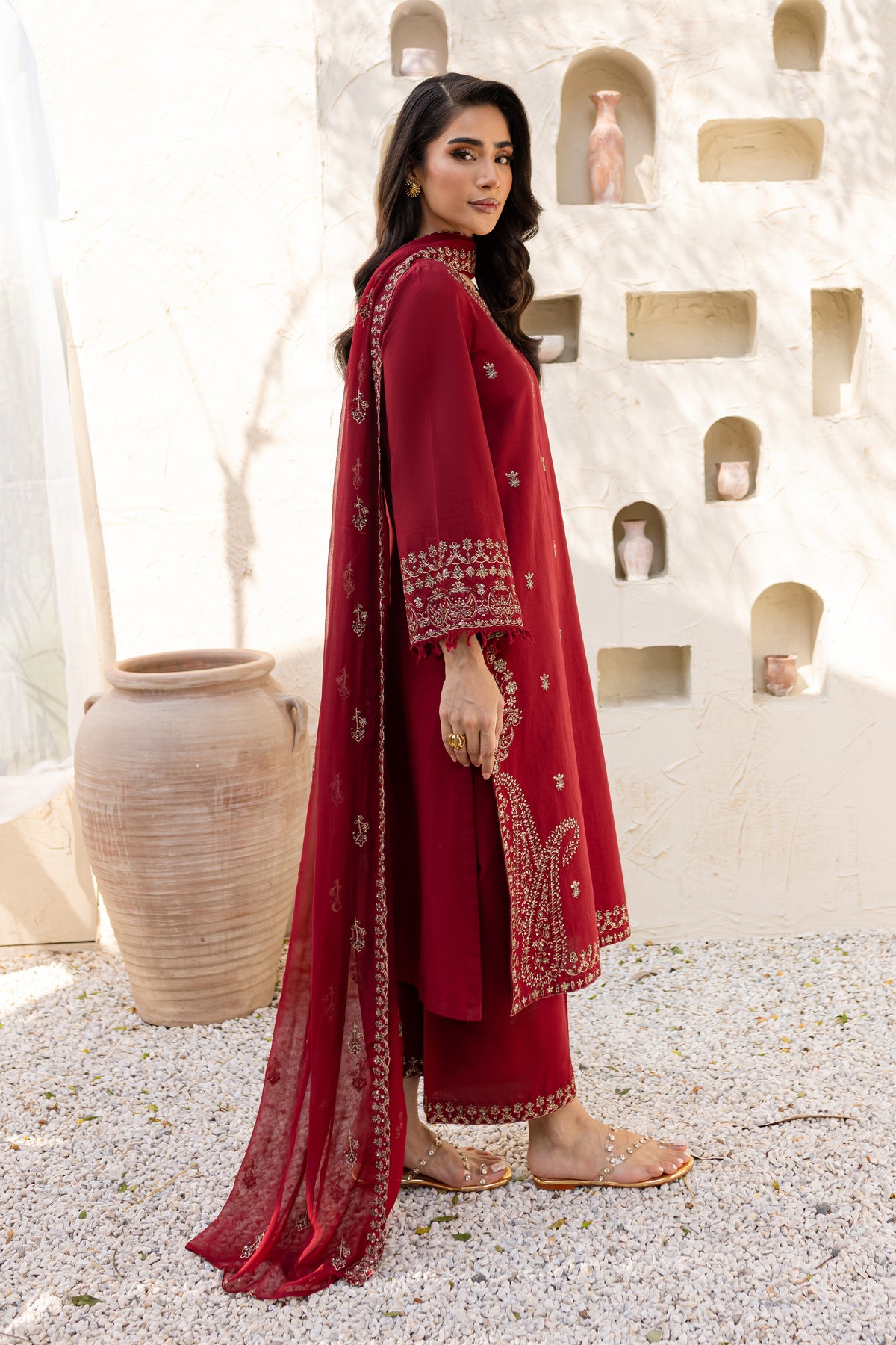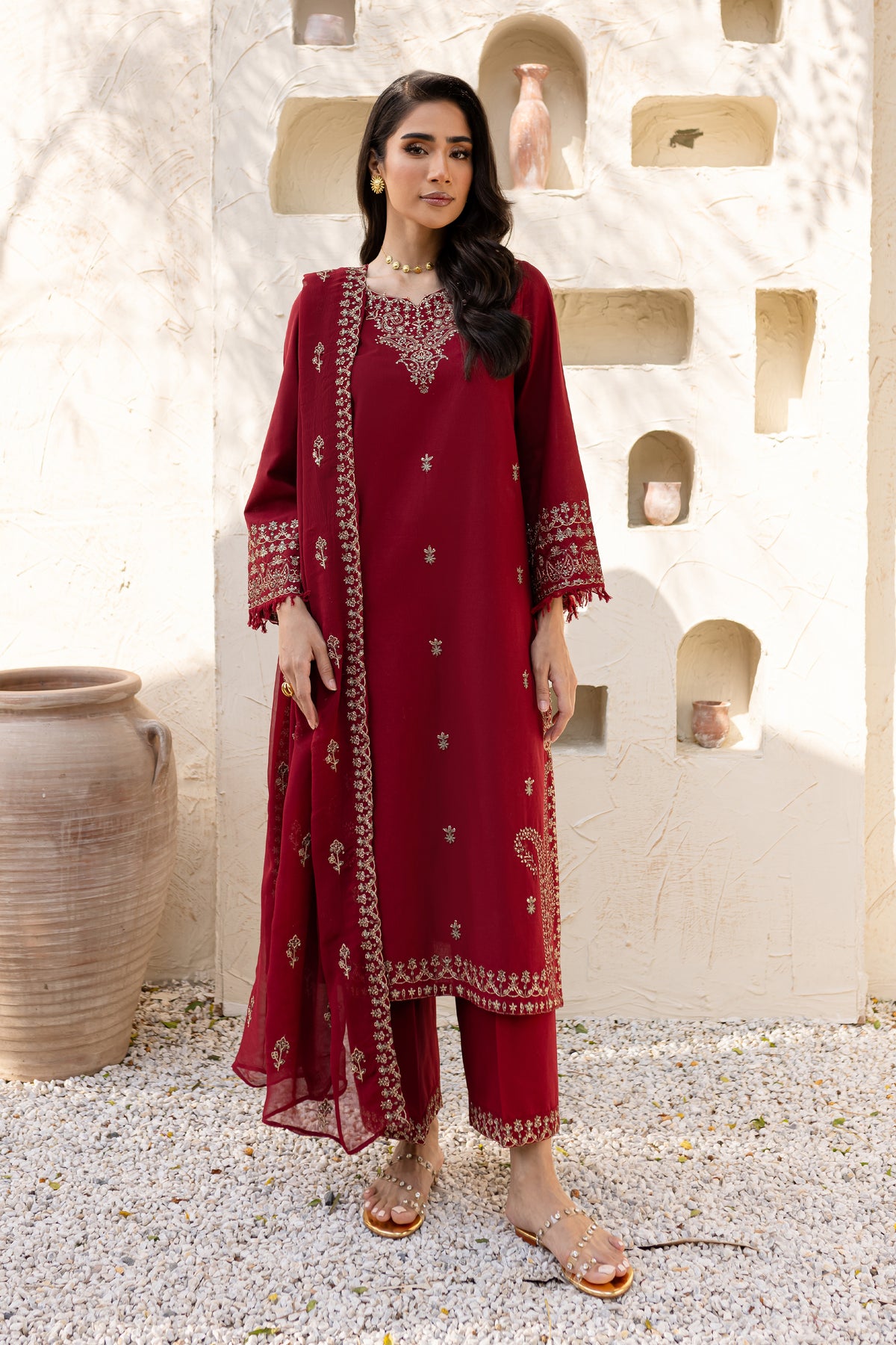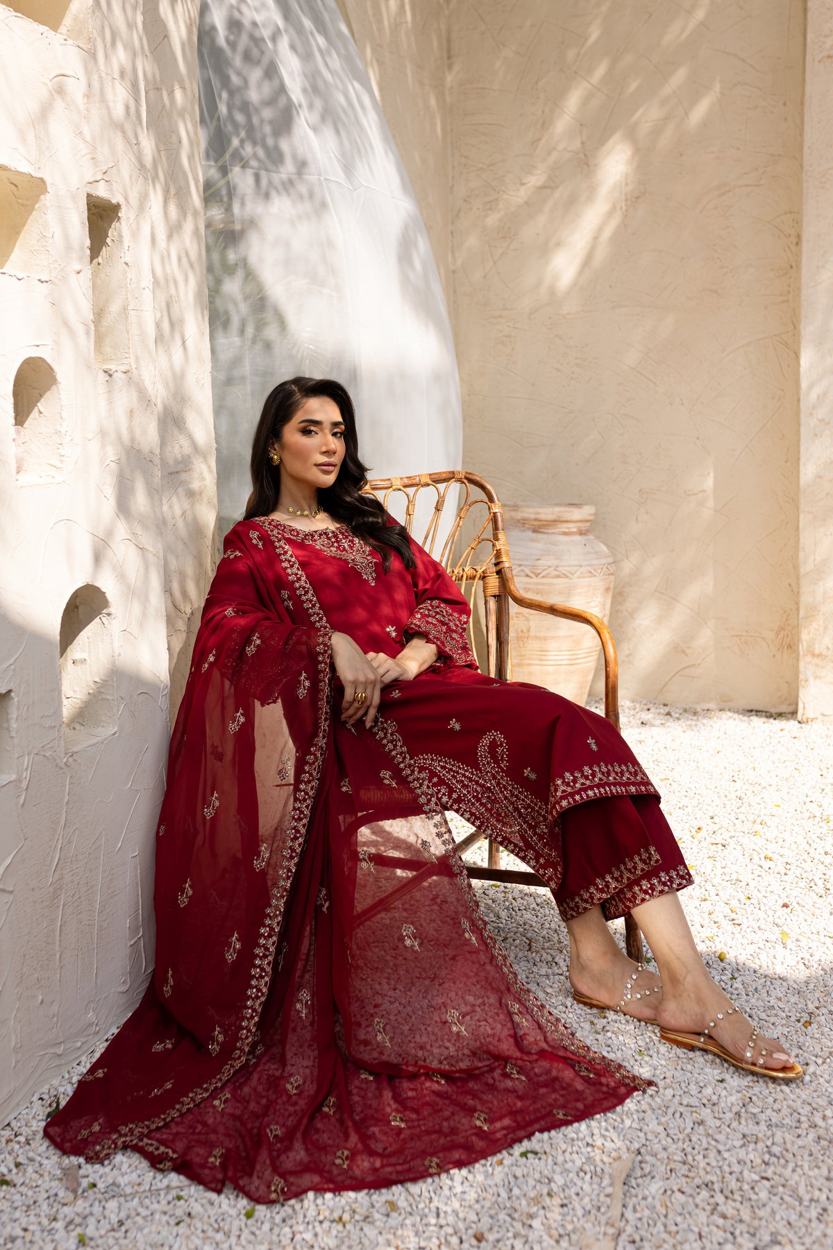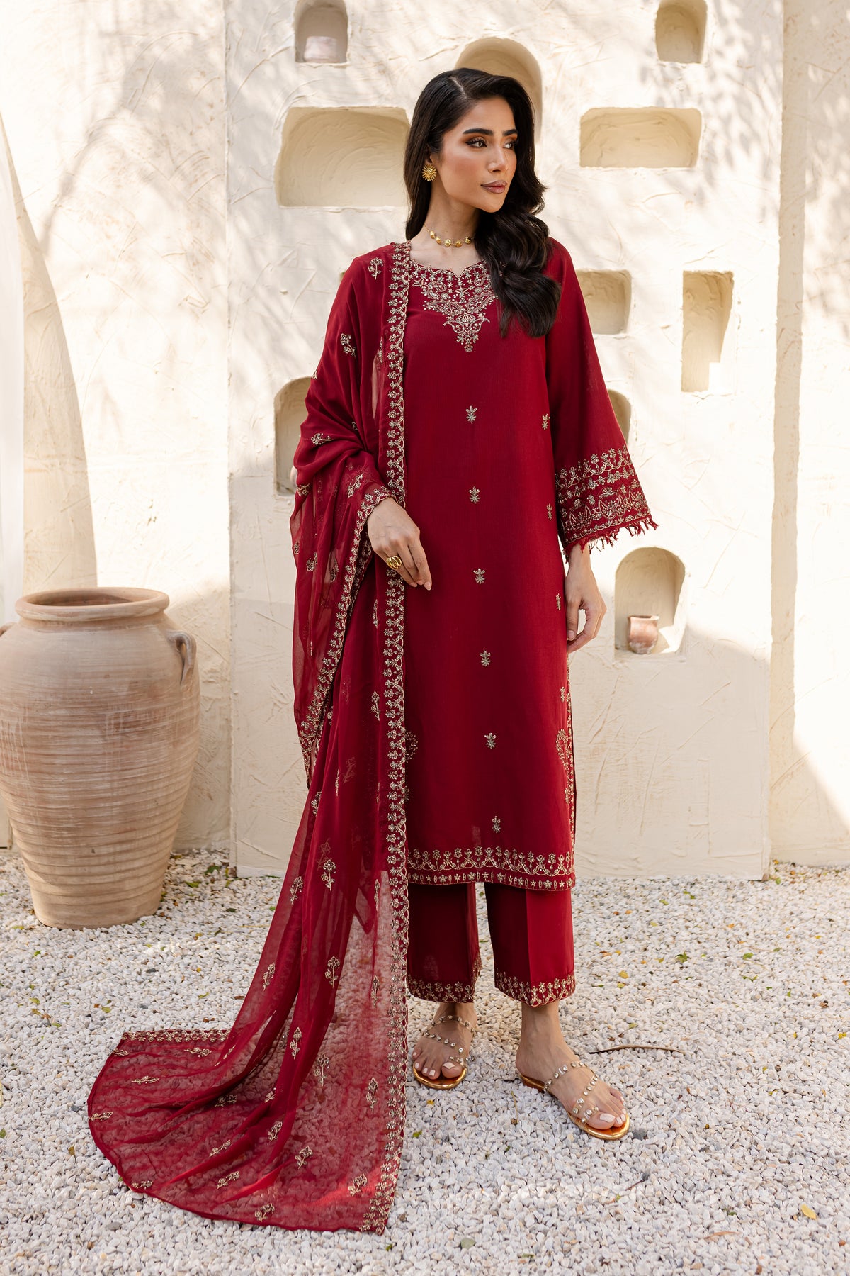 Naaz is an exquisite khaddar ensemble with understated elegance in beet root color. The shirt features a minimalistic neckline but is enriched with heavy embroidery along the hem at the side seams. The front showcases a delicate spread of embroidery, adding a refined touch. The sleeves are also embroidered and finished with a soft fray at the hem for an artistic flair.