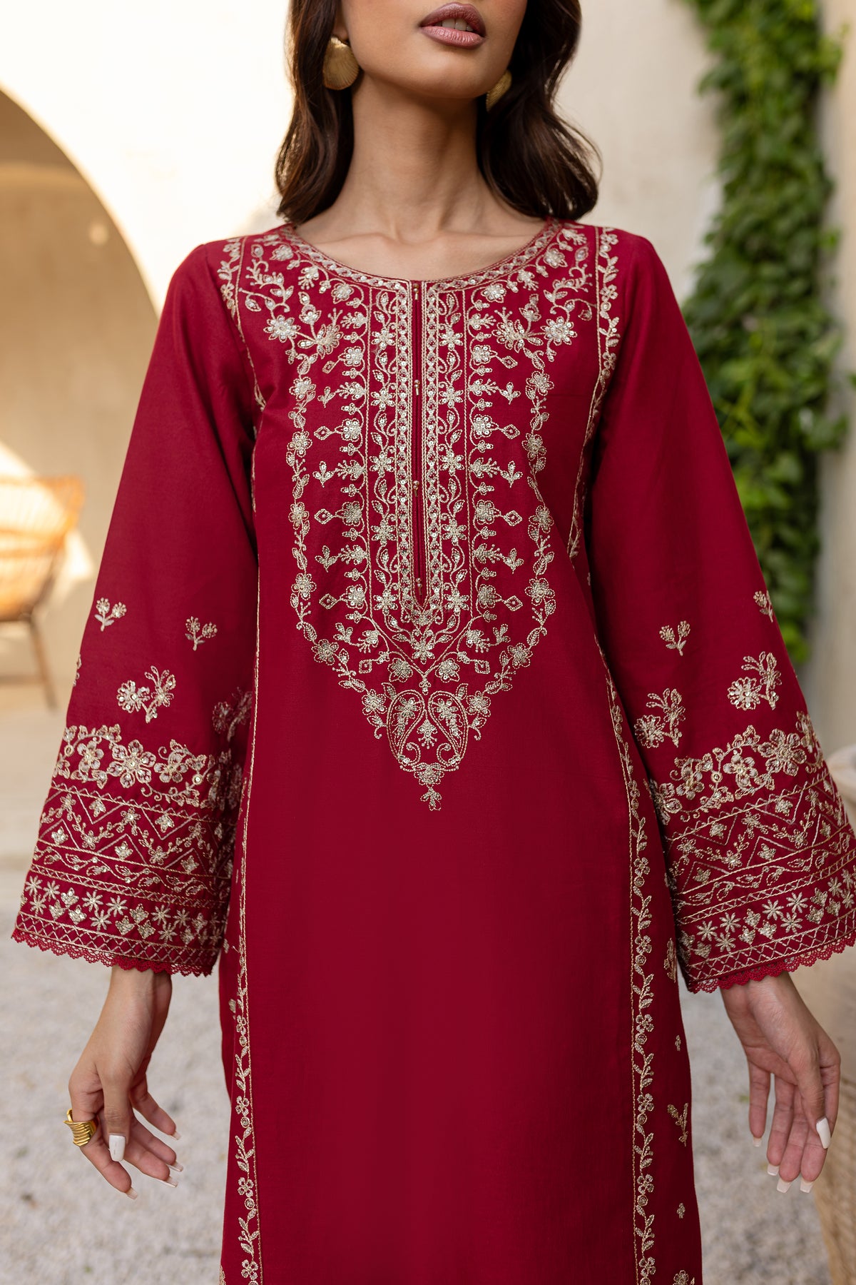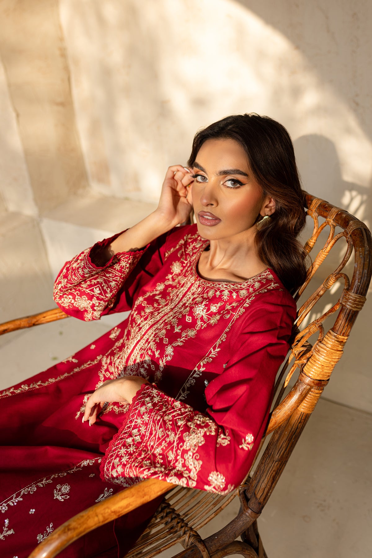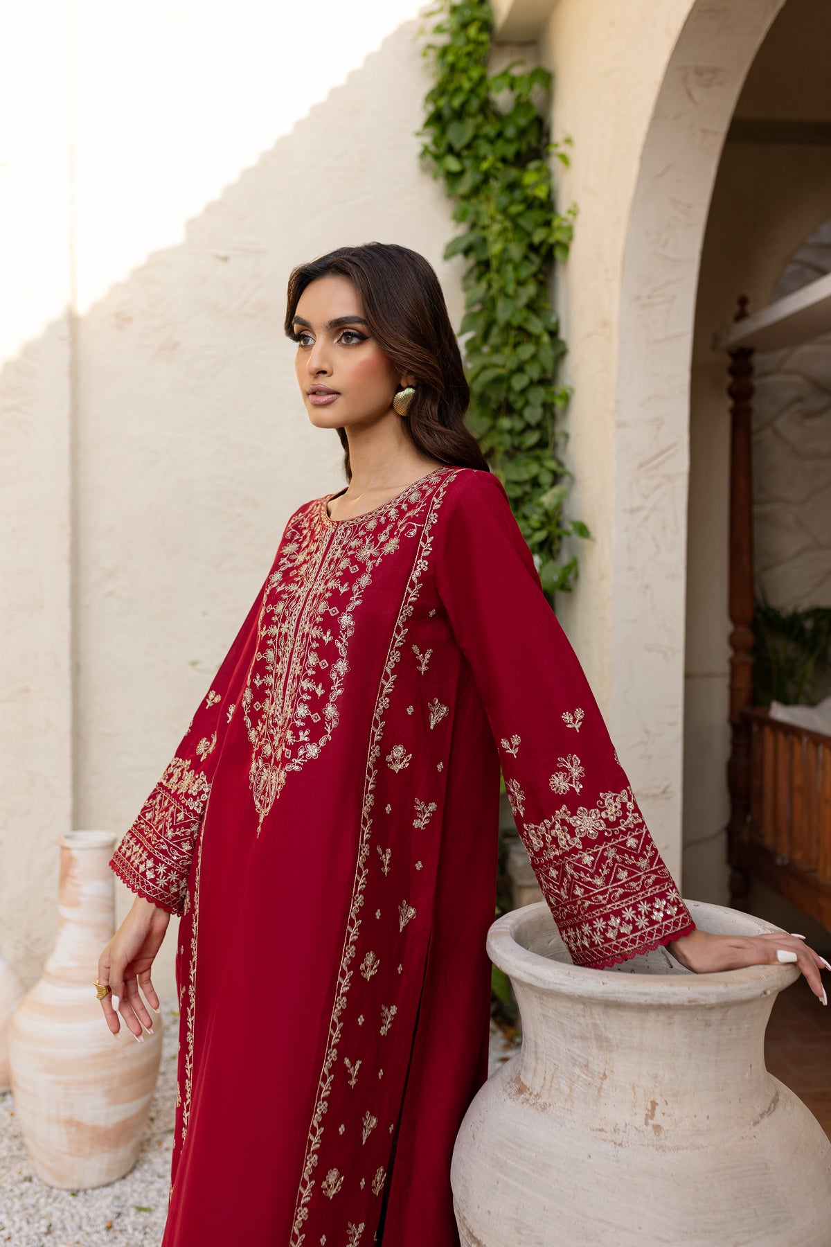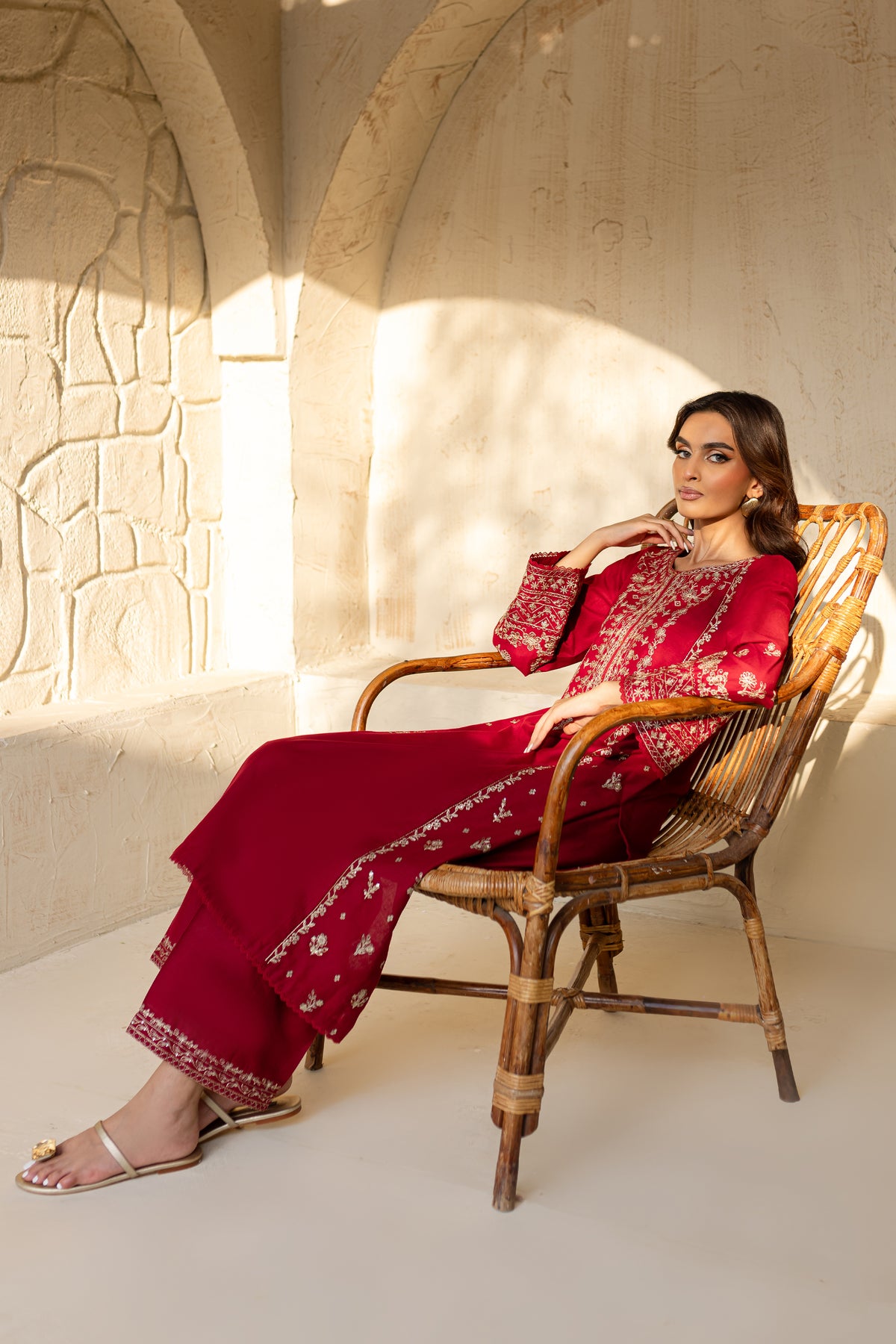 The Red Sea ensemble is a bold, vibrant outfit in red khaddar. The paneled shirt is designed with fully embroidered side panels, giving it a dynamic, structured look. The neckline and sleeves are also embroidered, enhancing the richness of the ensemble.