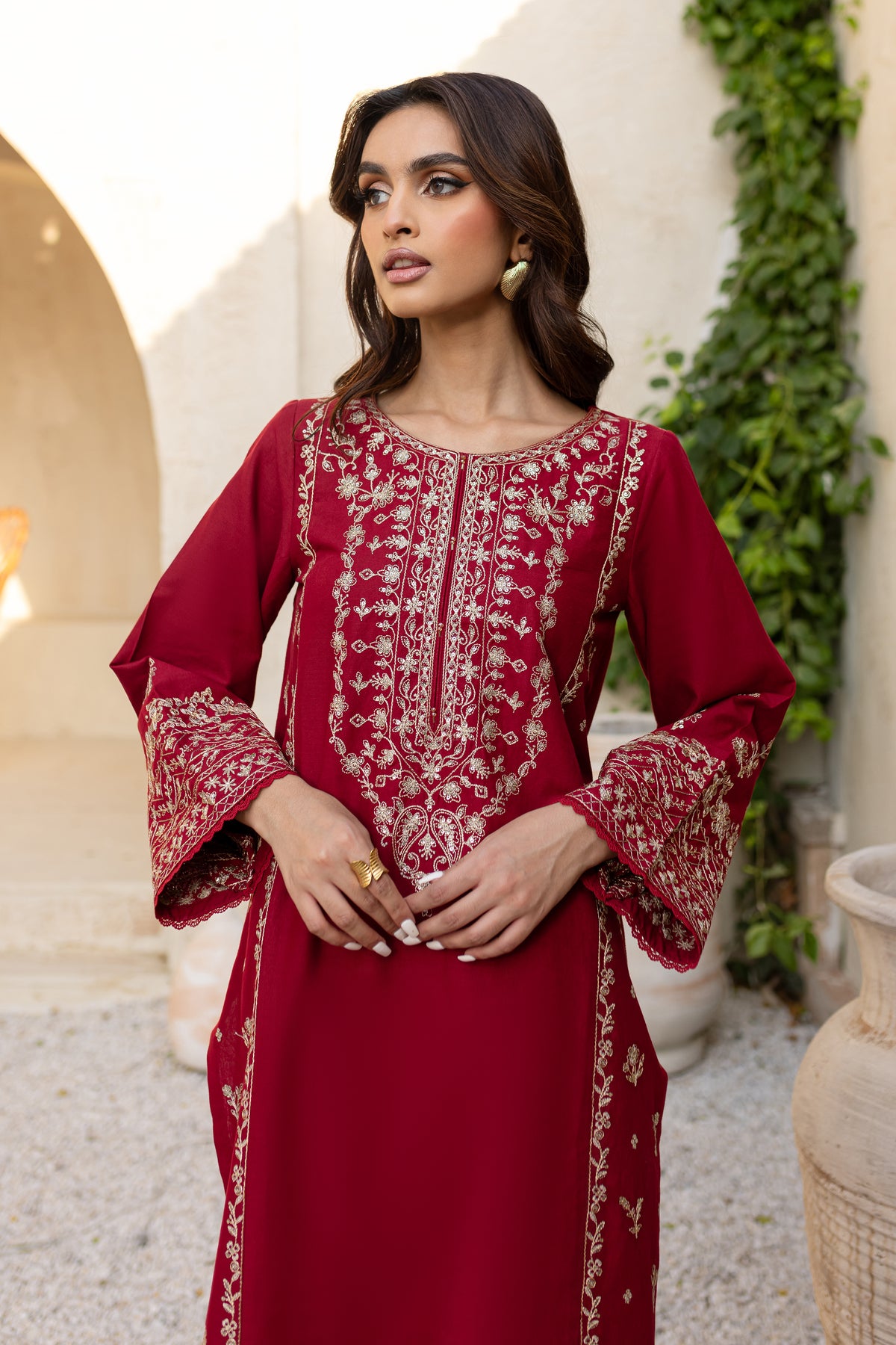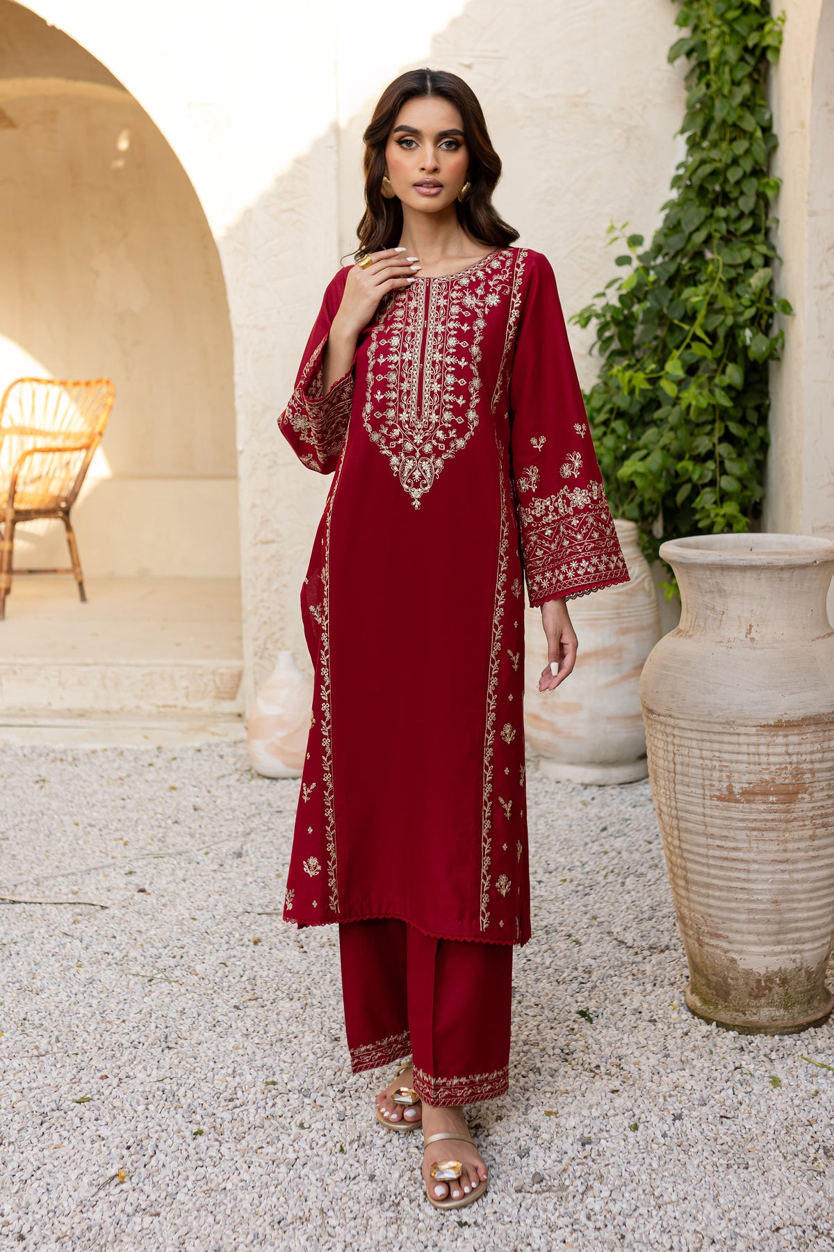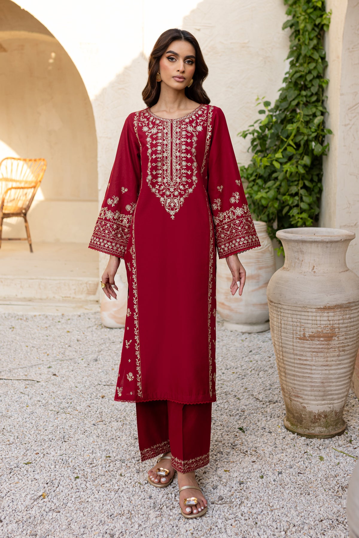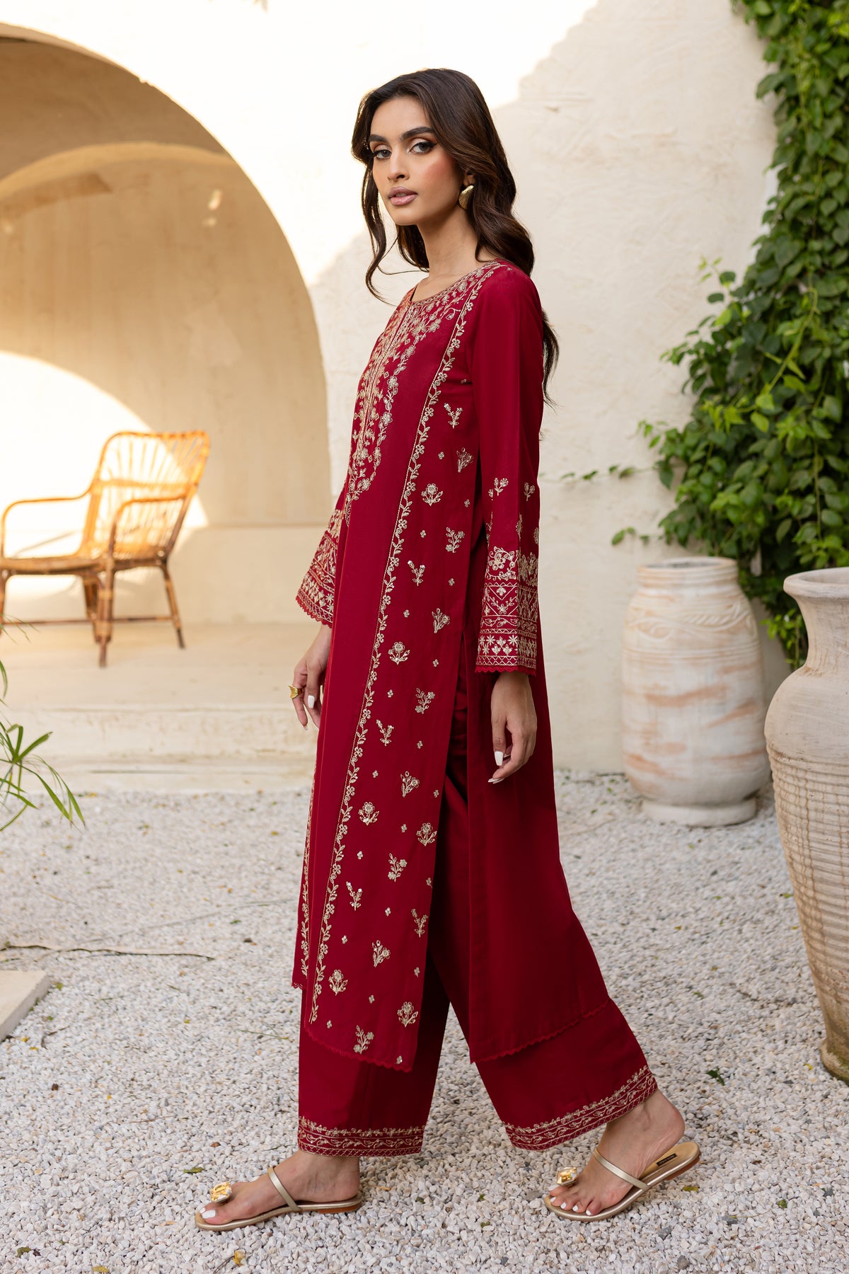 The Red Sea ensemble is a bold, vibrant outfit in red khaddar. The paneled shirt is designed with fully embroidered side panels, giving it a dynamic, structured look. The neckline and sleeves are also embroidered, enhancing the richness of the ensemble.