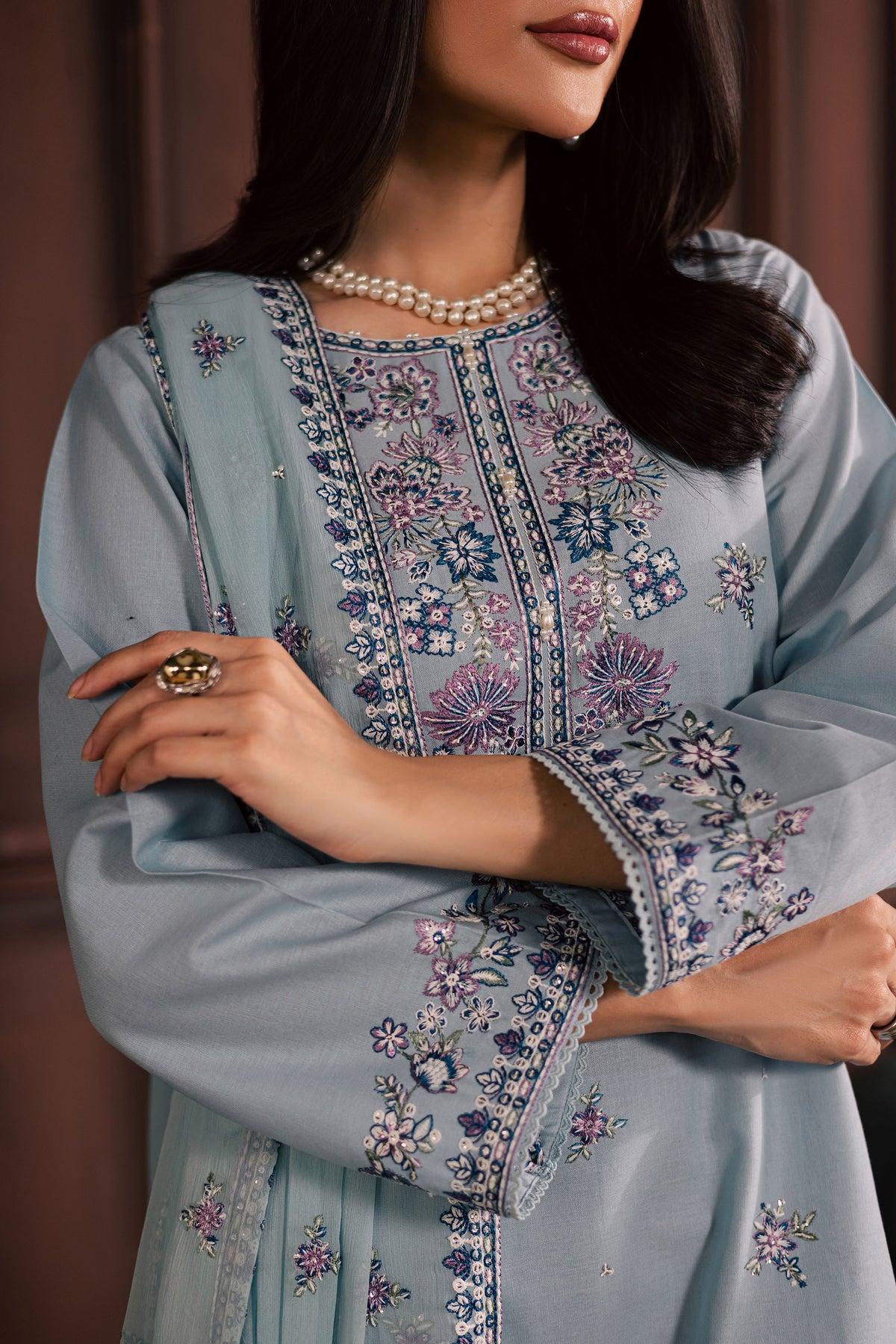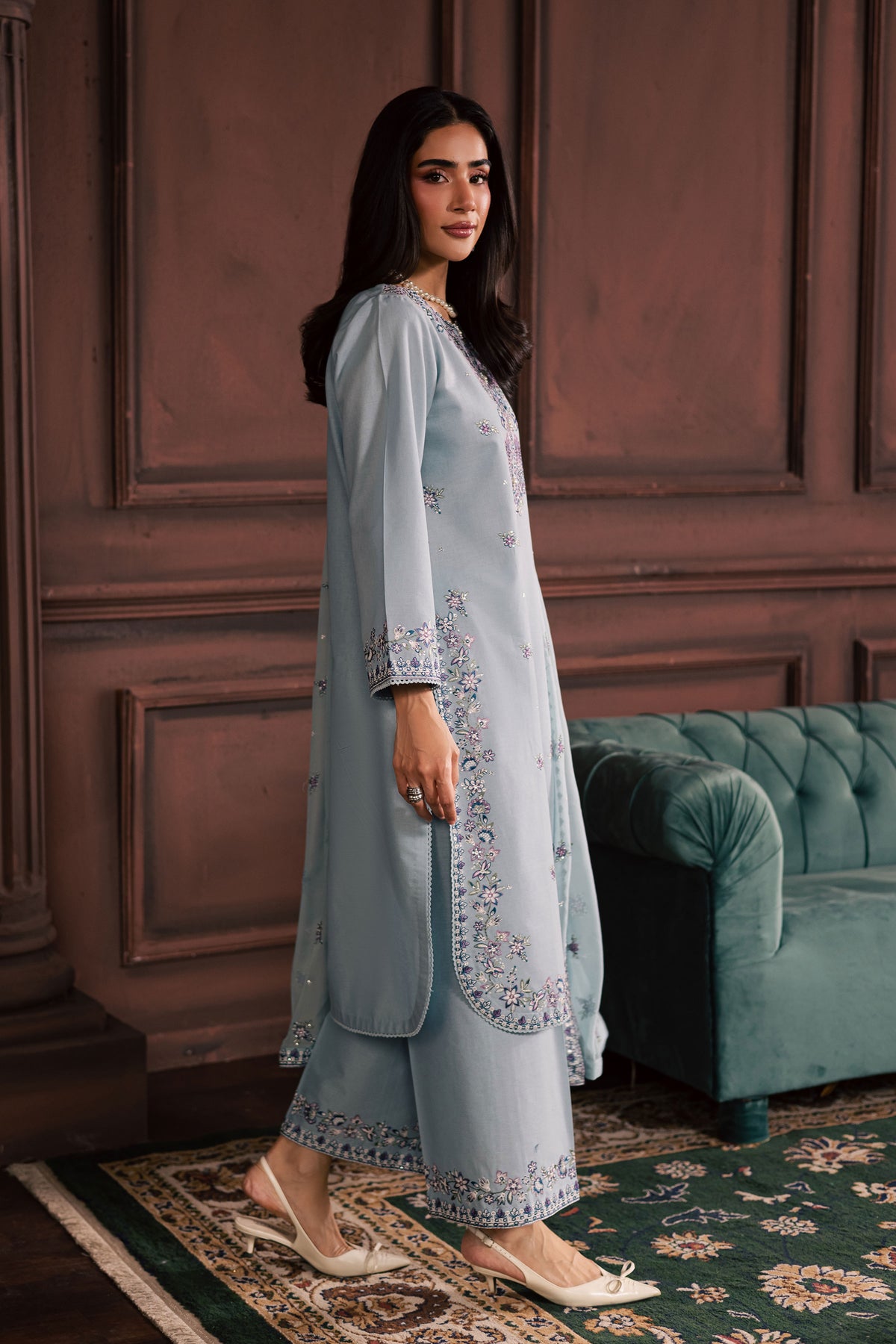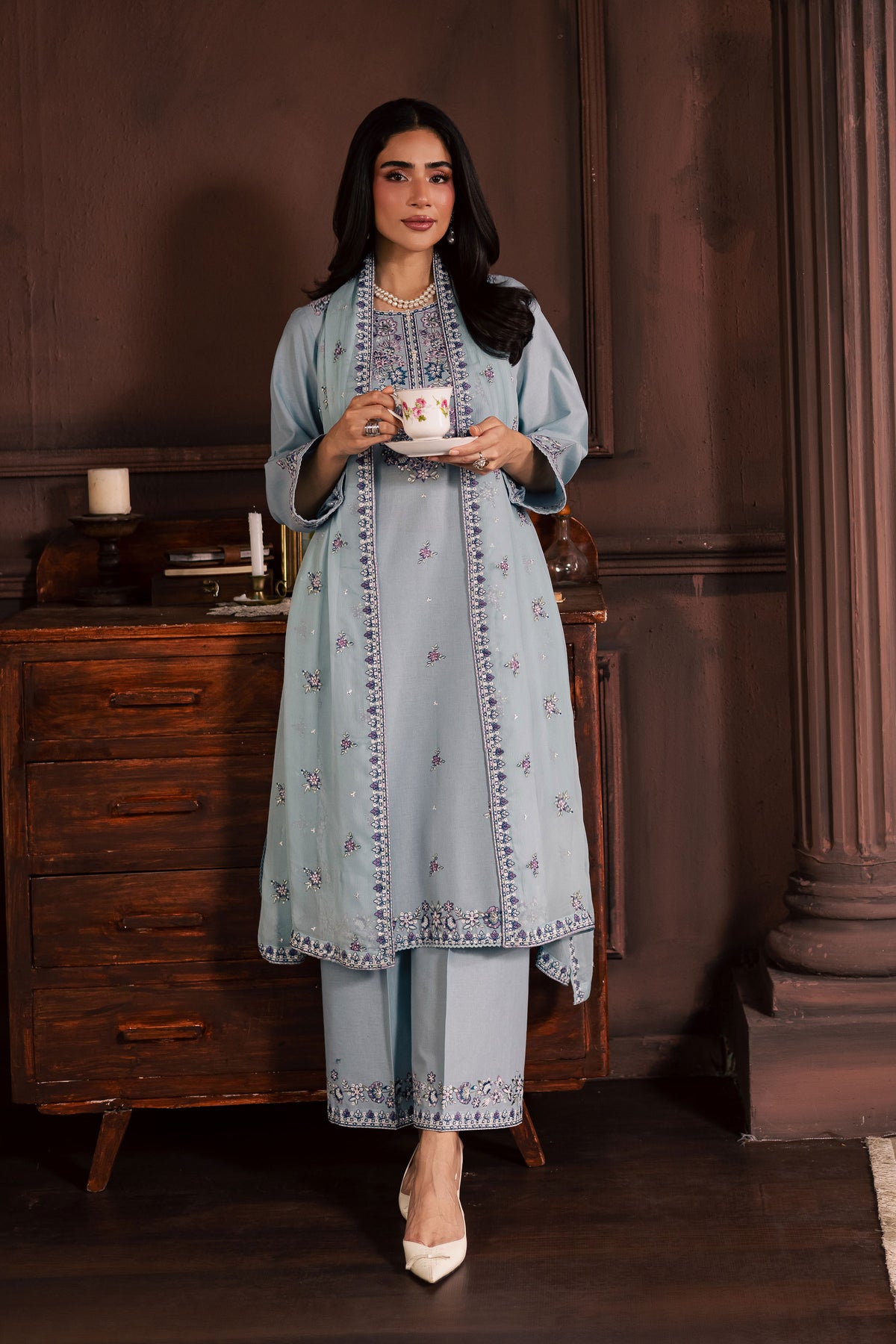 Bring refined elegance to your winter wardrobe with this khaddar three piece ensemble. The embroidered panelled shirt features a detailed neckline and embroidery extending to the hem and chaaks, while the sleeves are fully embroidered, adding richness and sophistication to the outfit.
