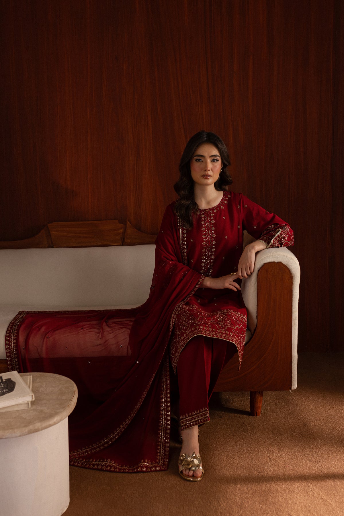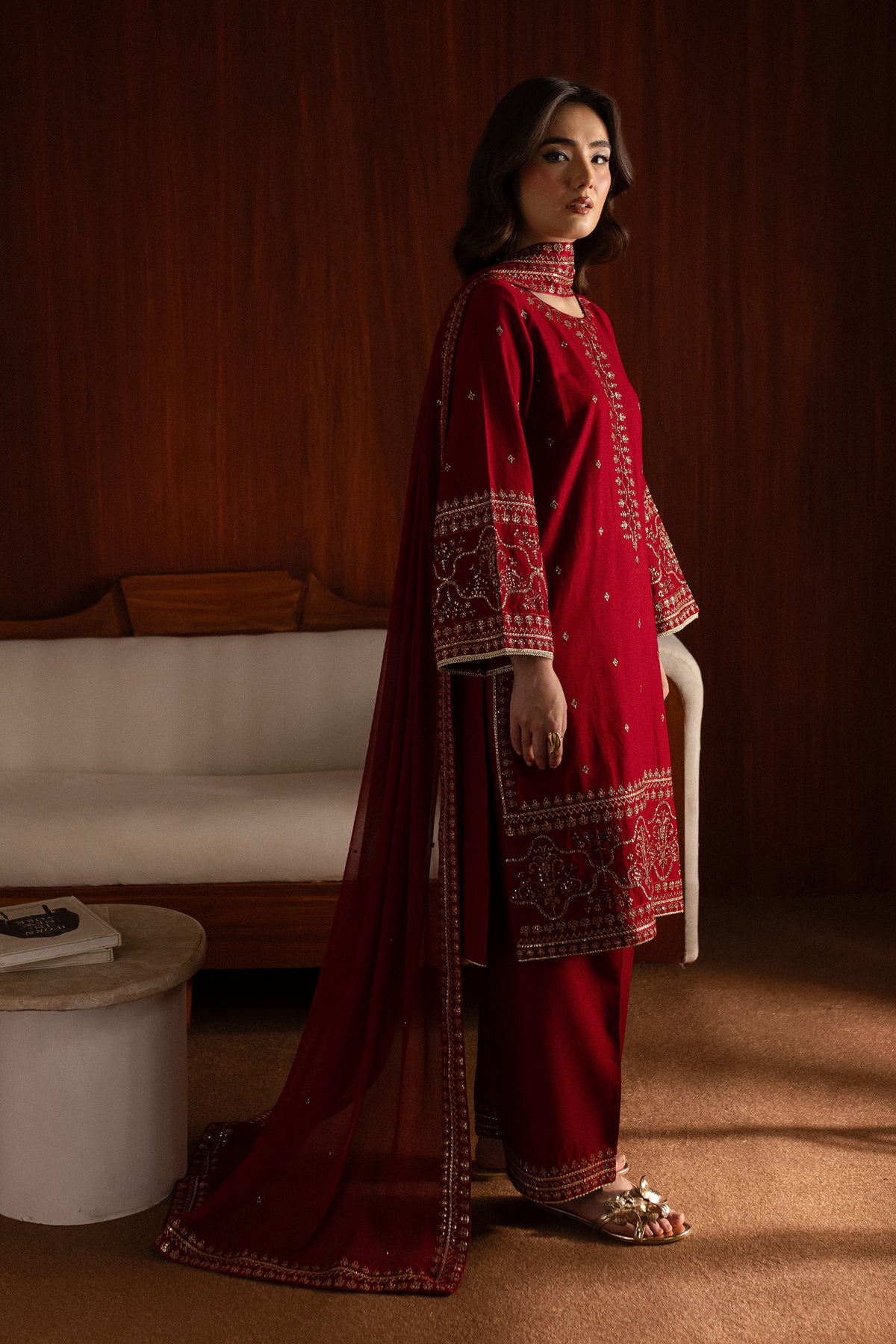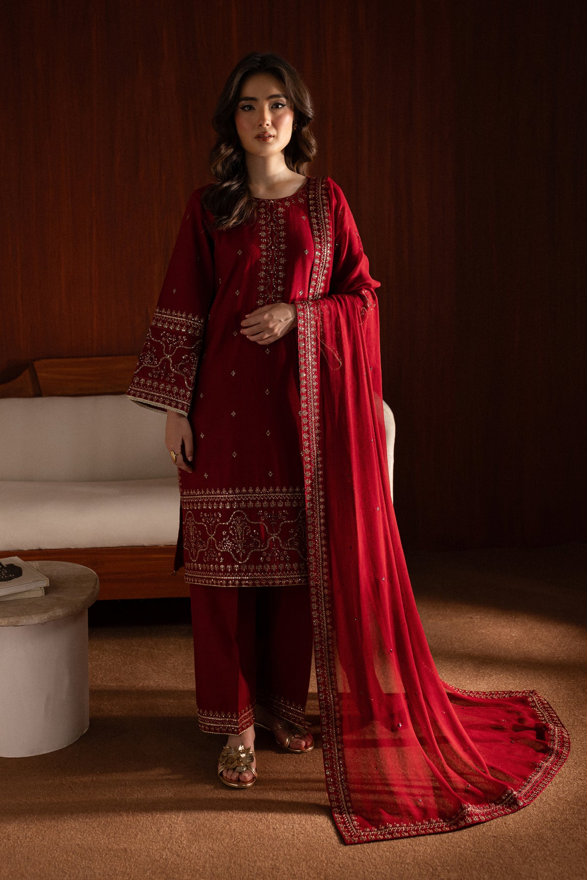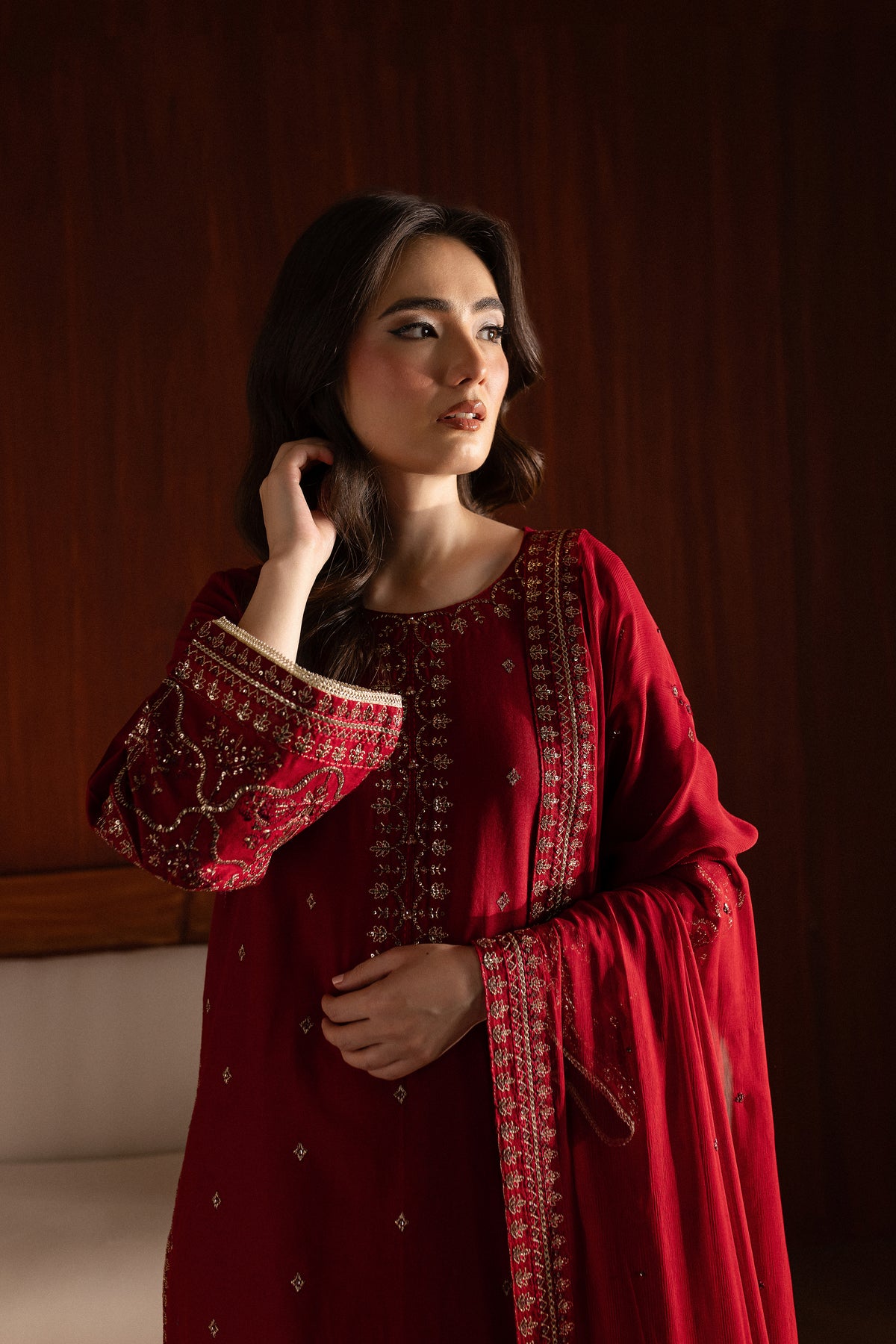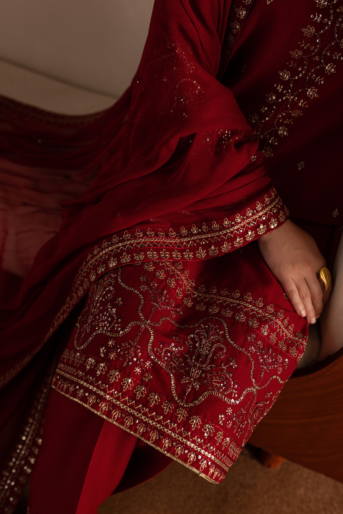 The chiffon dupatta is embroidered with a subtle spread and minimal borders on all four sides, offering a light yet intricate touch.