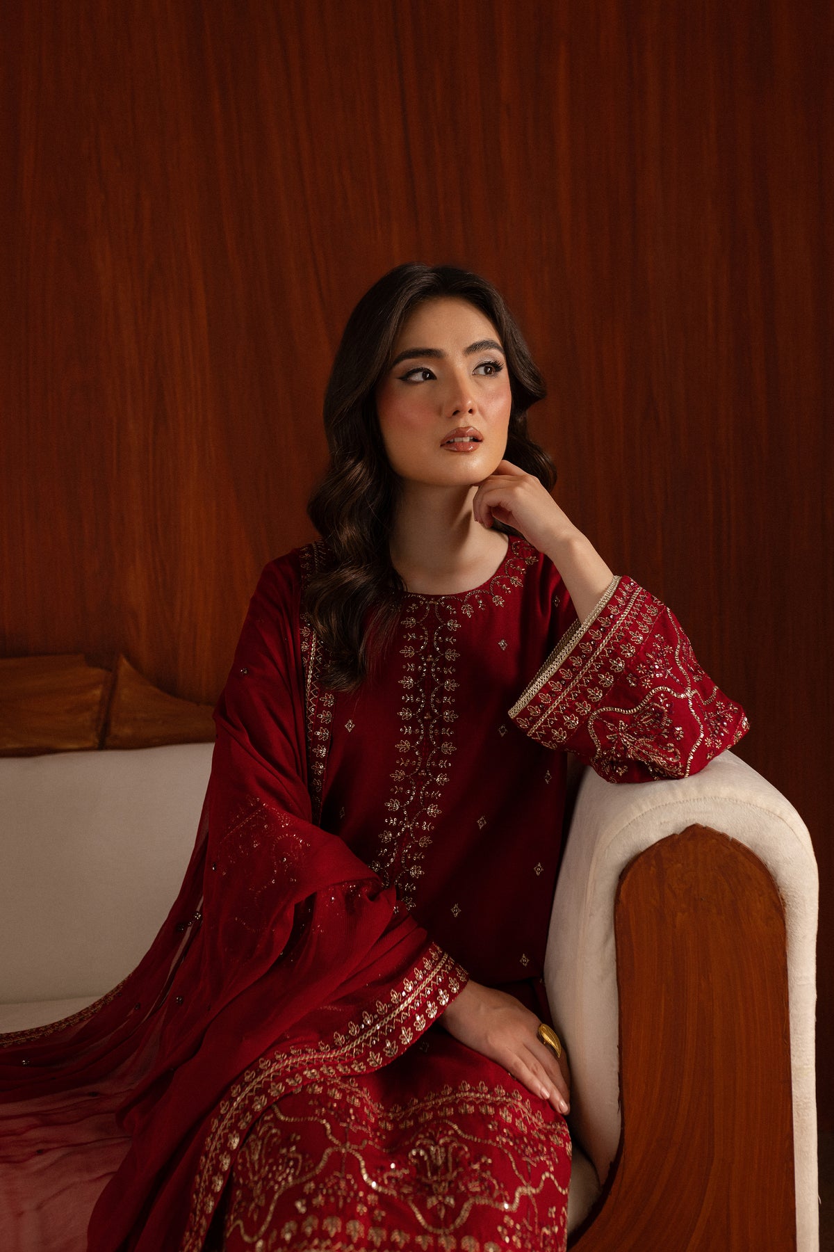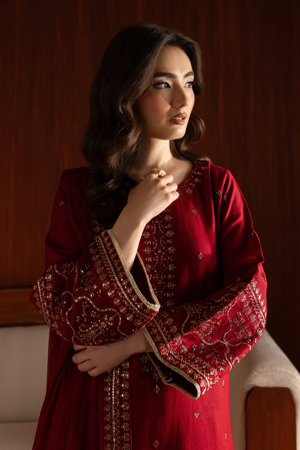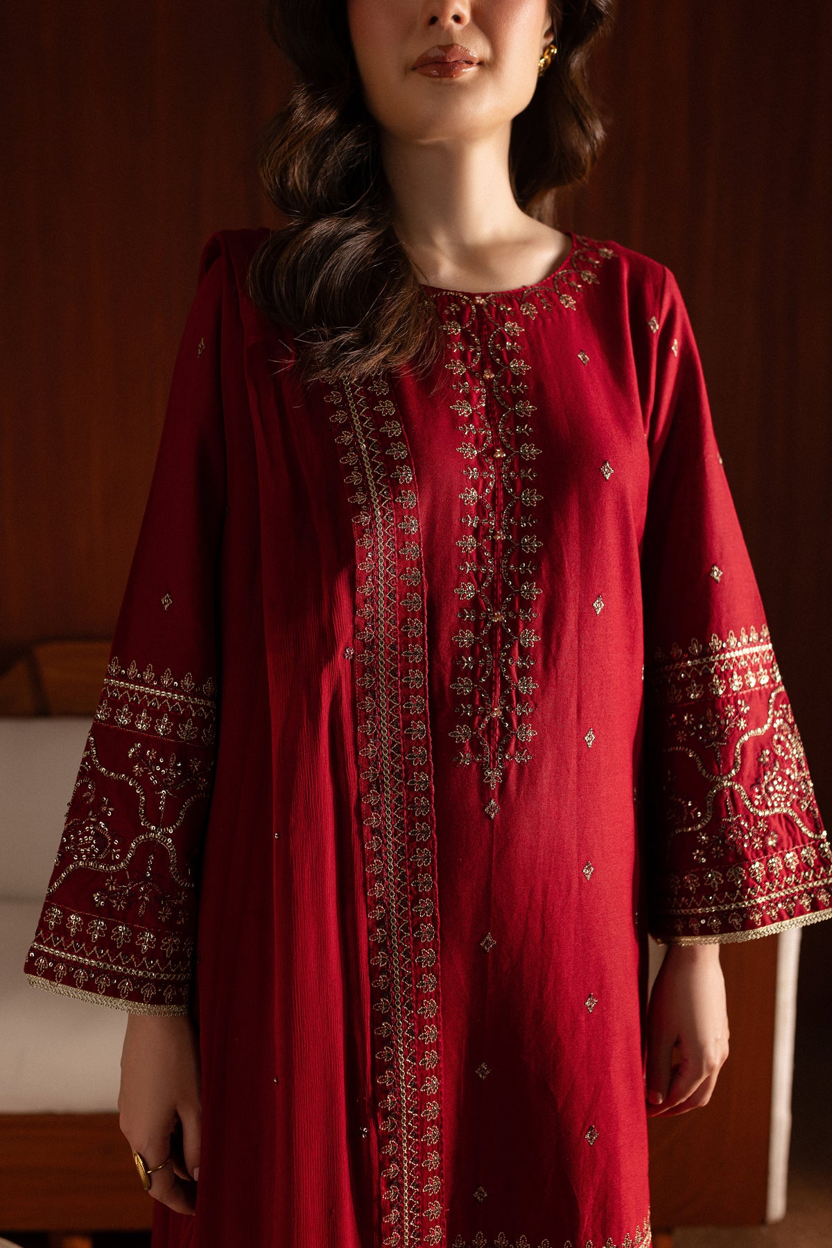 The khaddar shirt in red hue features a composed embroidered neckline, square motif spread, and a bordered hem. The side seams are adorned with embroidery, while the bell sleeves are finished with lace details.