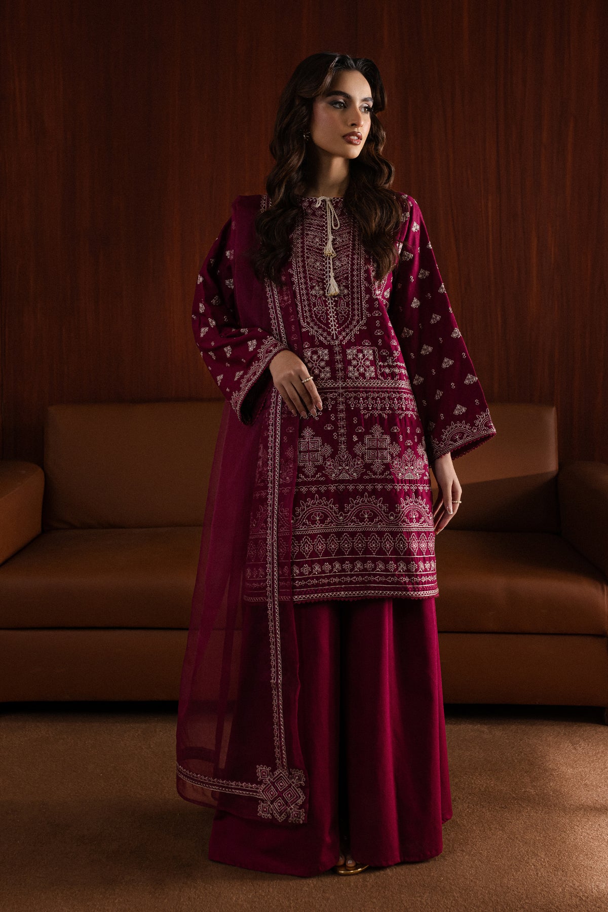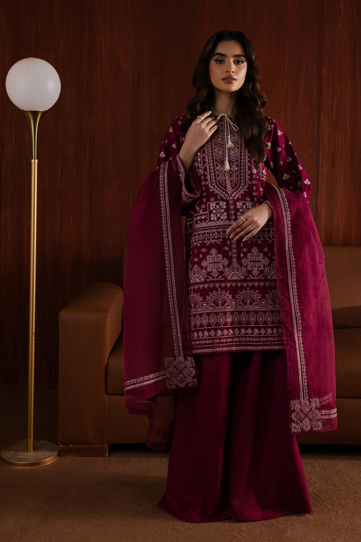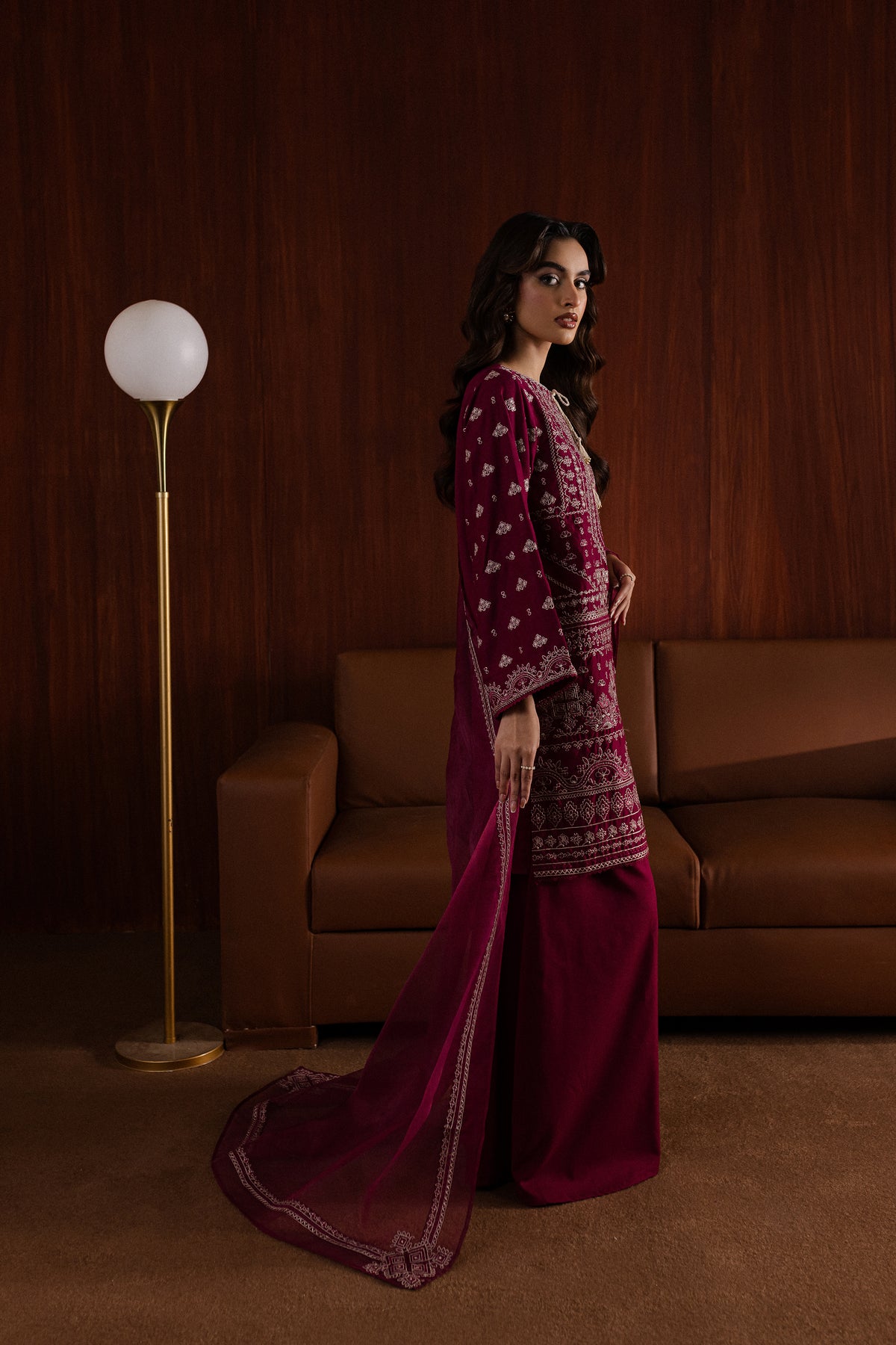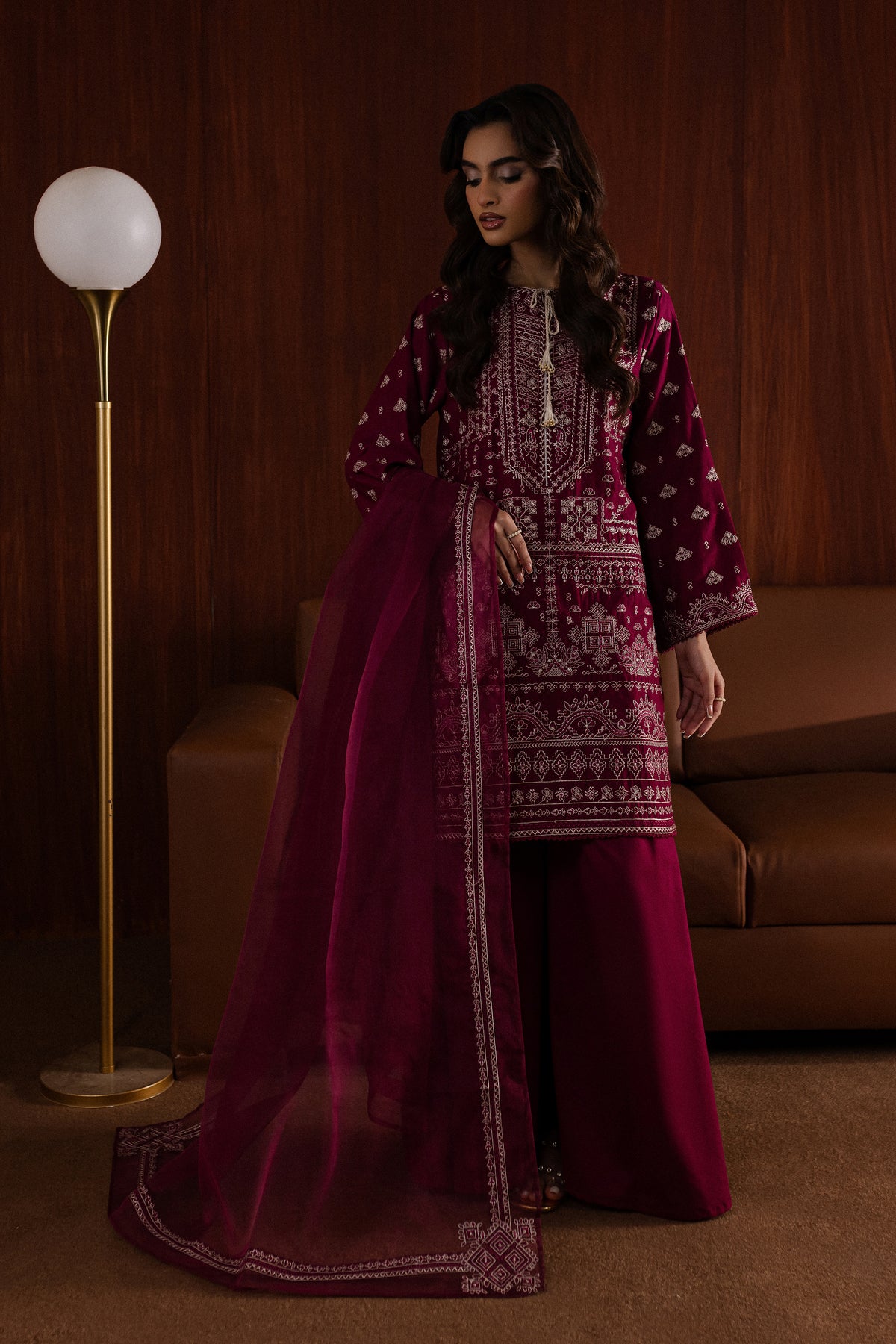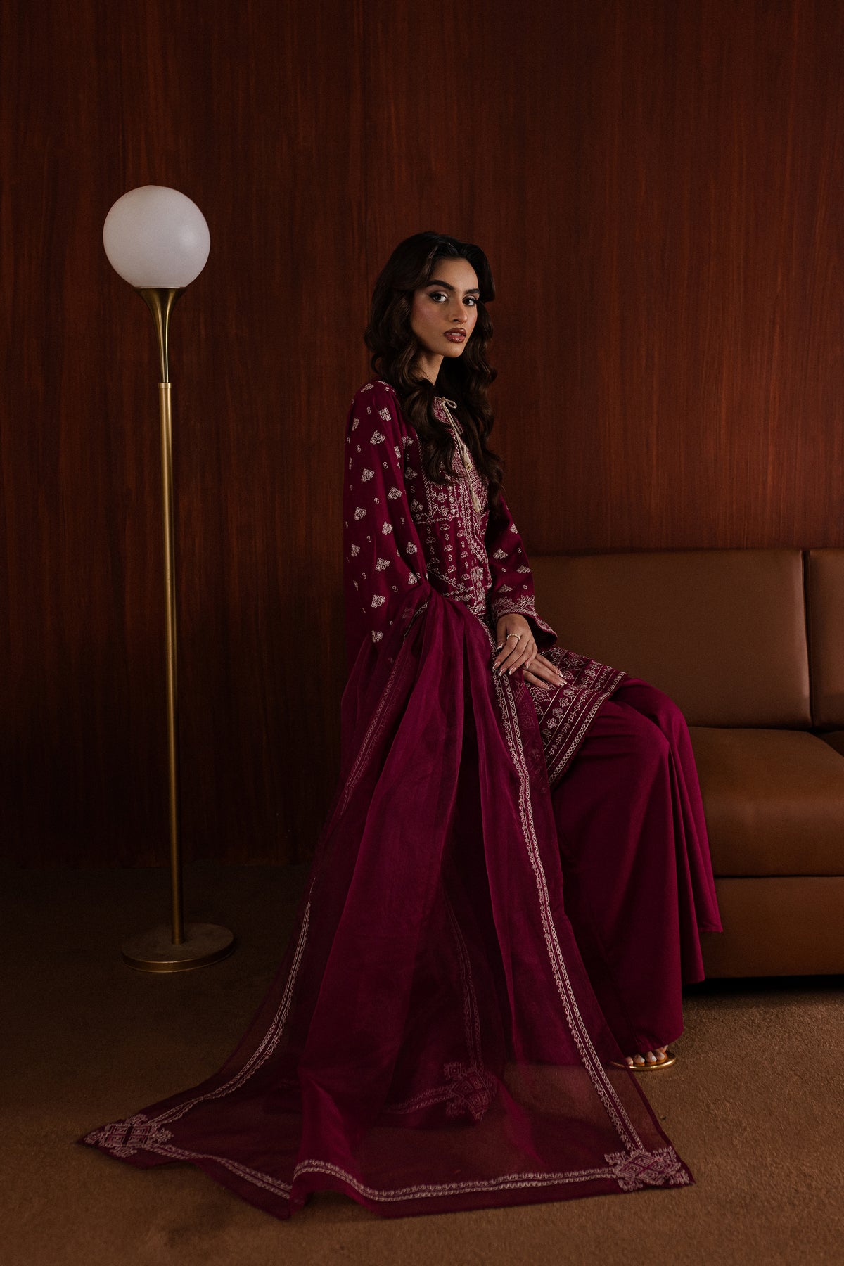 The organza dupatta is embroidered along the borders, offering a lightweight yet luxurious addition to the outfit.