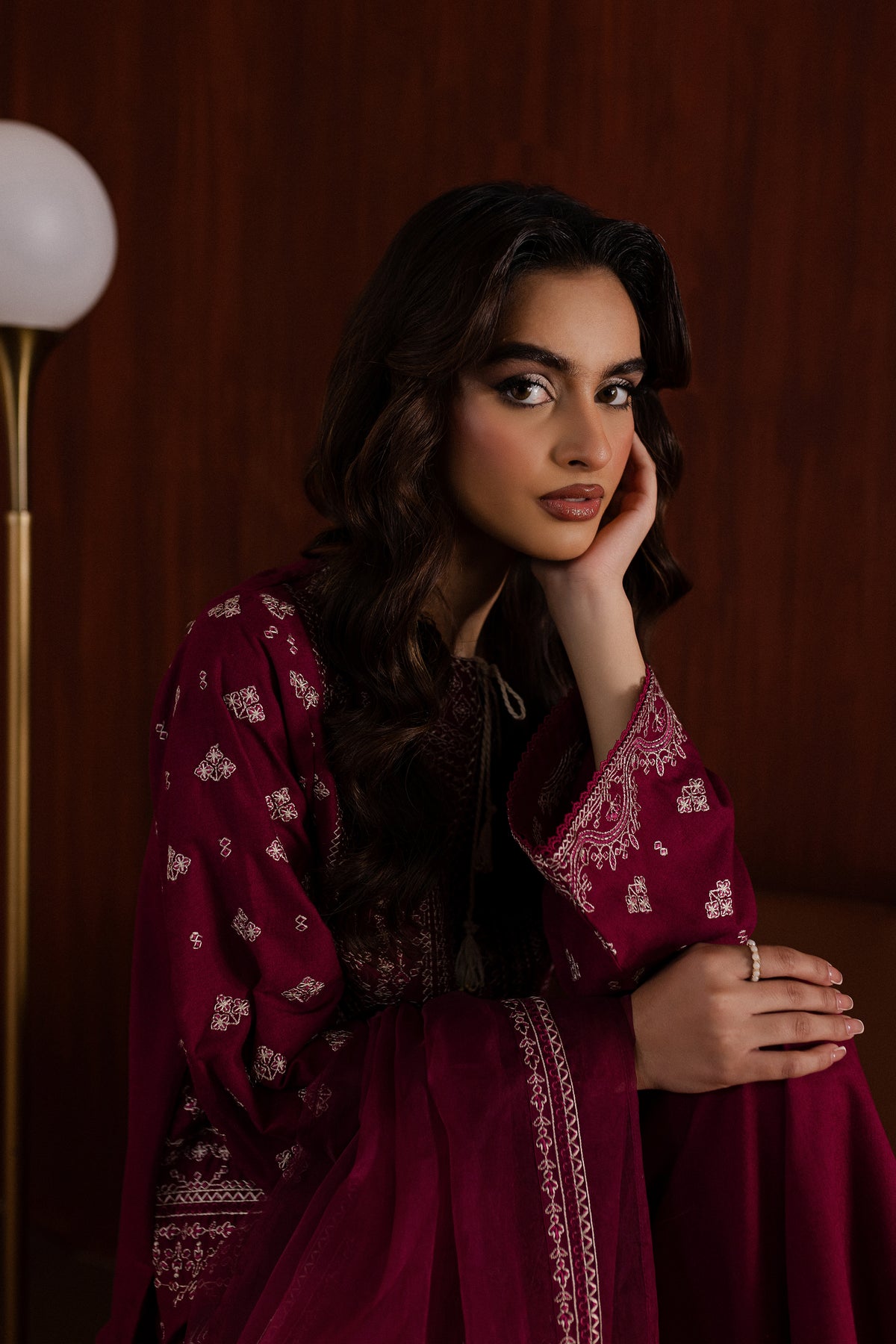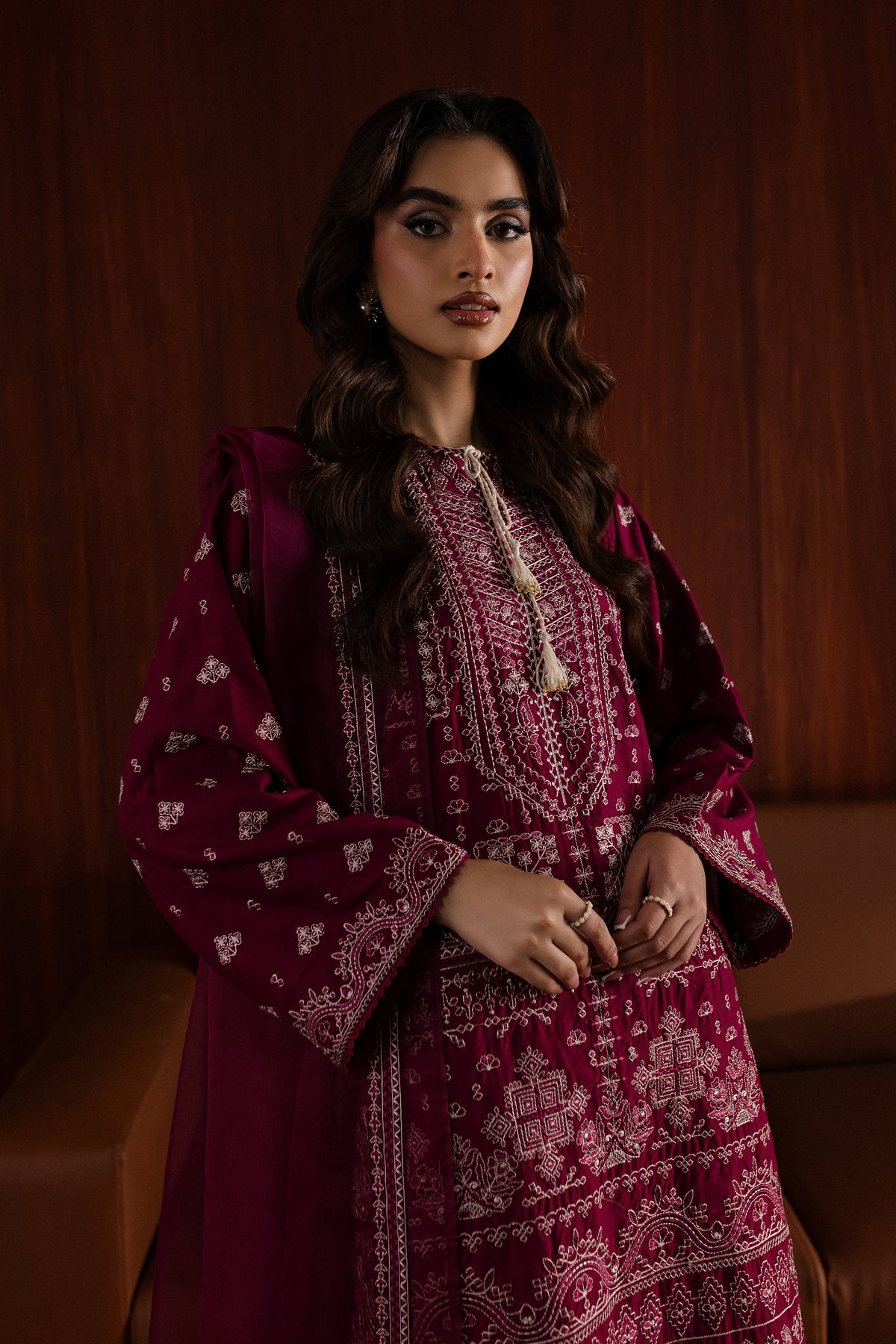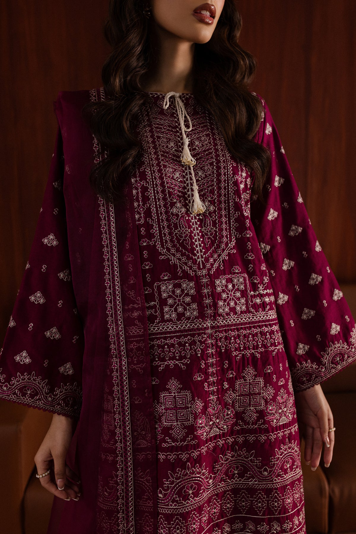 The karandi shirt in raspberry hue is fully composed with intricate embroidery and contrasting thread. The hem is finished with crochet lace, while the flared sleeves are designed with delicate embroidery for a festive touch.